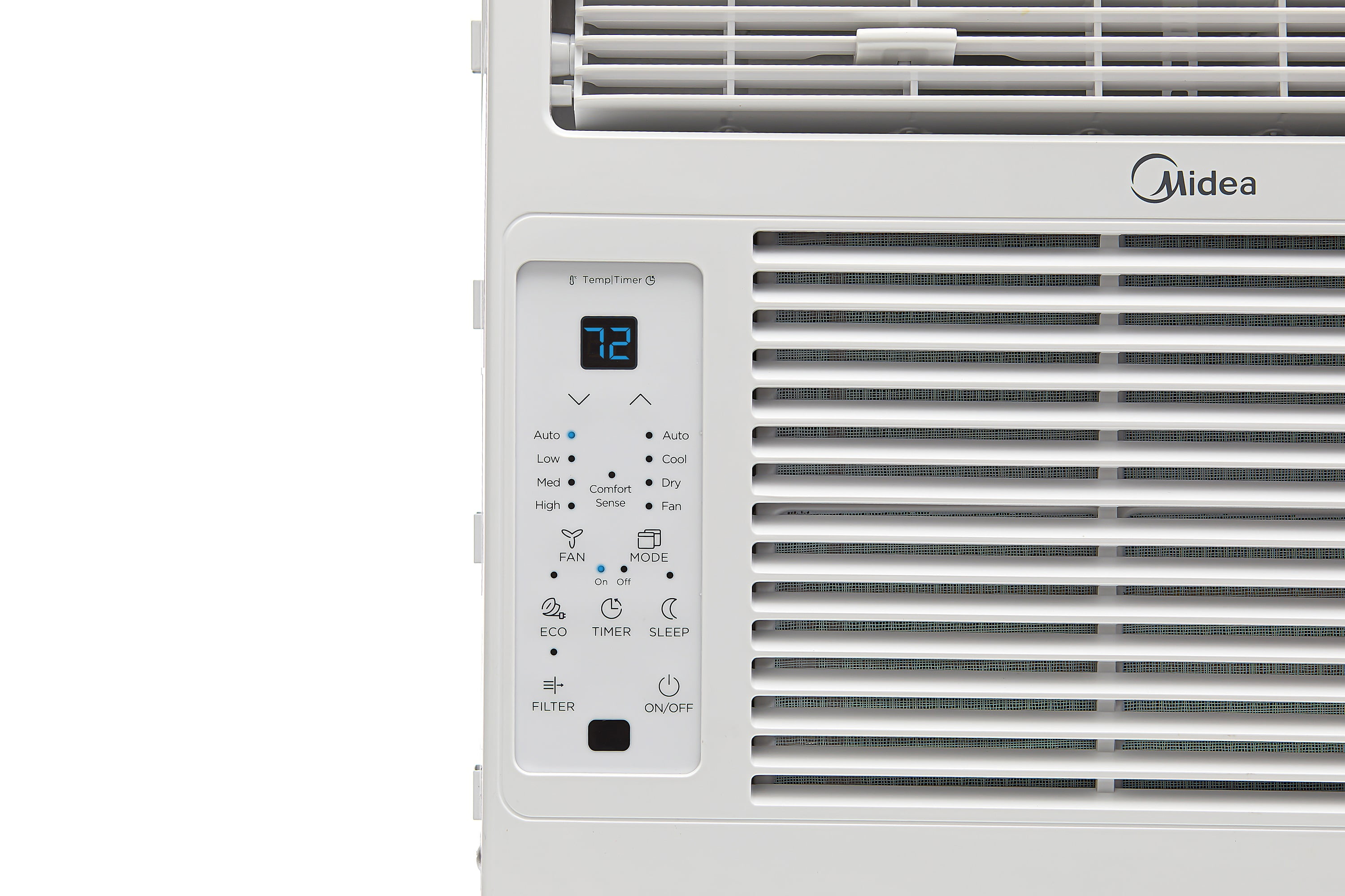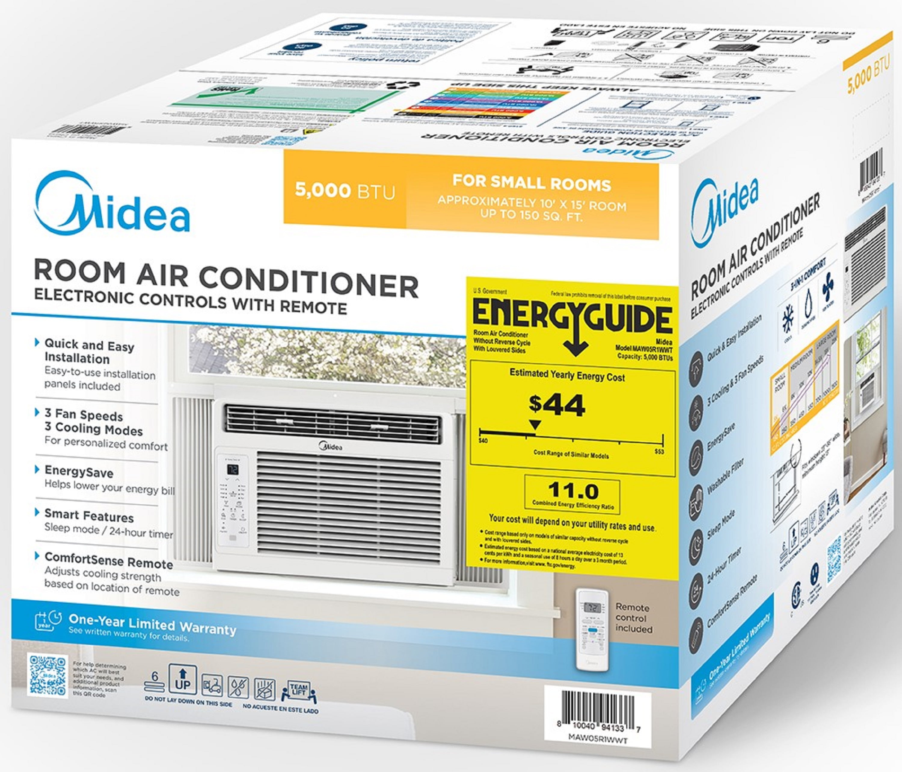 - Midea 5,000 BTU 115V Window Air Conditioner with ComfortSense Remote, Up to 150 sq ft Coverage Area, White, MAW05R1WWT-T