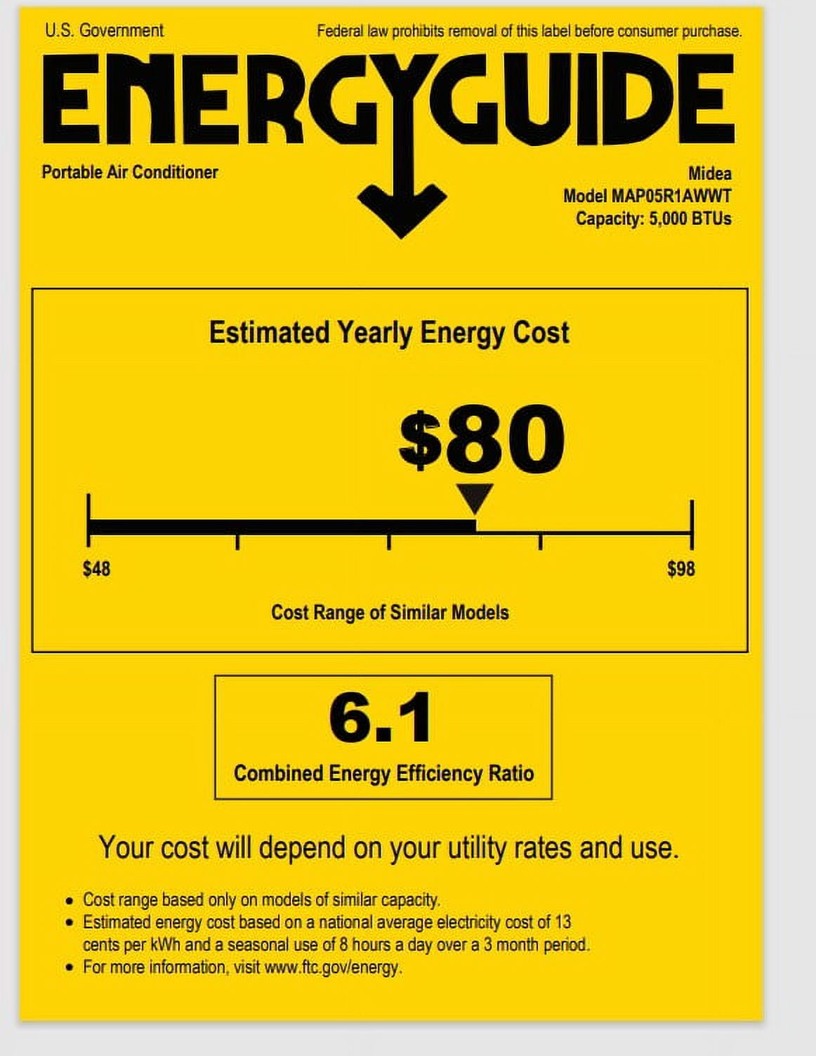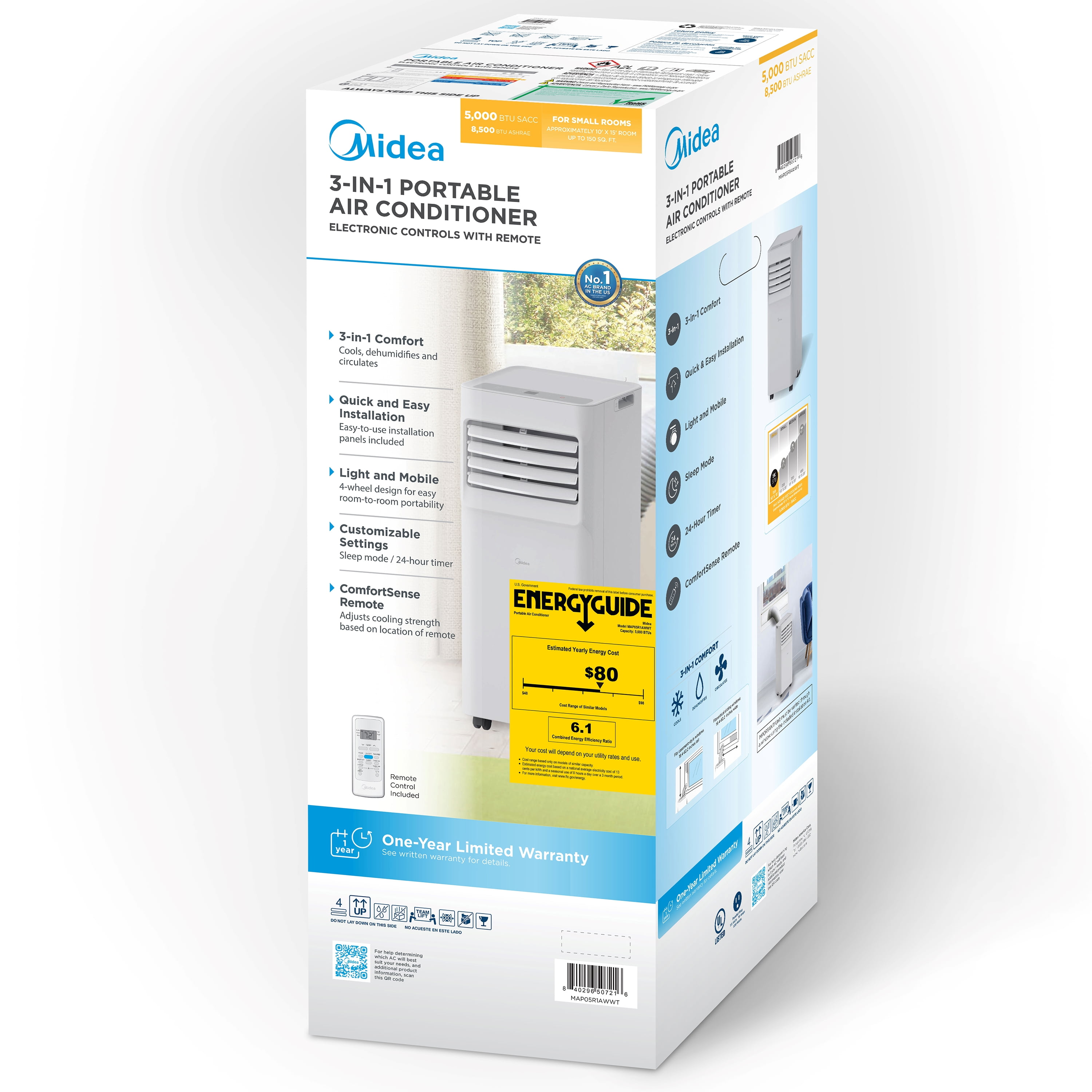 - Midea 5,000 BTU (8,000 BTU ASHRAE) 115V Portable Air Conditioner with Remote, Covers up to 150 Sq. ft., MAP05R1AWWT-T, White