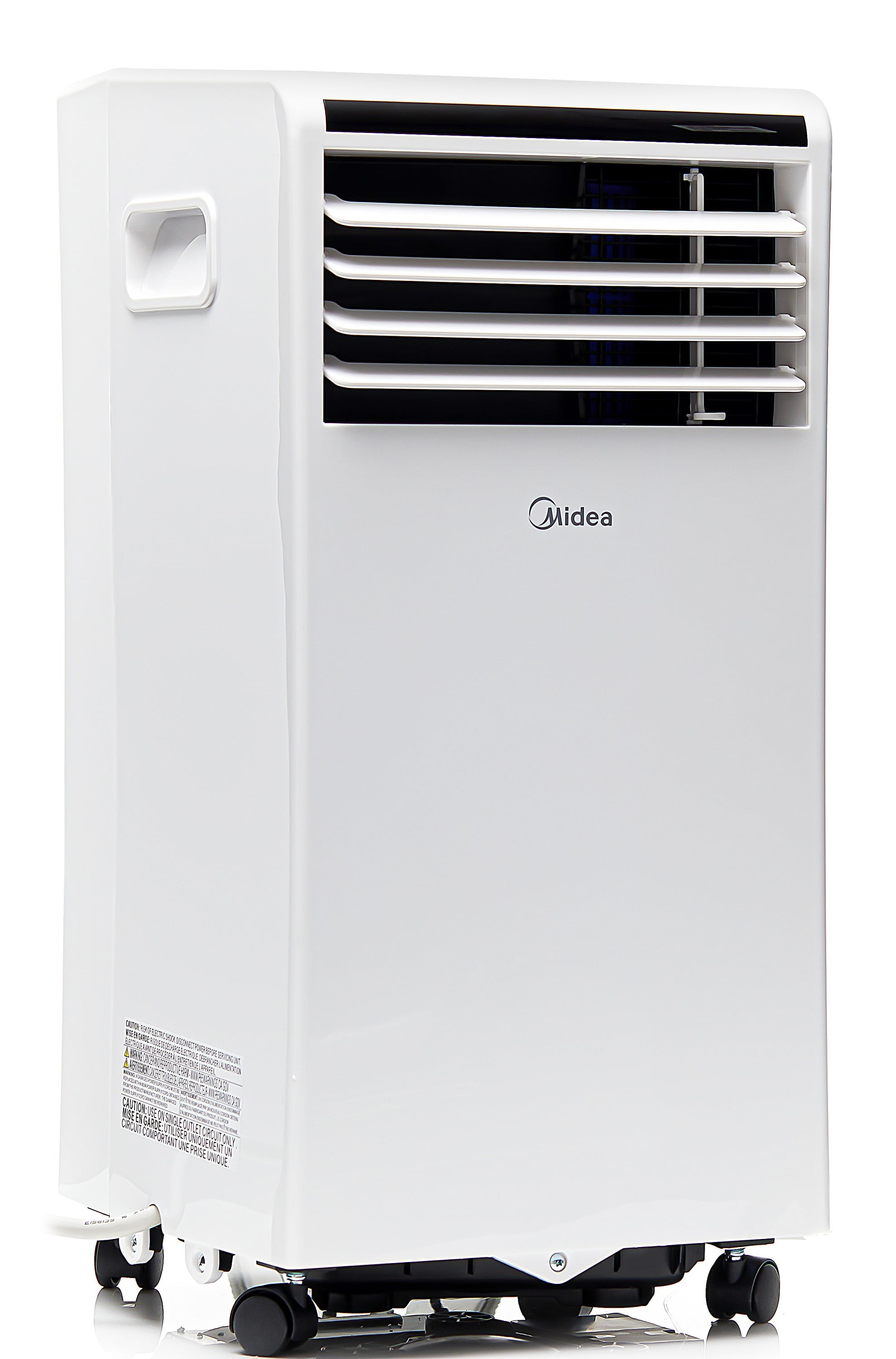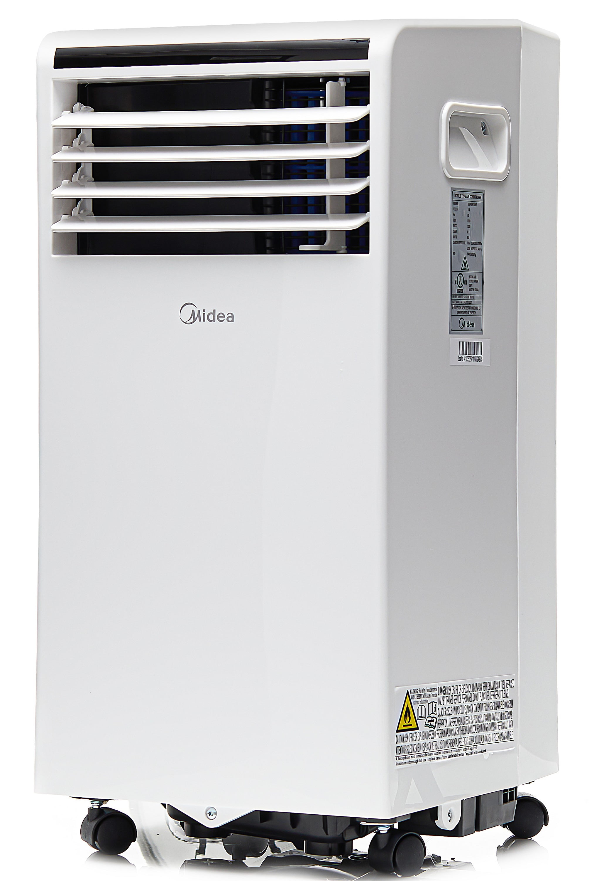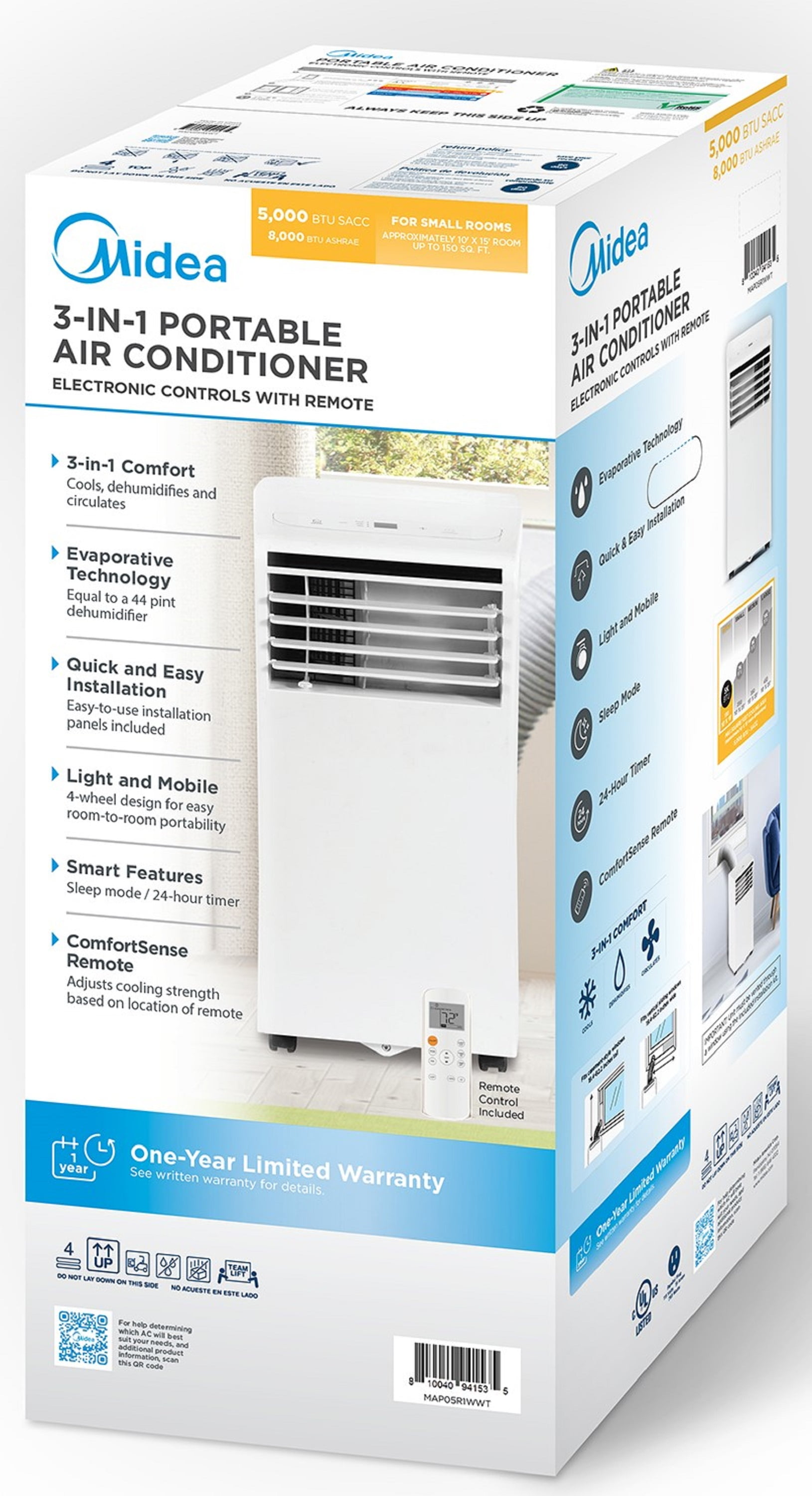 Midea 5,000 BTU (8,000 BTU ASHRAE) 115V Portable Air Conditioner with Comfort Sense Remote, Cools up to 150 Sq. ft., MAP05R1WWT, New Needs to be vented outside 3-in-1 Comfort: Keeps you cool during hot summer days with 3 different functions; Cools, Circulates, & Dehumidifies. Designed for Smaller Spaces: Ideal for cooling spaces up to 150 sq. ft. Comfort Sense Remote: Comfort Sense Remote lets you control the room temperature by adjusting the cooling strength based on the location of the remote Smart Features: Equipped with sleep mode and a programmable 24-hour time Light & Mobile: 4-wheel design lets you move it from room to room Quick & Easy Installation: Includes a quick and easy window installation kit Min. /Max. Window Opening Width (in): Minimum window opening width: 26.5 inches. Maximum Window opening width: 49 inches Min. Window Opening Height (in): Minimum window opening height of 6.4 inches Power Source Details: 115V, 15 AMPS, 793 WATTS Trusted AC Brand: Midea brand named #1 AC brand in the US according to Circana/Retail tracking service data for 2022