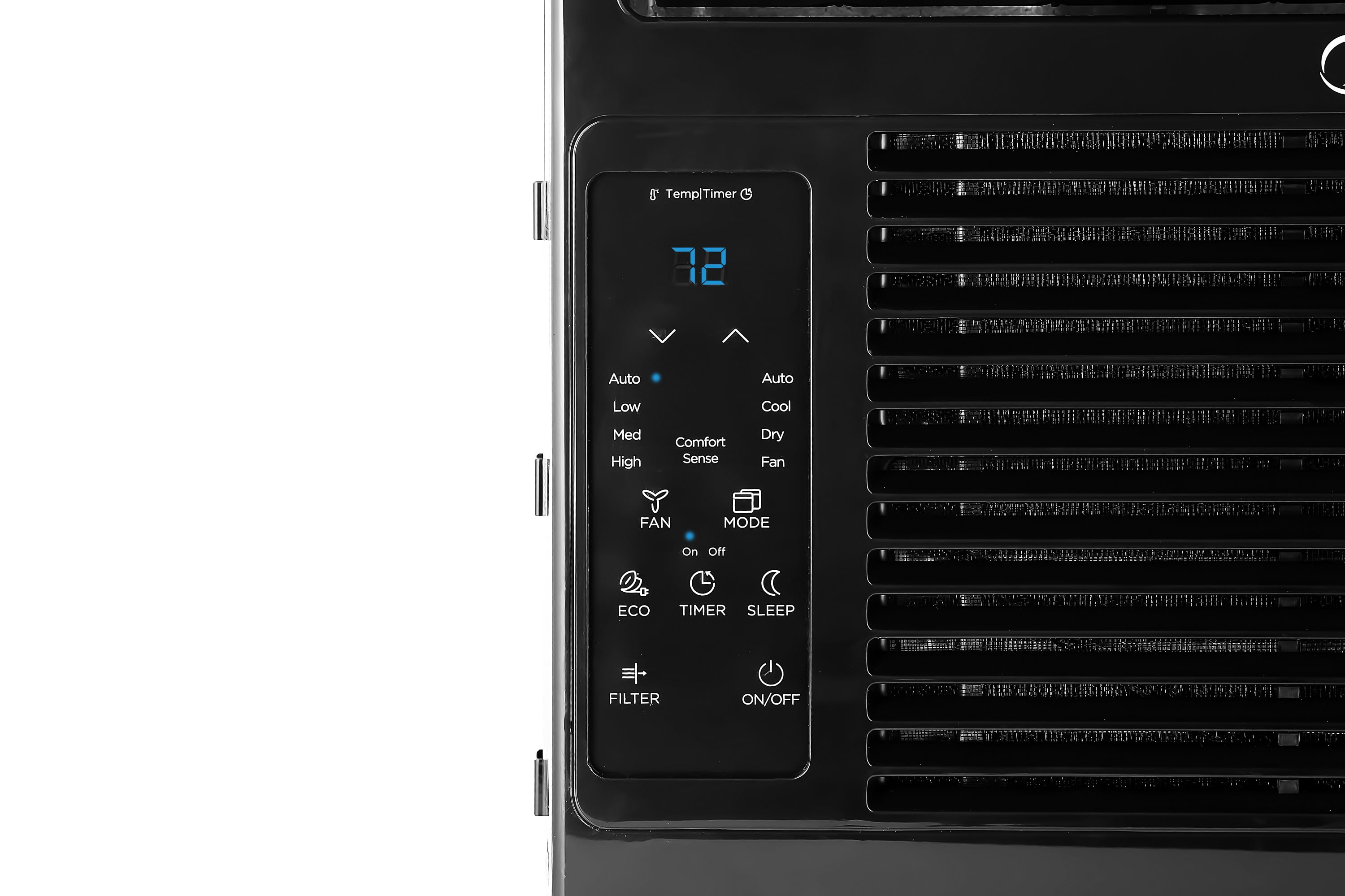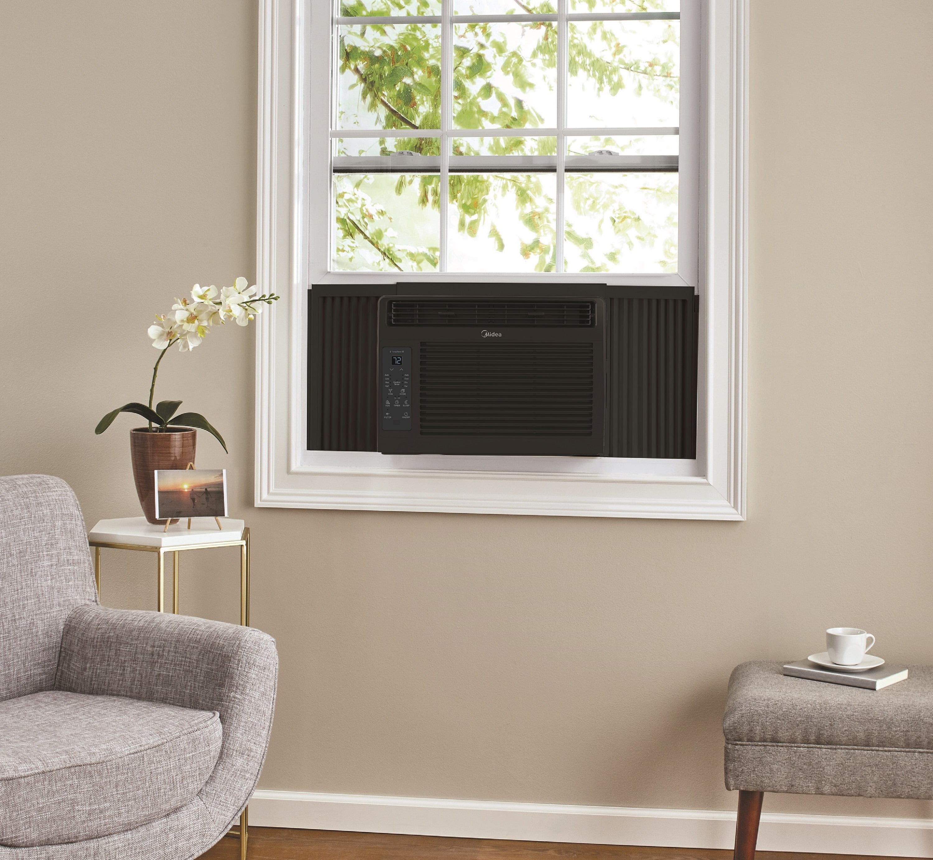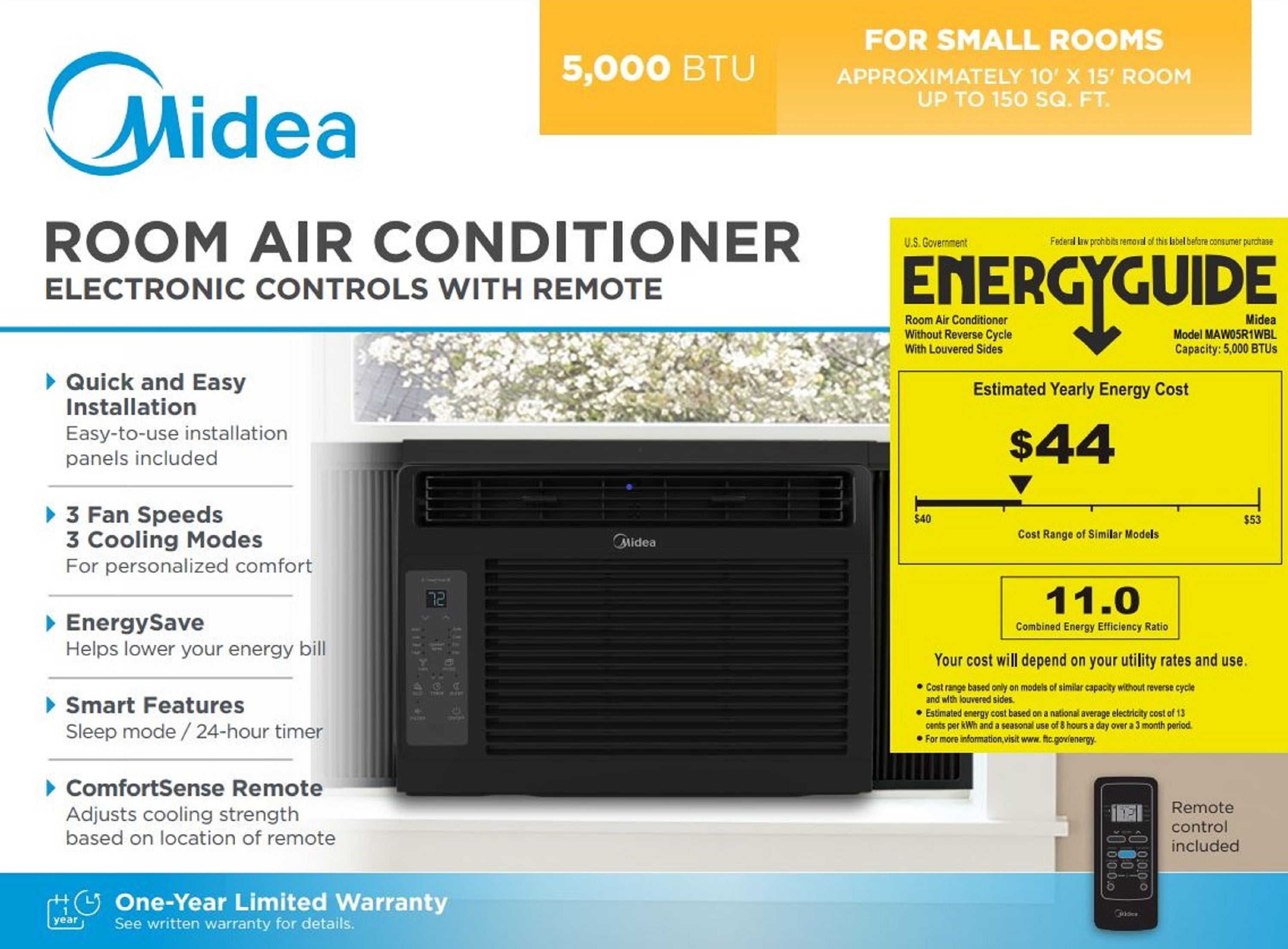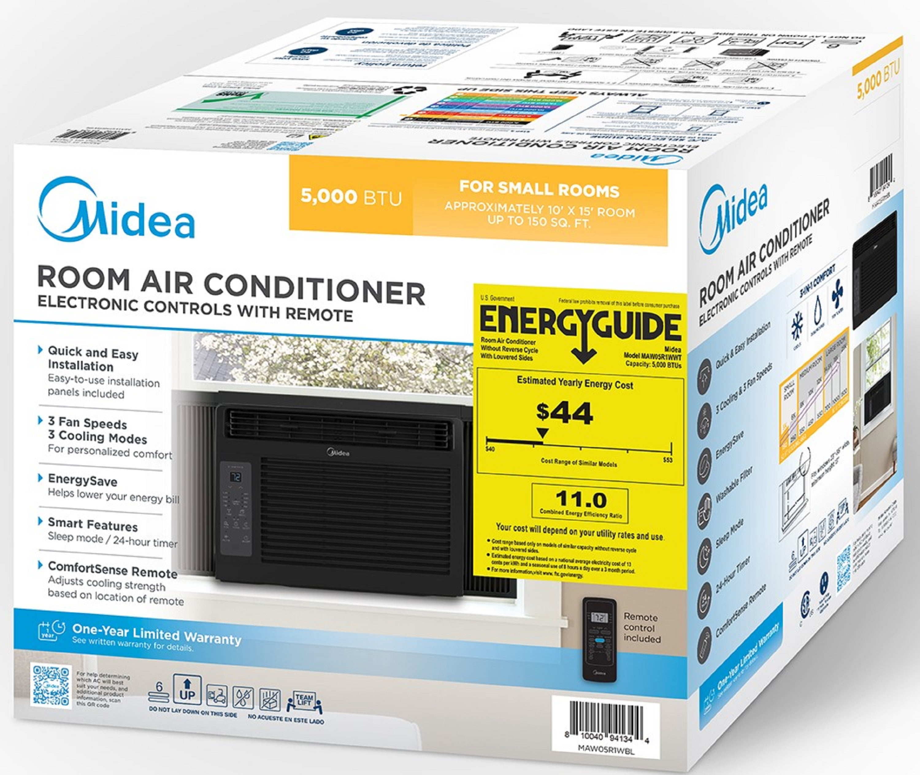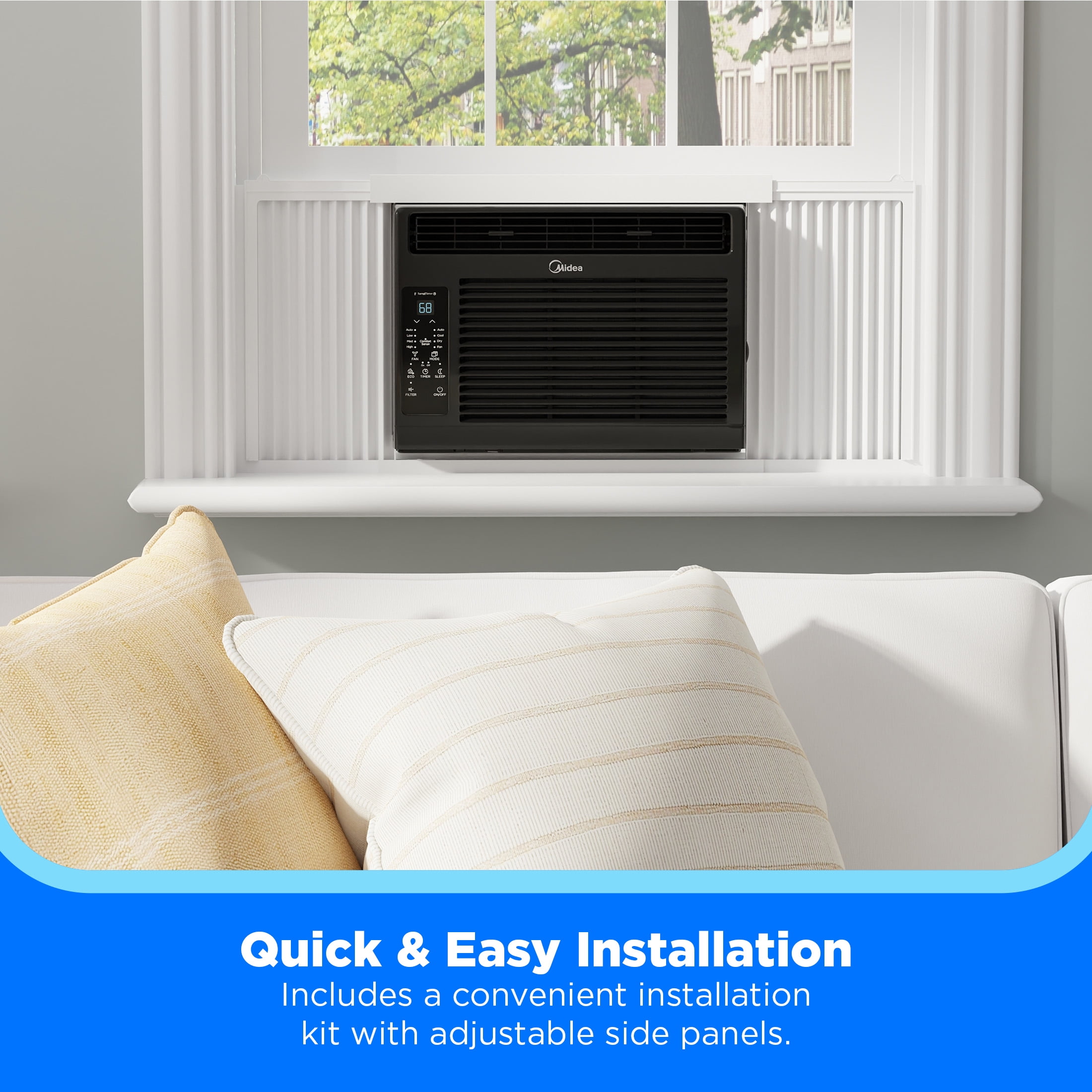 Midea 6,000 BTU 115V Window Air Conditioner with Comfort Sense Remote, up to 250 sq ft Coverage Area, Black, MAW06R1WBL-T, New Trusted AC Brand: Midea brand named #1 AC brand in the US according to Circana/Retail tracking service data for 2023 Comfort Sense Remote: Comfort Sense Remote maintains the room temperature by adjusting the cooling strength based on location of the remote Multiple Cooling Options: 3 Cooling modes and 3 fan speeds for personalized comfort Quick and Easy Installation: Easy-to-use installation panels included Energy Save: Energy-Save mode to help lower your energy bill Programmable Timer: 24-Hour programmable timer – perfect for setting a timer for the unit to turn on prior to you arriving home Easy Maintenance: Clean filter light indicates when the filter needs to be removed and washed Sleep Mode: Equipped with smart features like sleep mode Designed for Smaller Spaces: Cools up to 250 sq. ft. Made for Double Hung Windows: Fits windows 23”-36” wide, and a minimum height of 13” Midea Warranty: 1-year warranty Efficient cooling good for bedrooms and office