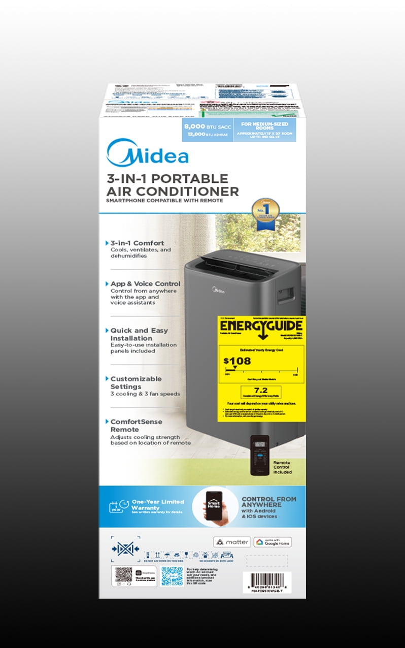 Midea 8,000 BTU (12,000 ASHRAE) 115V Smart Portable Air Conditioner with Remote, App and Voice Control, Covers up to 350 Sq. ft., MAP08S1XWGR-T, Gray 3-in-1 Comfort: Cools, ventilates, and dehumidifies Intelligent Features: 24-hour programmable timer and sleep mode App Control: Control from anywhere with the SmartHome App Voice Control: Hands-free control with Alexa, Google Assistant, and Siri Matter Certified: Use a single app to control all your smart home devices Customizable Settings: Multiple cooling modes and fan speeds Friendly Control: Electronic control panel and digital display with included remote control Easy Installation: Install in casement and vertical sliding windows with the included installation kit Warranty: This unit comes with a 1-year limited warranty