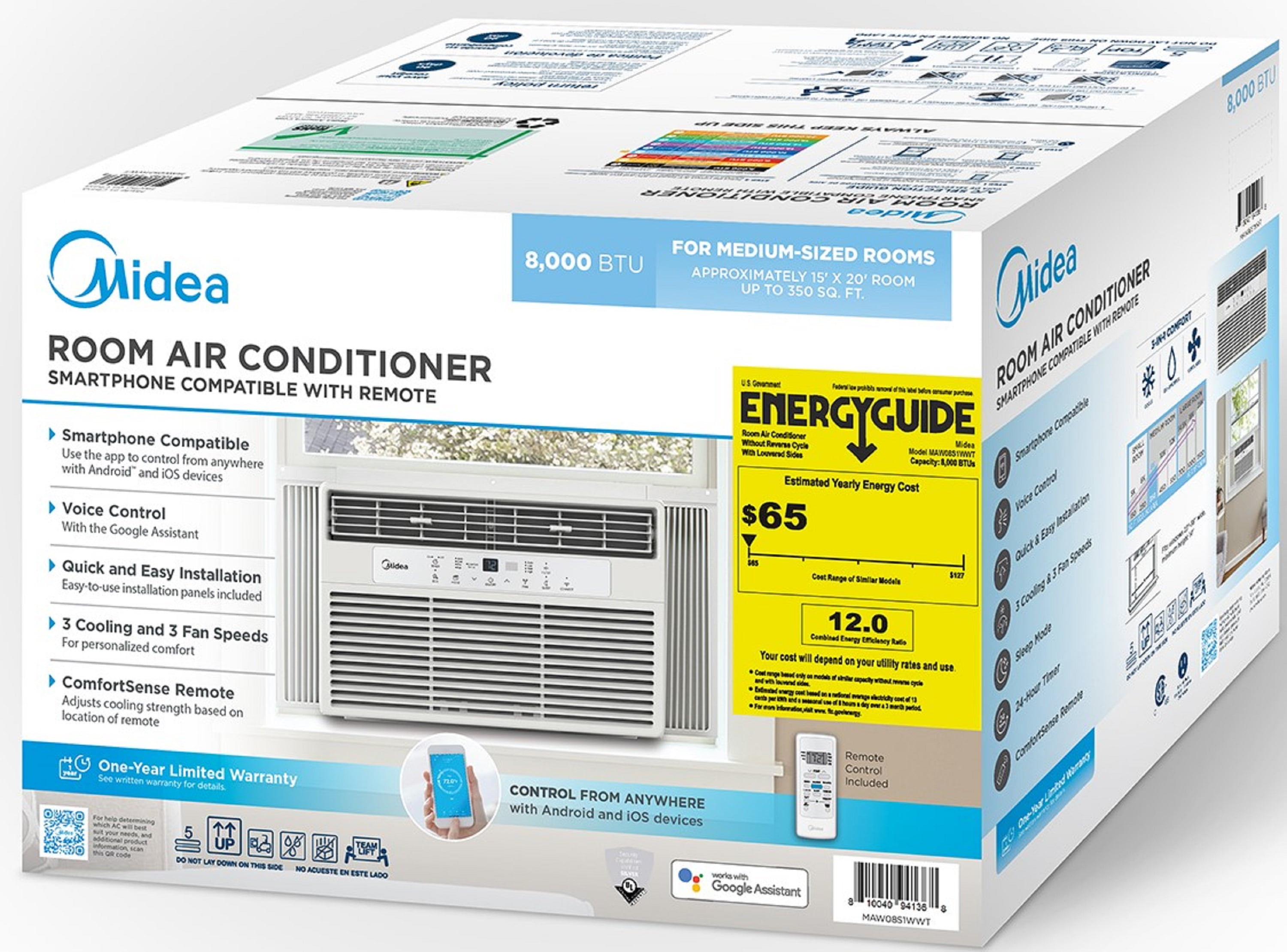 - Smart Control: Midea 8,000 BTU 115V Smart Window Air Conditioner with Comfort Sense Remote, White, MAW08S1WWT works with Google Assistant and Alexa. This window air conditioner is Wi-Fi-enabled and can be controlled from anywhere through the cloud using the MideaAir app on iOS or Android.