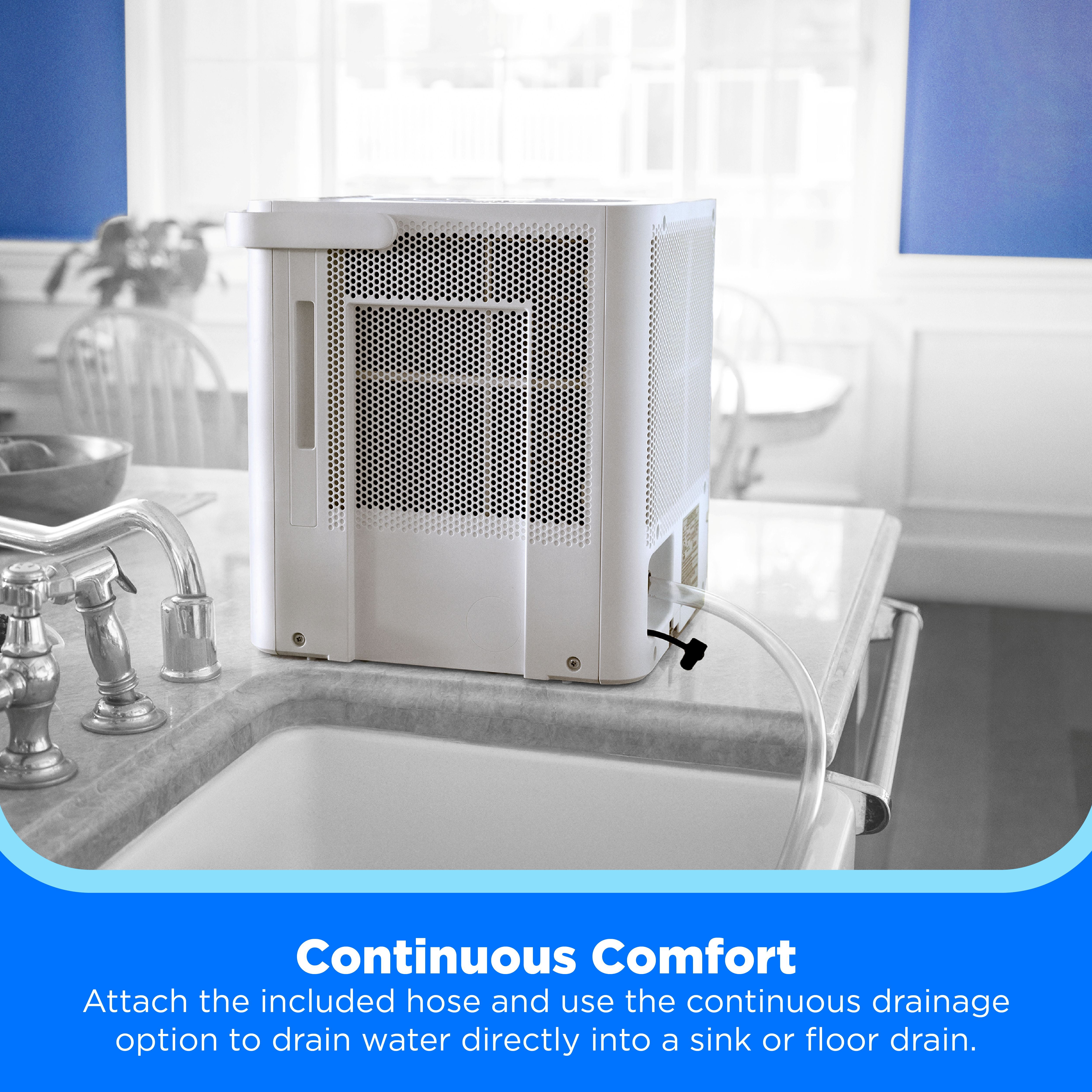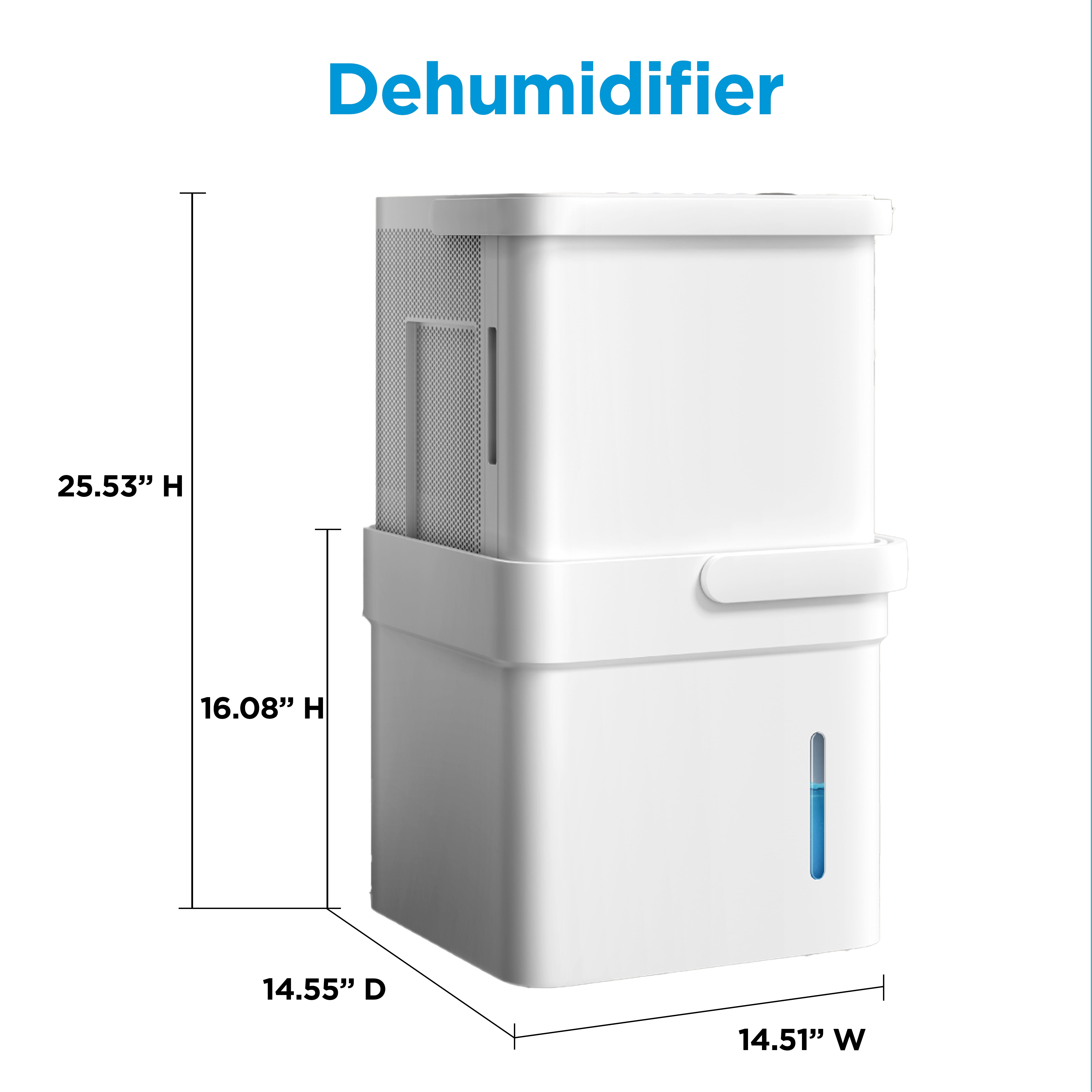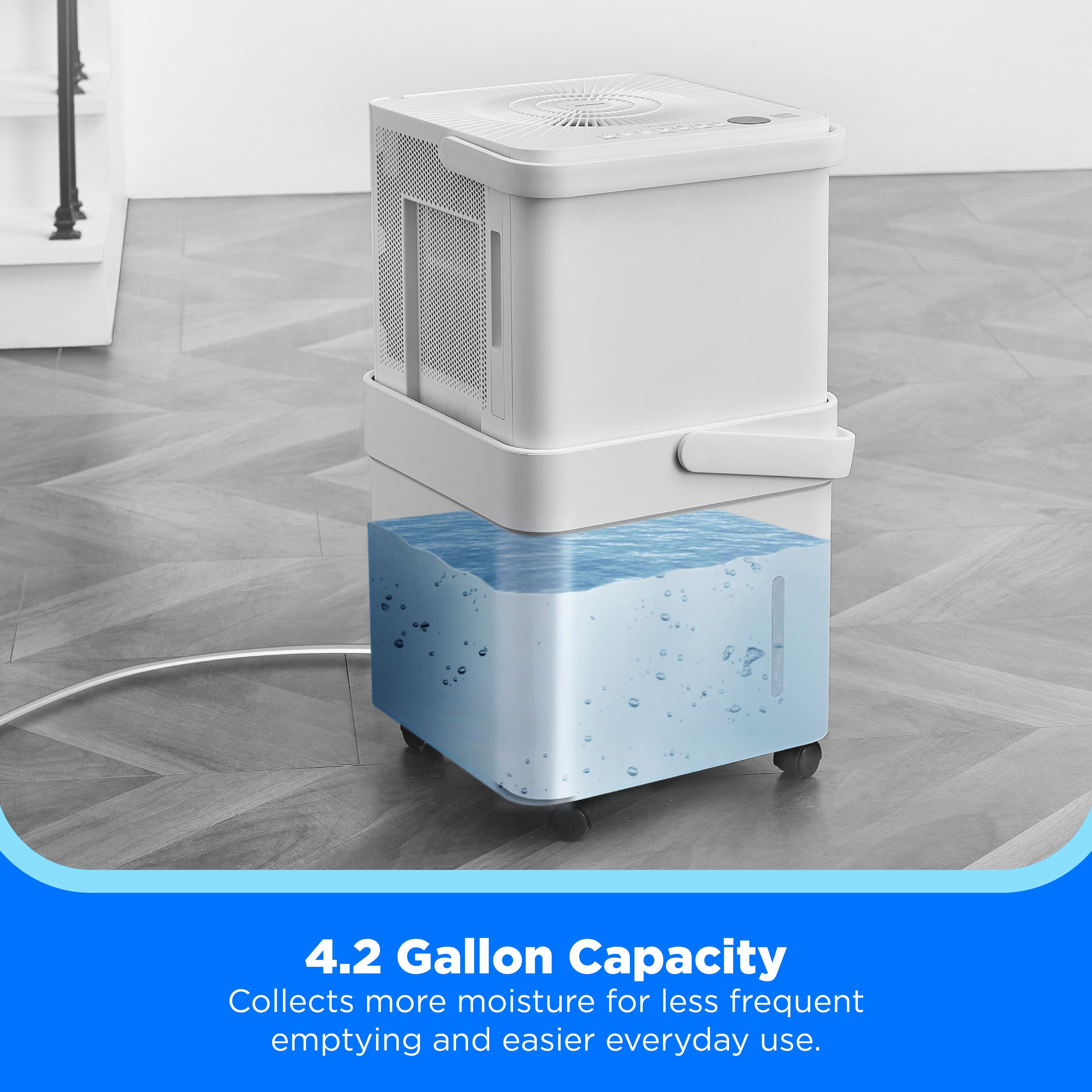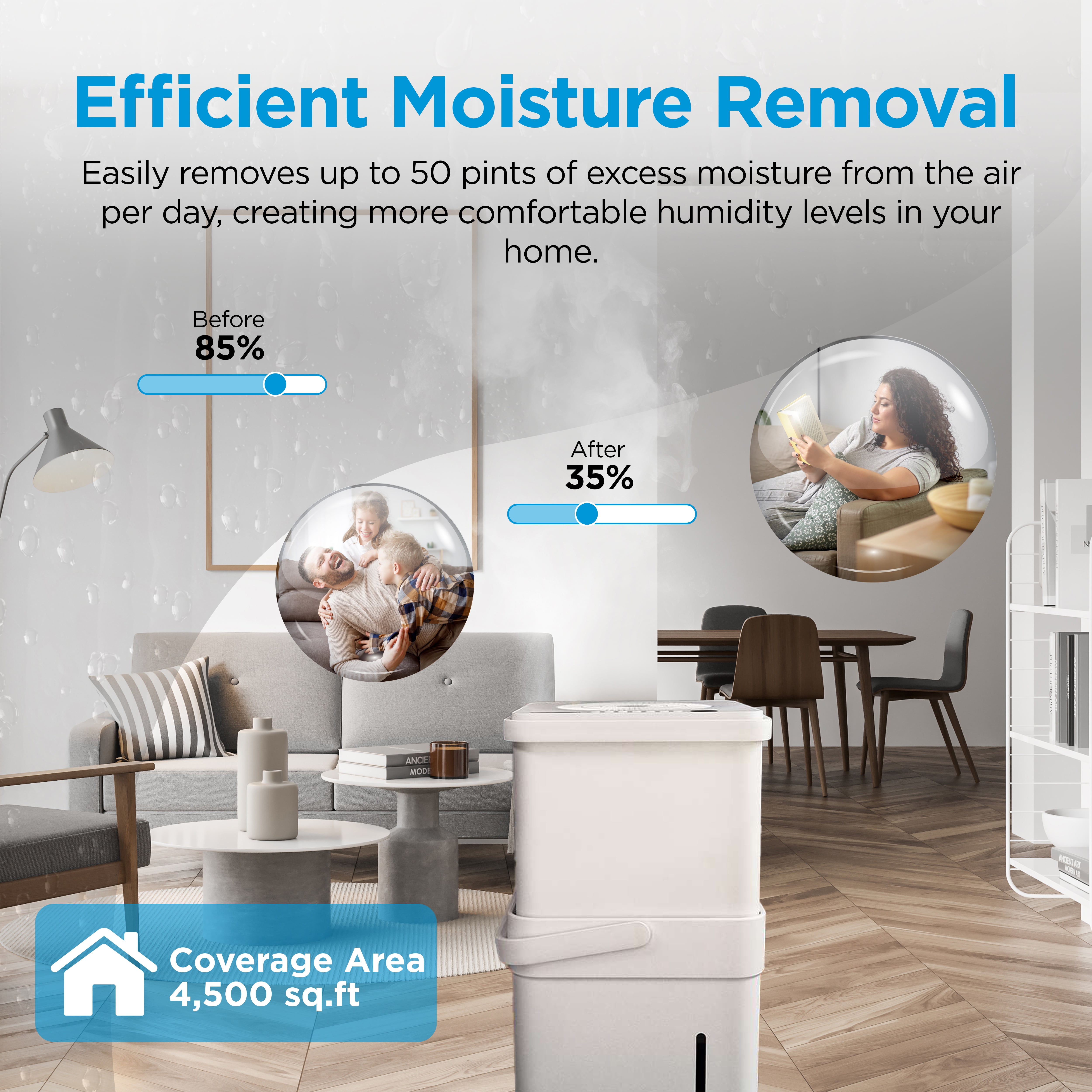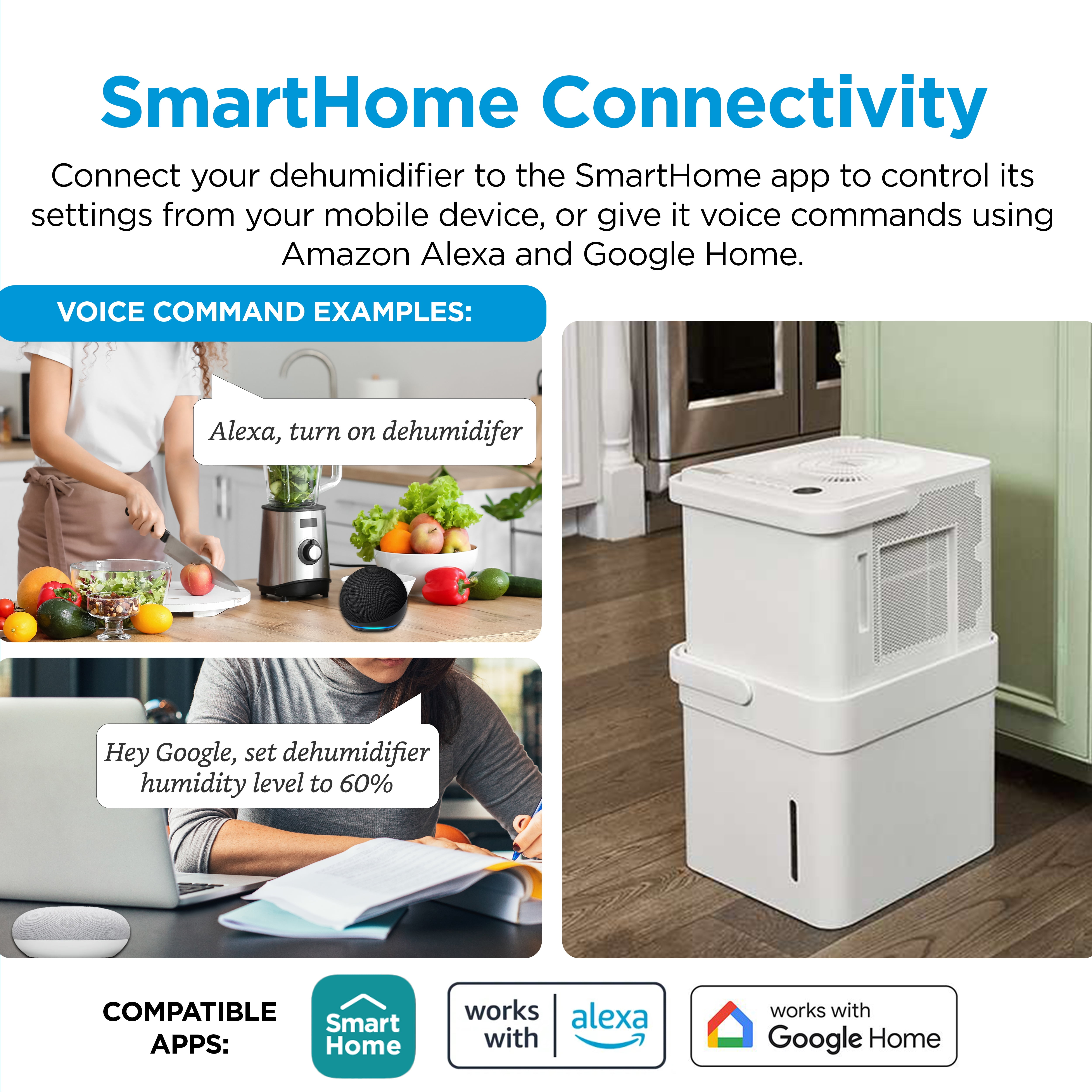 Efficiently removes up to 50 pints of excess moisture from the air per day, covering spaces as large as 4,500 square feet Built-in pump for continuous drainage, allowing you to remove moisture effortlessly, even over long distances or into sinks and elevated drains Easily converts into nested mode for compact storage when not in use Connect to the SmartHome app to monitor and adjust the dehumidifier’s settings from your mobile device, and receive voice commands through Amazon Alexa and Google Home Exceeds government energy efficiency standards, allowing you to save money and conserve energy while enjoying the features you love Covered by a 2-year parts and labor warranty, double the industry standard, for added peace of mind