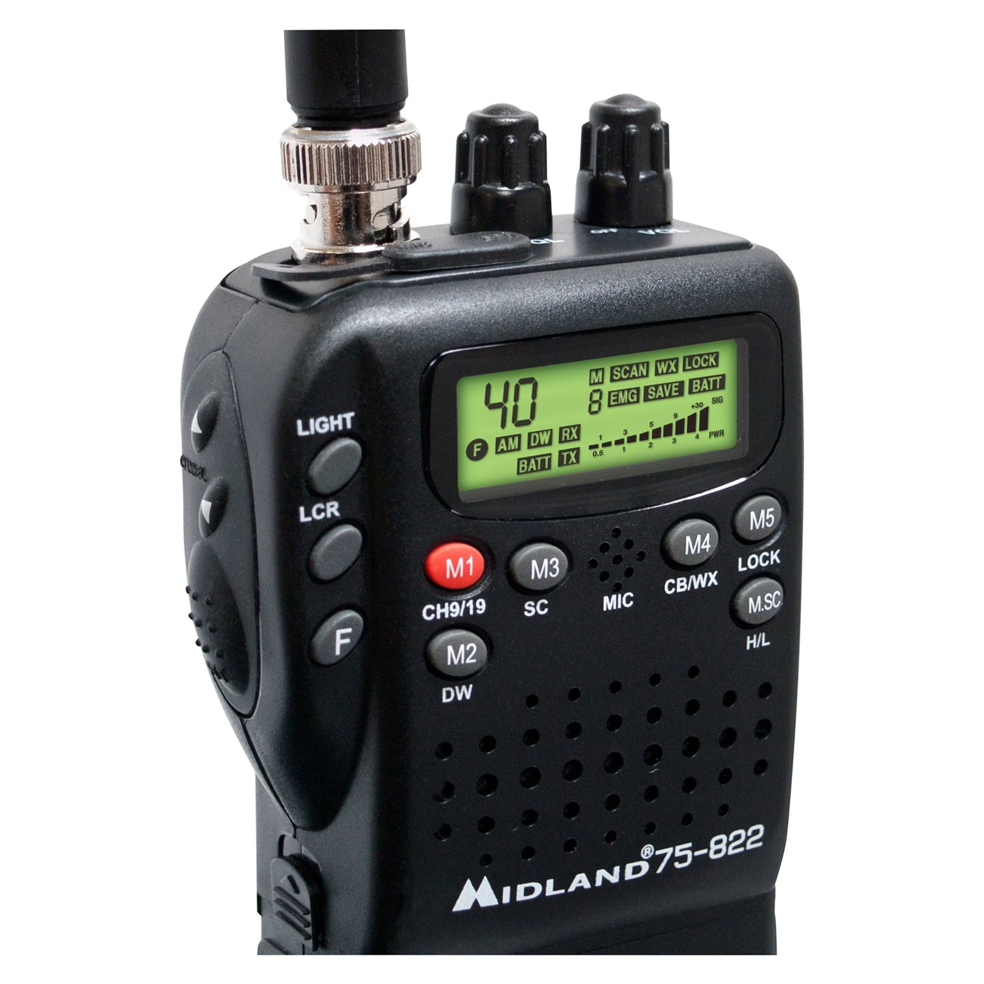 Midland 75-822 Handheld 40-Channel CB Radio with Weather/All-Hazard Monitor and Mobile Adapter: 4W of power over all 40 channels NOAA all-hazards/weather alerts RF gain control 5-channel memory with dual watch High/low power settings with auto battery save Keypad lock Choice of channel or frequency readout 5 user-selectable memory channels Large, 15-function LCD readout Includes a mobile adapter to provide a DC power plug and external antenna connector, rechargeable battery compartment, alkaline battery compartment, AC plug-in charger, and antenna Requires six AA alkaline batteries Midland handheld CB radio is simple to use