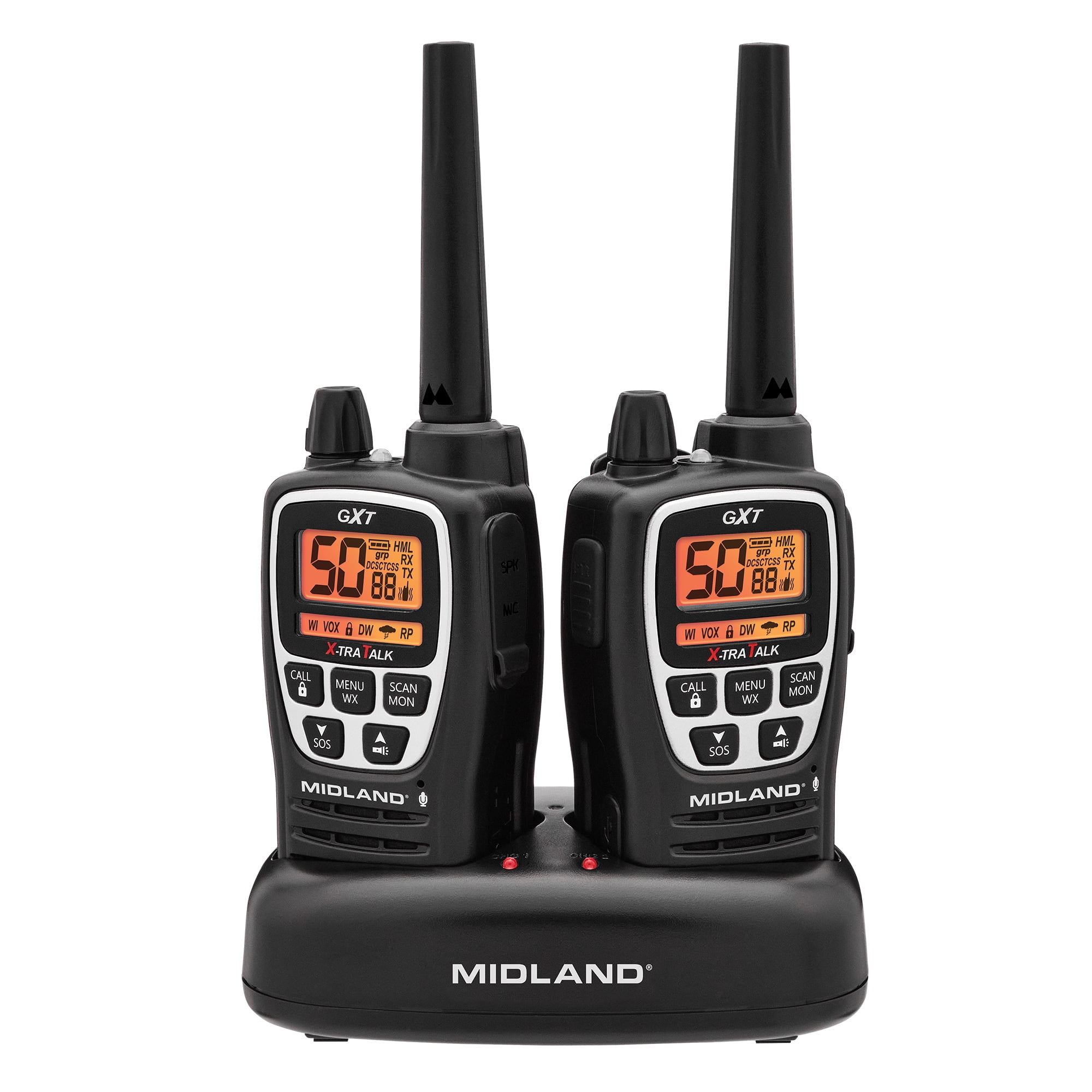 The GXT3000VP4 GMRS walkie-talkie is a powerful and consistent choice for your radio communication needs. Featuring Midland’s signature NOAA Weather Scan + Alert Technology. This radio will automatically scan through 10 available weather (WX) band channels and will lock onto the strongest weather channel to alert you of severe weather updates. This radio also boasts a JIS4 waterproof rating, hands-free communication, 22 channels plus 28 extra channels with pre-programmed privacy codes, 8 GMRS repeater channels, 142 privacy codes, and silent operation. Along with two radios, this kit includes two rechargeable battery packs, AC/DC adapters, and pair of boom mic headsets.
