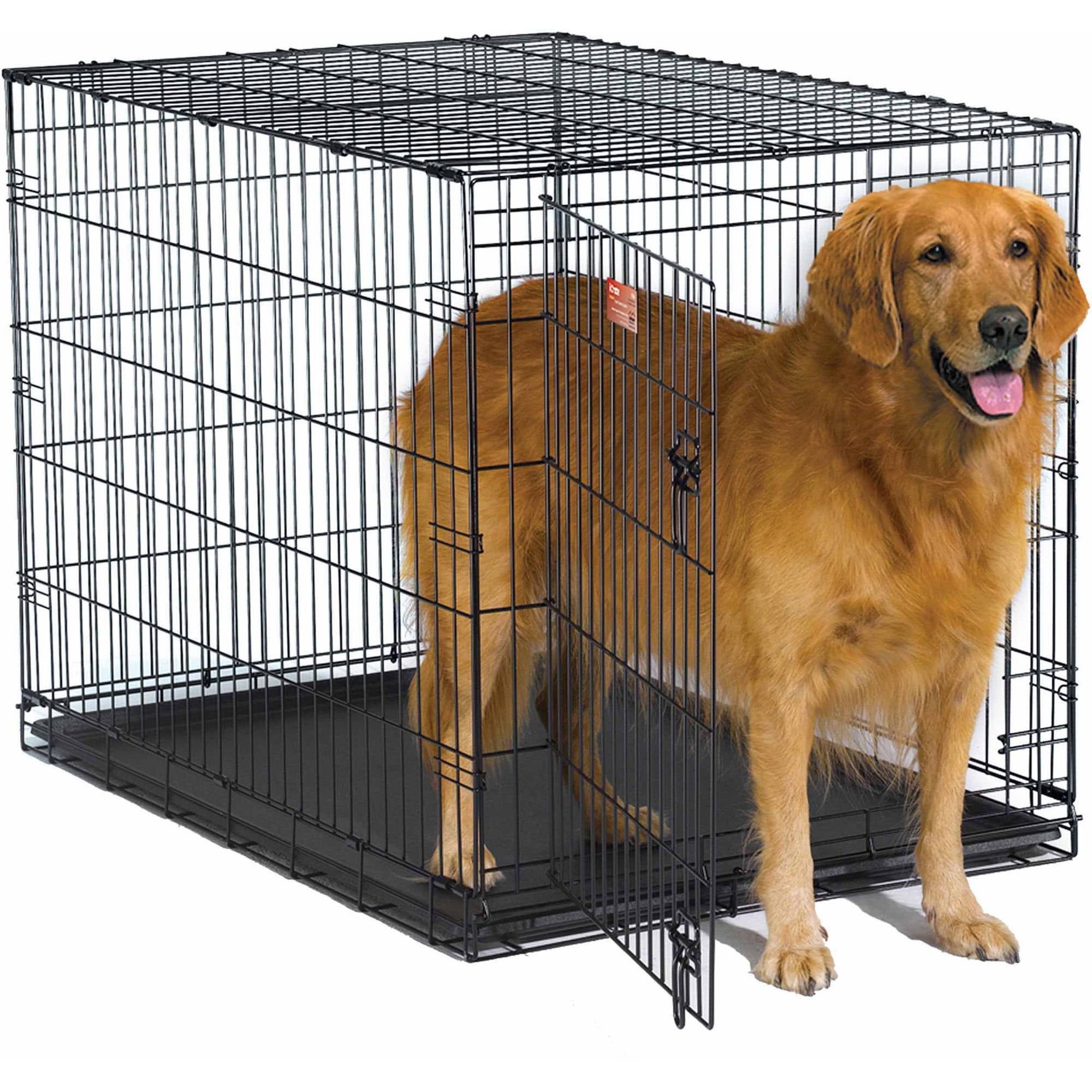 Midwest 42″ iCrate Dog Crate: Easily sets up and folds down to portable size – no tools required Durable, satin black electro-coat finish Safe and secure slide bolt latches Tough, easy to clean plastic pan Includes free divider panel, allows you to adjust length of living area as your puppy grows into its adult size home Available in seven sizes, from 18″ long to 48″ long