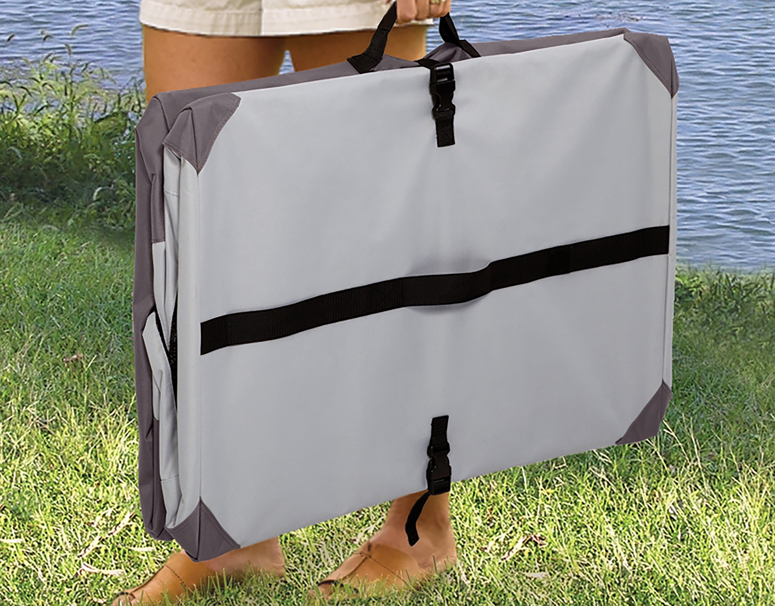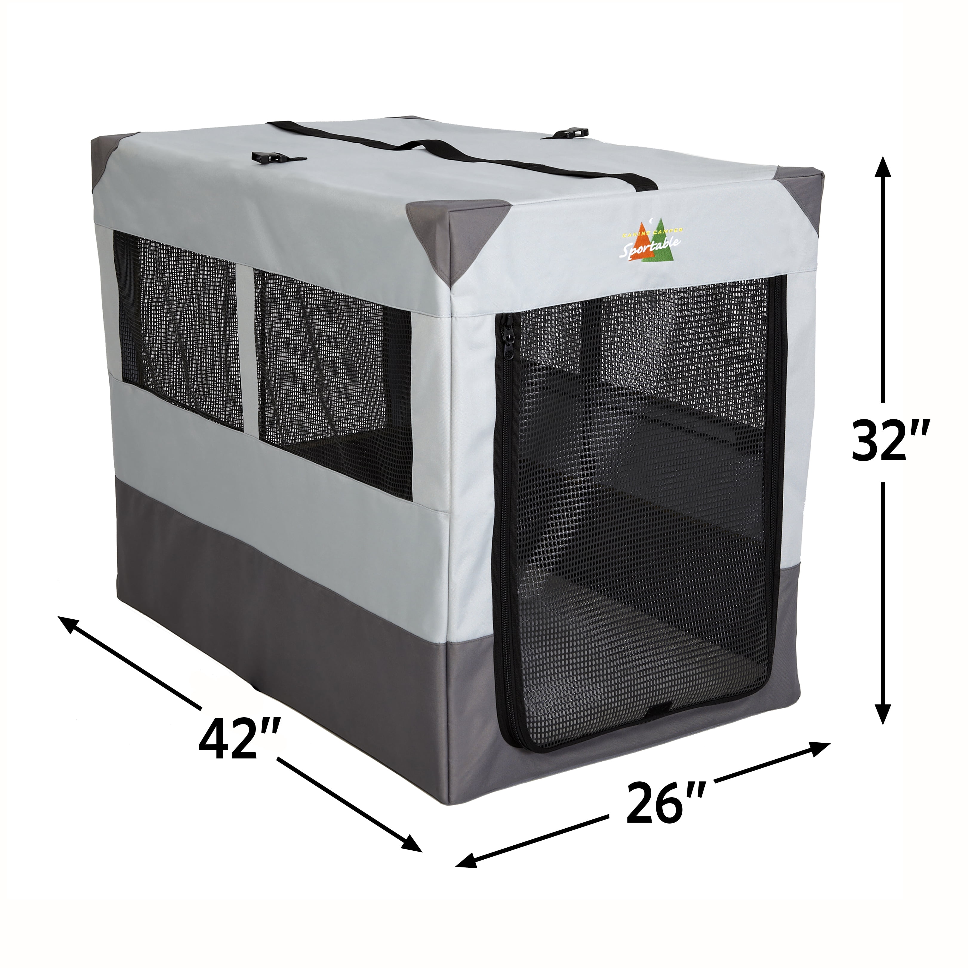 Portable tent dog crate | Ideal for large dogs 71 to 90 pounds | Measures 42L x 26W x 32H Inches Soft dog crate is made of water resistant material with a secure, easy zip door Lightweight travel dog crate | Sturdy folding steel frame equipped w/ a buckle latch & handle for easy portability Synthetic sheepskin dog pad included for your pet’s comfort | Large mesh windows provide ventilation & visibility that dogs desire Each Canine Camper Sportable includes the MidWest Quality Guarantee 1-Year Manufacturer’s Warranty