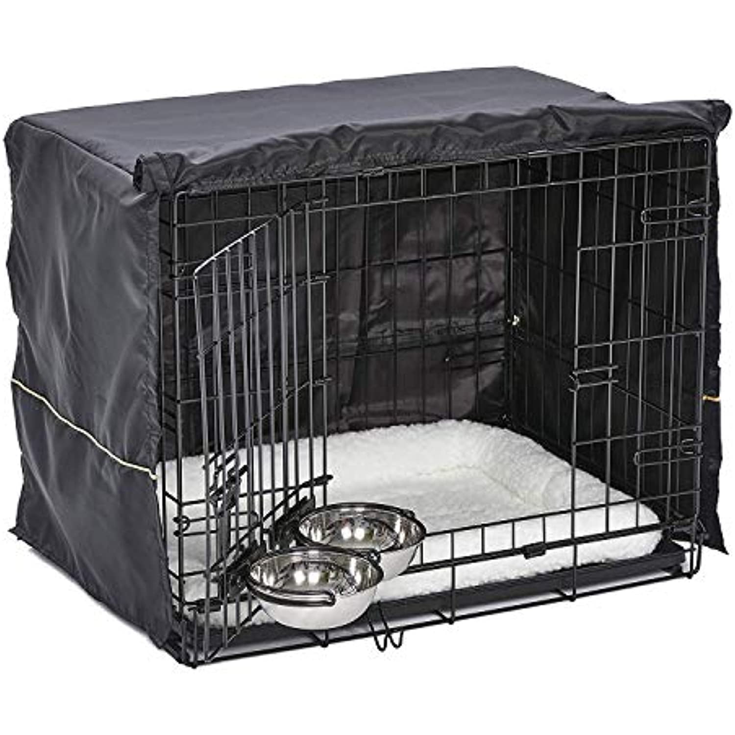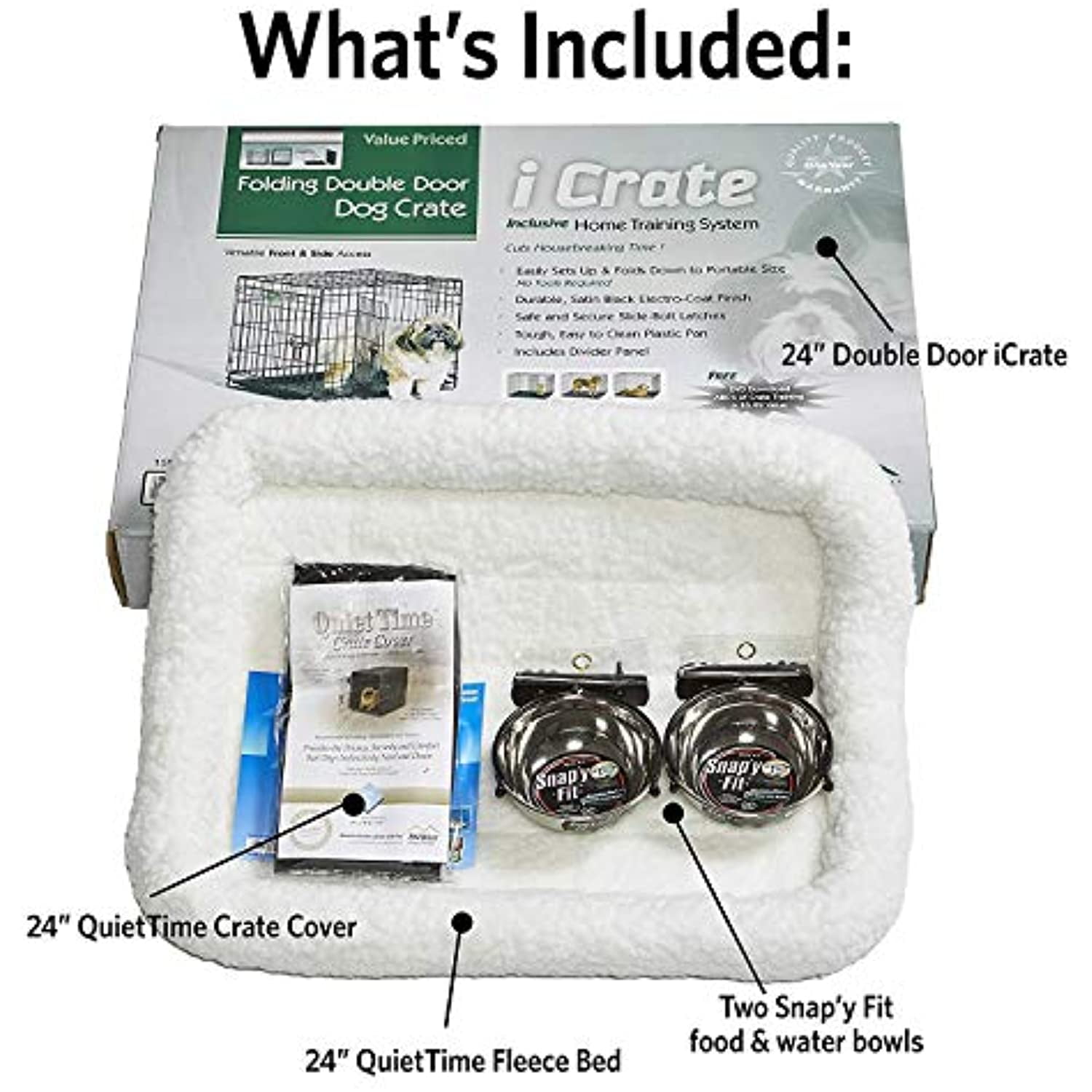 Ultimate convenience & perfect starter kit for new pet parents. 1 fully equipped 2-door ICrate, 1 pet bed, 1 crate cover & 2 pet bowls that affix to the dog crate. Pet parent & dog friendly. Fleece pet bed & polyester crate cover create a cozy retreat for your dog & are machine washable / dryer friendly. Two snap’y fit pet bowls are designed to attach to the dog crate, keeping food & water in one convenient location.