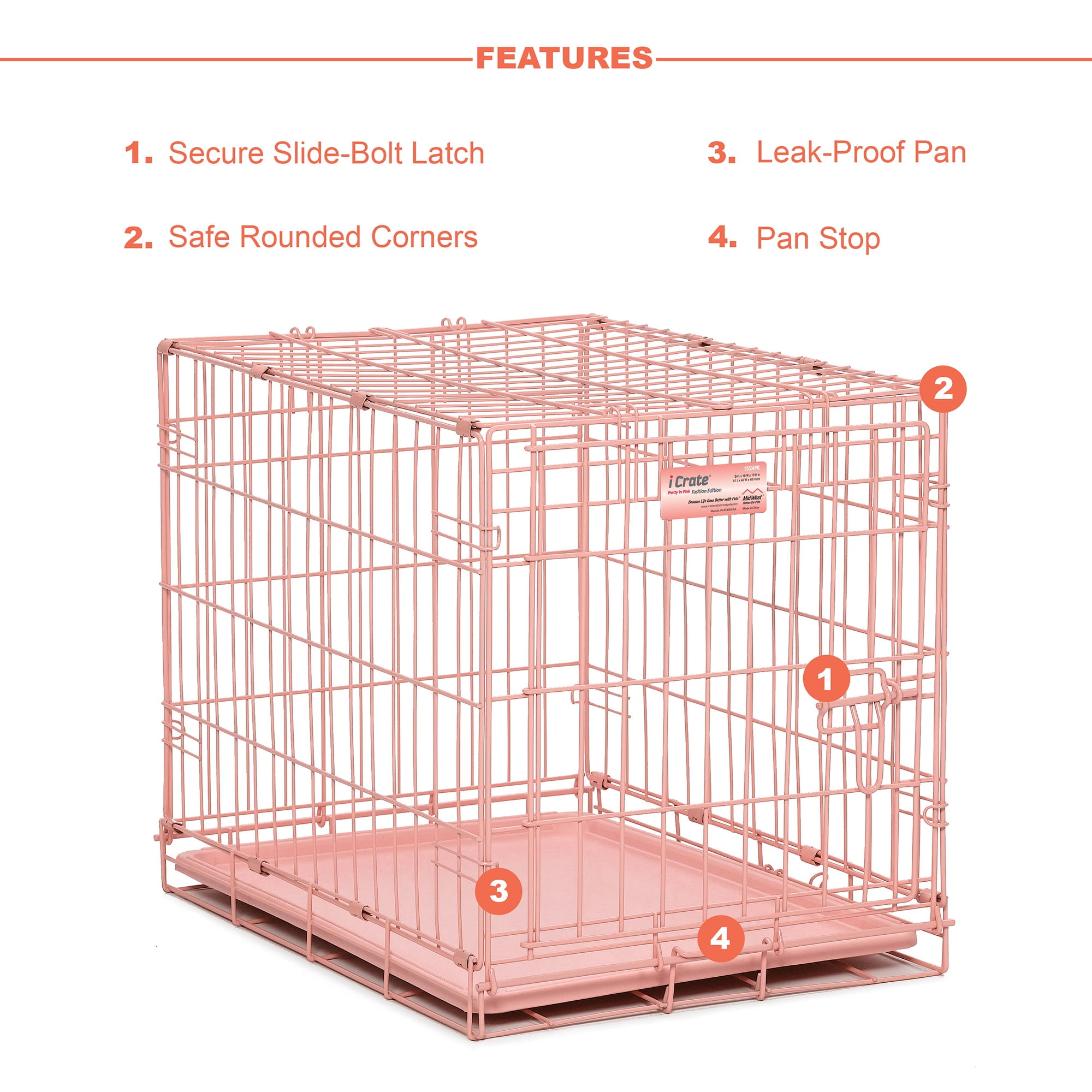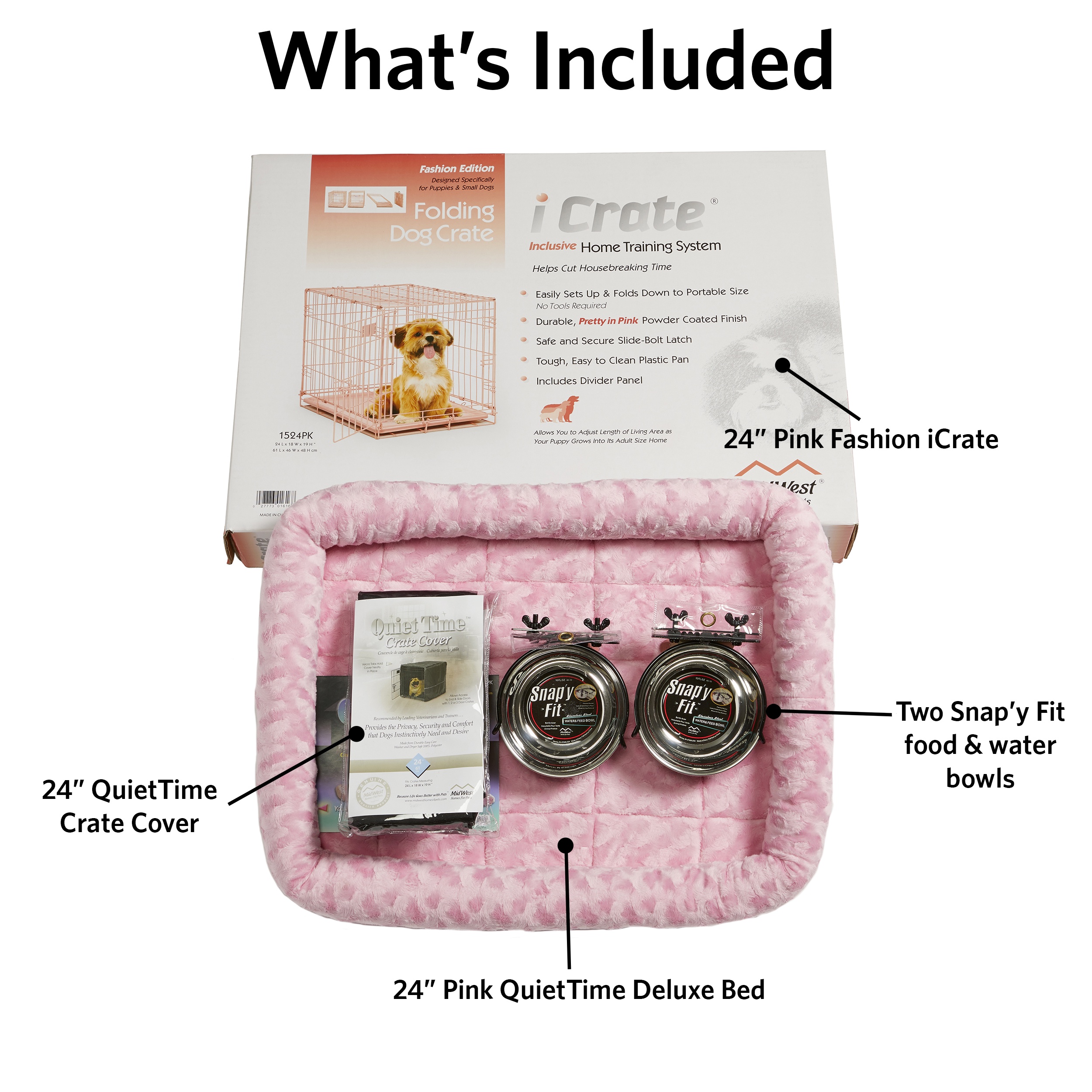 Crate dimensions: 24.50L x 17.80W x 19.50H in. Crate is made of metal wire Polyester pet bed and privacy cover Features a pink theme 2 stainless steel pet bowls attach to crate Ideal for small dogs under 25 lbs. Privacy cover reduces anxious behavior Pet bed and privacy cover are machine washable and dryer-safe Foldable design for storage Family Owned for over 100 Years