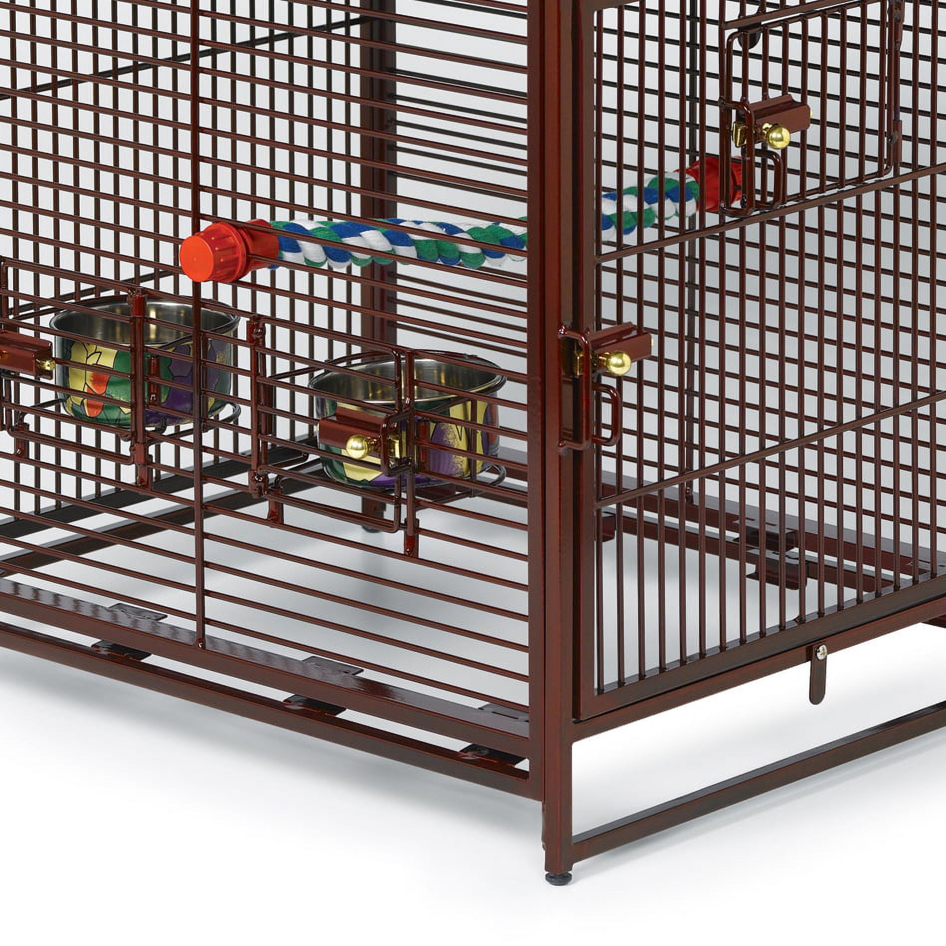 Measures 14L x 14W x 18H inches .5-inch bar spacing with 1/8-inch wire gauge Ruby or platinum finishes (based on availability) 2 stainless steel food cups Cotton rope perch inside and wooden handle perch outside The Poquito Avian Hotel Bird Cage is a smart and functional lodging solution for traveling birds. This state-of-the-art cage is intended to house birds over a weekend, providing them with safe, sturdy, roomy accommodations. This cage is not recommended for use exceeding one week. This cage is ideal for short-term use for travel, outdoor use for healthy sunlight exposure, or for emergency evacuations. Inside you’ll find 2 stainless steel food cups, which can also be attached to the outside of the cage, and a cotton rope perch. The rooftop offers a fun out of cage experience using the wooden handle as a perch. This cage also features easy, no-nuts-and-bolts assembly and bird-proof door locks. Ideal for: Short-term travel (not recommended for use exceeding 1 week) Boarding Emergency Evacuations Sleeping cage Short-term outdoor use for healthy sunlight exposure Road trips About Mid-West Metal Products In 1921, Mid-West Metal Products made only one item, a Kruse Switch Box Support, and over the years began manufacturing millions of wire and sheet metal component parts. By 1960, they were producing training crates for pets. Today, Midwest Homes for Pets, a division of Mid-West Metal Products, produces and markets a variety of pet containment products. These products include dog crates, training puppy crates, dog kennels, cat playpens, bird cages, vehicle barriers, soft-sided carriers, grooming tables and much more. They also manufacture a full line of pet accessories like beds and feeding dishes.