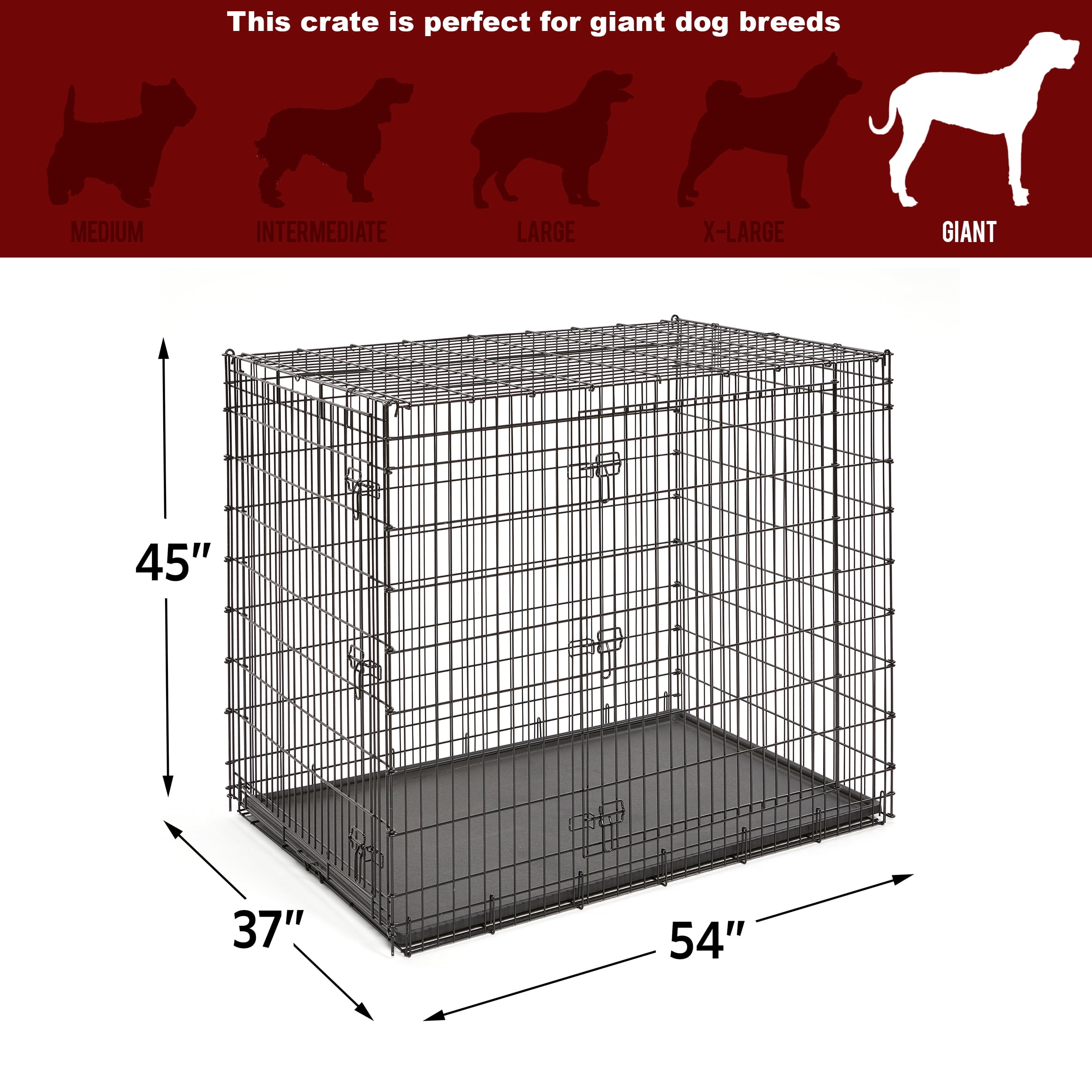 Giant double door metal dog crate measures 54L x 37W x 45H Inches and weighs 80.2 pounds. Ideal for extra-large dog breeds weighing over 90 pounds (Great Dane).Specific uses for product : Behavior Dog Crate is double door configuration w/ sturdy drop-pin assembly. Includes easy to clean / removable tray and patent pending “L-Bar” safety feature Durable metal dog crate design w/ 3 heavy duty secure slide-bolt latches per door. Please note this is an XXL dog crate and requires 2 people for assembly Drop-pin construction ensures strong and secure dog crate assembly and patented “L” bar on top panel reinforces the dog crate side panels to prevent them bowing inward after assembly. Pan Stop Allows Pan To Be Removed With Doors Closed Protective E-co Protective E-coat finish prevents rust for long lasting use and dog crate includes MidWest Guarantee 1-Year Manufacturer’s Warranty at finish prevents rust for long lasting use and wire dog crate includes 1 Year Manufacturer’s Warranty Age Range Description: All Life Stages Included Components: Removable Abs Composite Plastic Pan Family Owned for Over 100 Years | Customer and product support provided from our headquarters in Indiana!