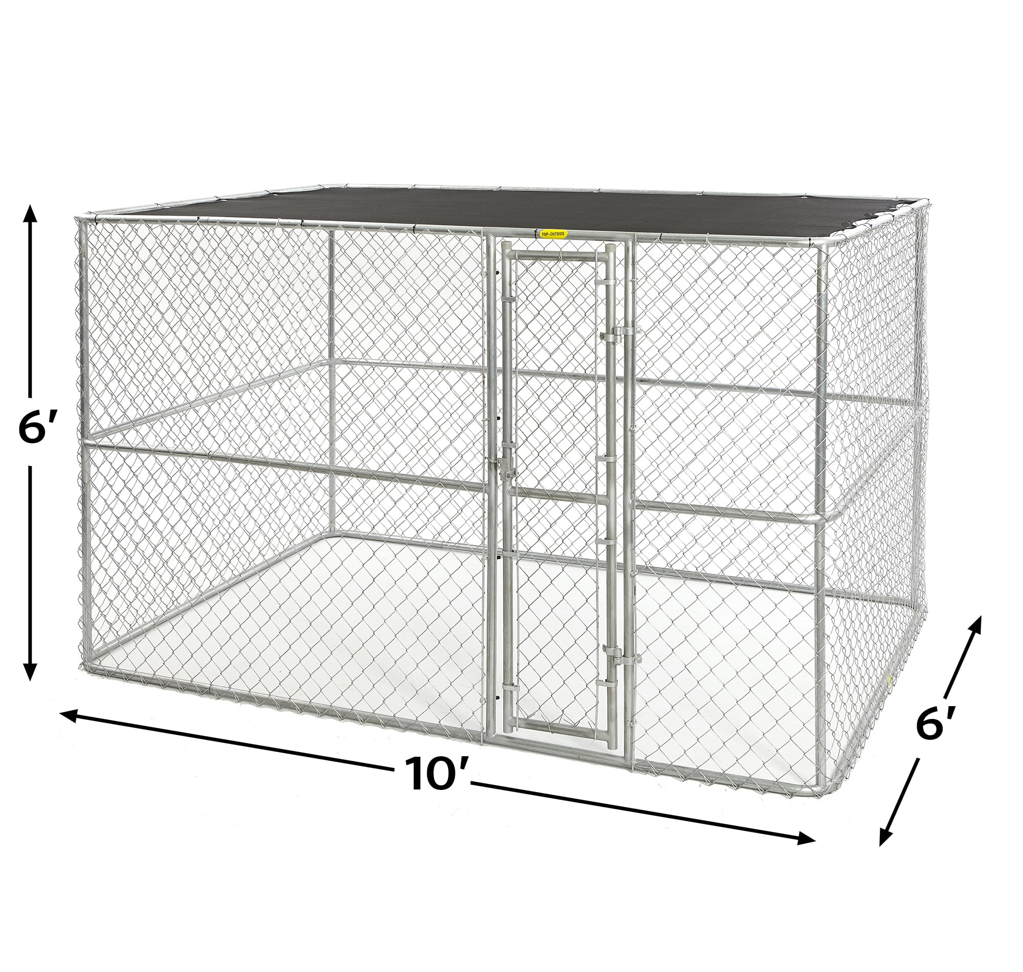 Model K91066 measures 10L x 6W x 6H? — other dimensions and heights available Affordable, and portable outdoor containment solution for larger breed dogs Patented design with rounded corners, strong steel frame, and secure chain-link construction provide extra stability, as well as quick and easy set up Sunscreen included ? attractive, protective woven polyethylene fabric that provides 80% sunblock 1-year manufacturer?s warranty included
