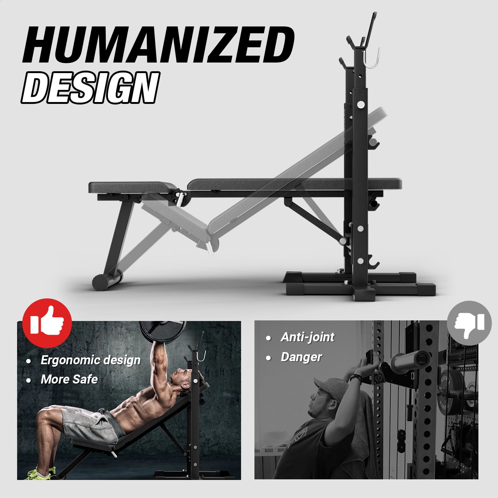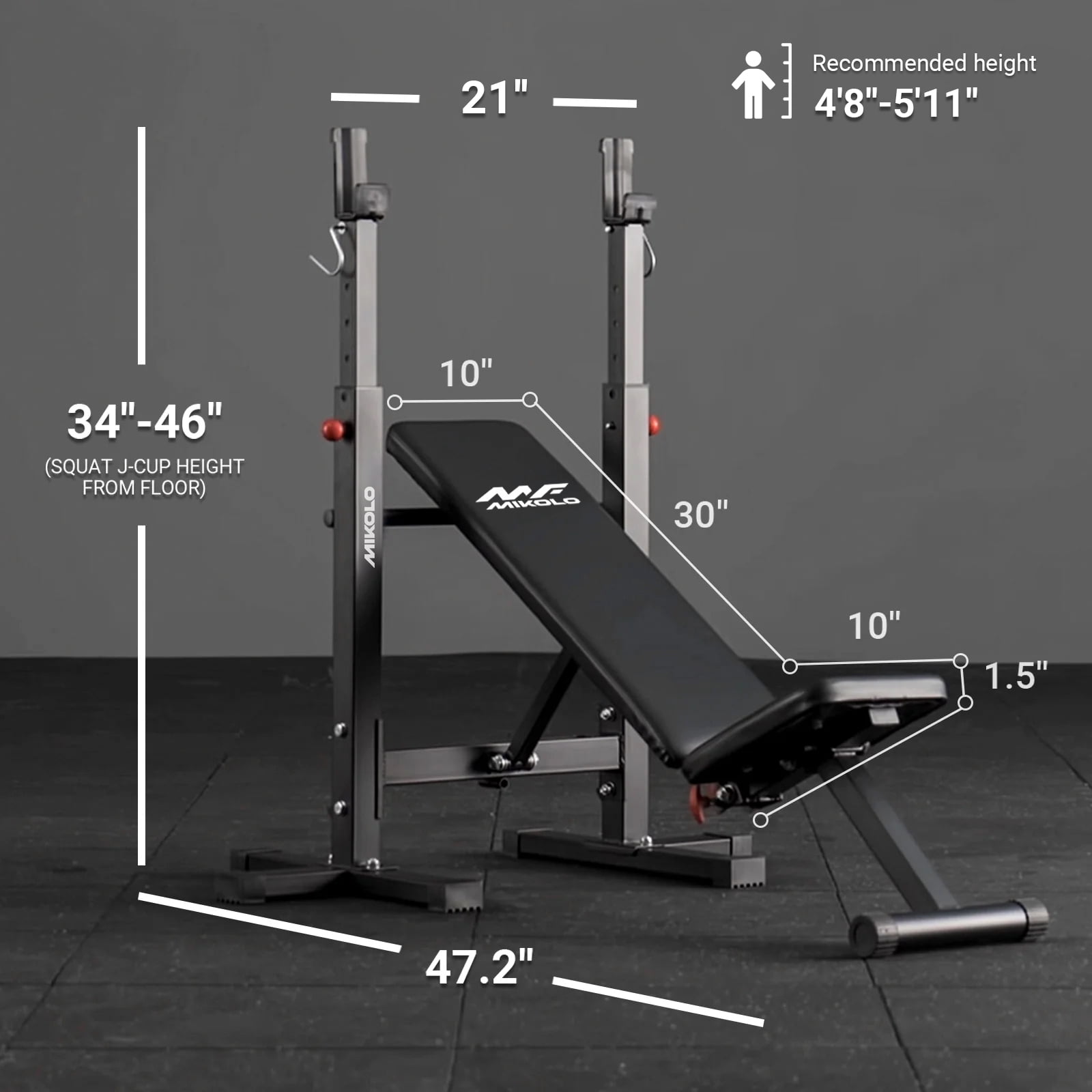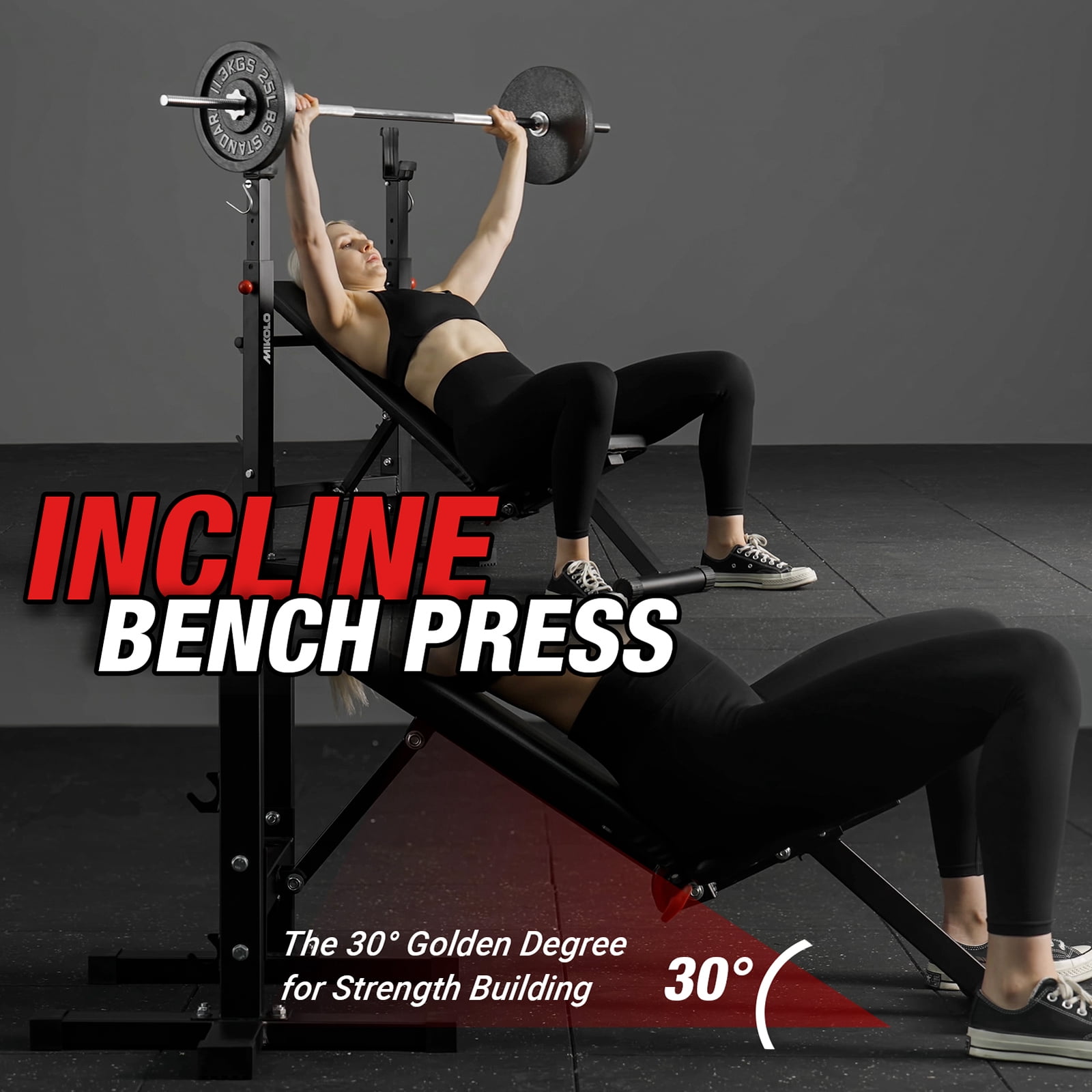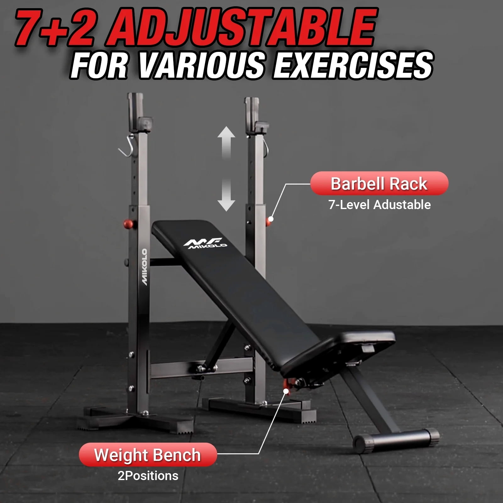 Crafted from top-quality steel, this bench boasts a robust triangular design that can effortlessly support up to an impressive 660 lbs. Its wide frame enhances stability, ensuring you can focus on your lifts without any worries about tipping over. Plus, the innovative textured foot pads provide unbeatable grip, keeping you grounded during even the most intense workouts. This bench is your ultimate fitness companion, allowing you to sculpt and tone multiple muscle groups with ease. Whether you’re crushing flat and incline bench presses, powering through dumbbell shoulder presses, or honing in on those bicep curls and reverse flies, it’s designed to accommodate all your favorite exercises. Say goodbye to monotonous routines and hello to a dynamic workout experience! We found that most benches with racks on the market are too narrow for adults to do the bench press properly, and it’s a hassle to remove and return; In addition, when the board is lifted, the head of the board will be in front of the barbell, and adults will not be able to do the correct upward reclining bench press, and the movement is very dangerous. So the Mikolo bench set was invented! The top of our bench is at the same level when doing the flat bench press and the inclining bench press; A more standard design makes your training safer and more effective; The larger size and wider rack provide more stability, making the Mikolo weight bench setup more suitable for teens and adults. Customization is at your fingertips with our adjustable design. Featuring 7 height positions for the J-hooks and 2 incline angles for the bench, you have complete control to find that perfect setup tailored to your individual training style. This flexibility empowers you to push your limits and reach new heights in your fitness journey. And for those who cherish their space, you’ll adore the foldable feature! When the workout is done, this bench can be conveniently stored away, making it perfect for home gyms of any size. Plus, it easily accommodates a 6-inch barbell, ensuring your workout area stays organized and clutter-free. Installation? A Breeze! You’ll love how simple it is to get started. We provide clear installation instructions and ensure timely delivery right to your door. Note: The package does not include bars and barbell pieces. And if you ever need help, Our professional customer service is ready to respond to your message to solve your problems Enjoy peace of mind with our permanent warranty—your investment is protected for the long haul!