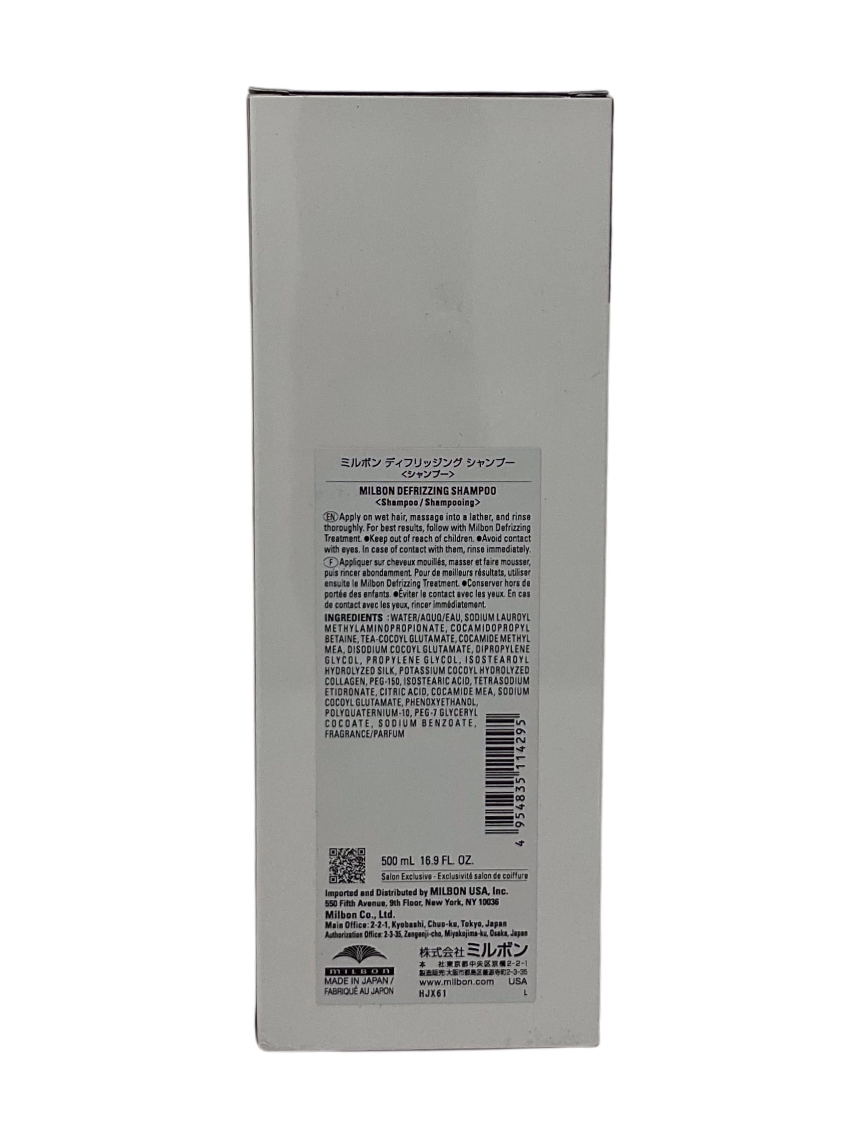 Milbon Anti Frizz Defrizzing Shampoo 16.9oz Eliminate frizz. This defrizzing Shampoo weightlessly hydrates for optimum moisture distribution inside the hair and seals it in — controlling frizz and leaving hair more manageable. As it weightlessly defines waves and curls, this item is perfect for all types of frizz-prone hair. Use with Defrizzing Treatment for best results. color safe HOW TO USE: After shampooing, squeeze out excess moisture, apply from mid-length to ends and massage in for 30 seconds until hair feels soft and smooth. Then rinse thoroughly.