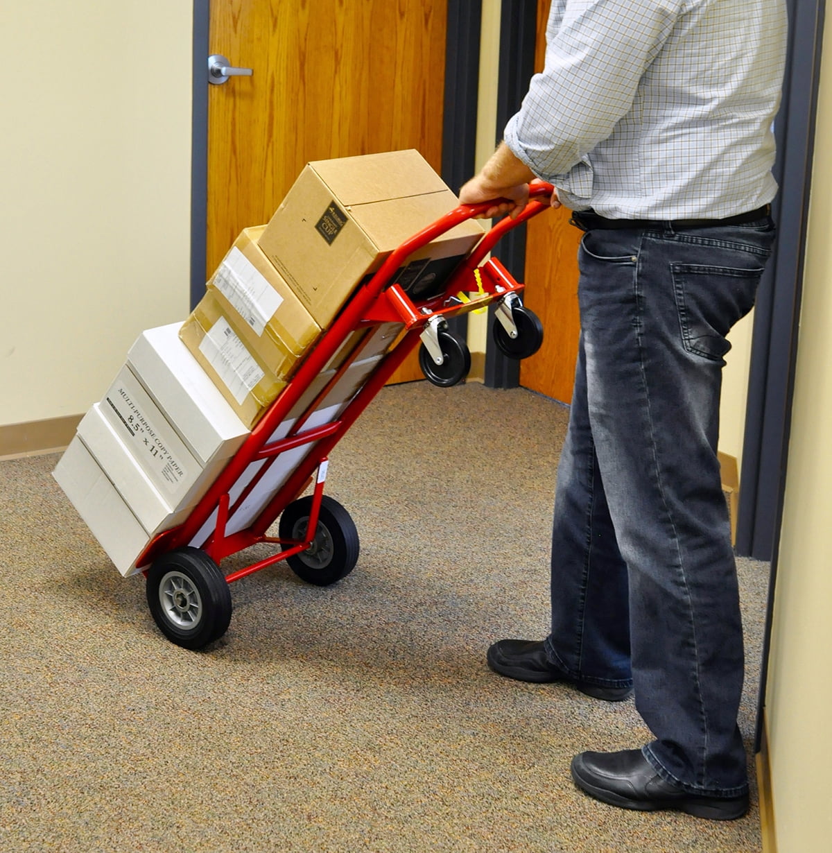 Milwaukee 600 lb. Capacity 2-in-1 Convertible Hand Truck Heavy duty hand truck converts from 2-wheel vertical to 4-wheel horizontal orientation Flow back handle for 1- or 2-hand operation Wheel guards protect the load from the tires 8″ puncture-proof tires that never go flat 4″ swivel casters for increased maneuverability while horizontal Capacity: 600 lbs Ideal for moving many large, heavy objects easily, including those with awkward shapes Powder-coated finish Fully assembled