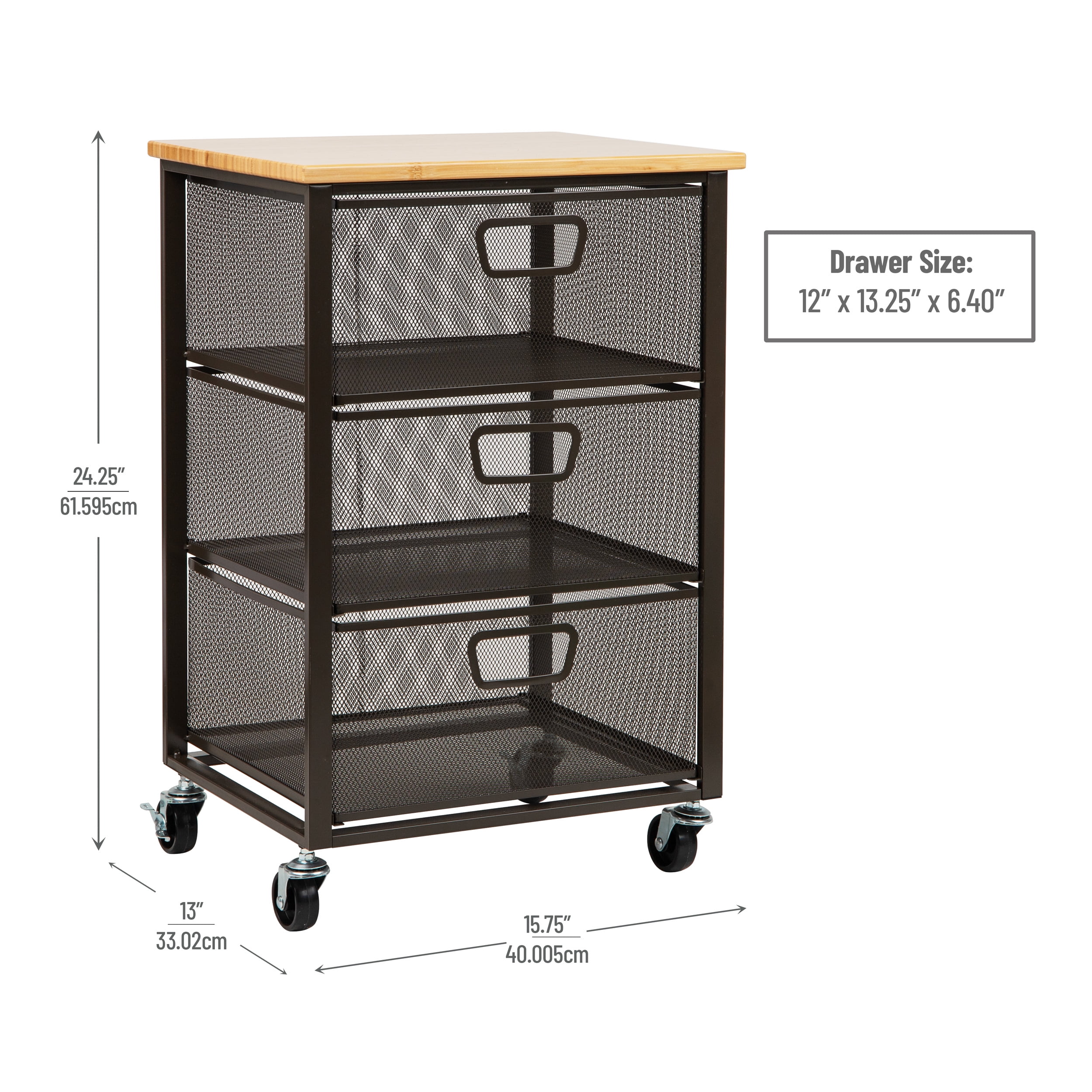 Stylish organization: Modern mesh design with a smooth wood top suits any office or work-from-home space Multi-purpose drawers: Great for storing supplies, documents, tech accessories, or creative tools Mobile convenience: Four caster wheels allow for easy movement across rooms or workstations Durable construction: Metal mesh drawers and frame are built for long-term use with minimal maintenance Compact dimensions: Measures 15.75″L x 13″W x 24.25″H (40.01 x 33.02 x 61.6 cm) and weighs 11.2 lbs (5.08 kg)