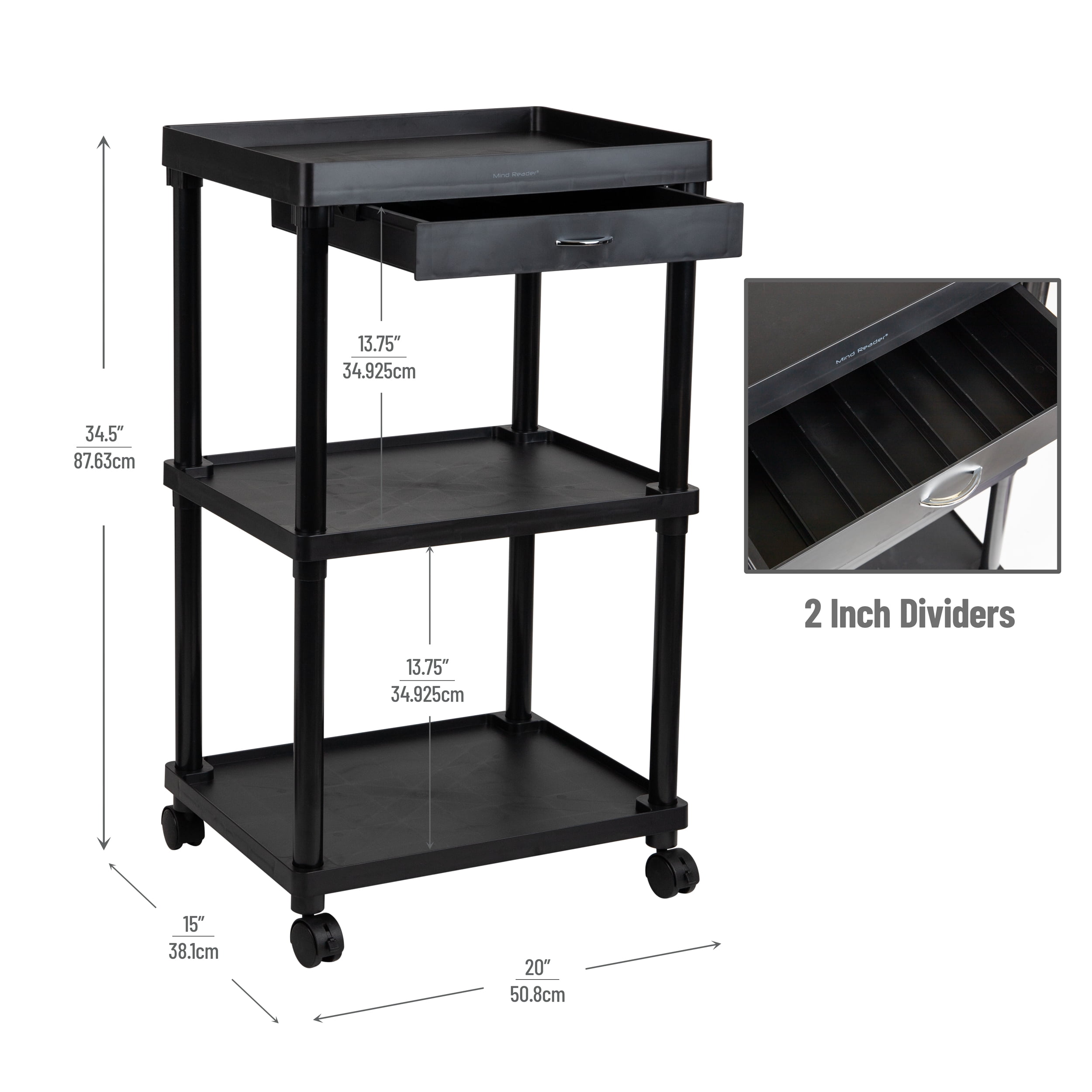 Versatility and Functionality: Whether you need it for your home or office, this cart offers versatility for various purposes. It can be used as a printer stand, a beverage station, or for storage in your kitchen or bathroom Easy Mobility: With a lightweight design weighing only 9.4 lbs (4.26 kg) and four sturdy wheels, this cart can be easily moved from room to room, allowing you to use it wherever you need it Ample Storage Space: The cart features three levels of storage and a convenient drawer, providing plenty of space to organize and store your items. Keep your belongings neat and easily accessible Sturdy and Easy to Clean: Made with durable materials, this cart is designed to handle various storage needs. It can be easily cleaned with a damp cloth and mild soap, ensuring its longevity and cleanliness Space-Saving Design: Measuring 20 inches (50.8 cm) long, 15 inches (38.1 cm) wide, and 34.5 inches (87.63 cm) tall, this cart is compact and fits easily in small spaces, making it a practical storage solution