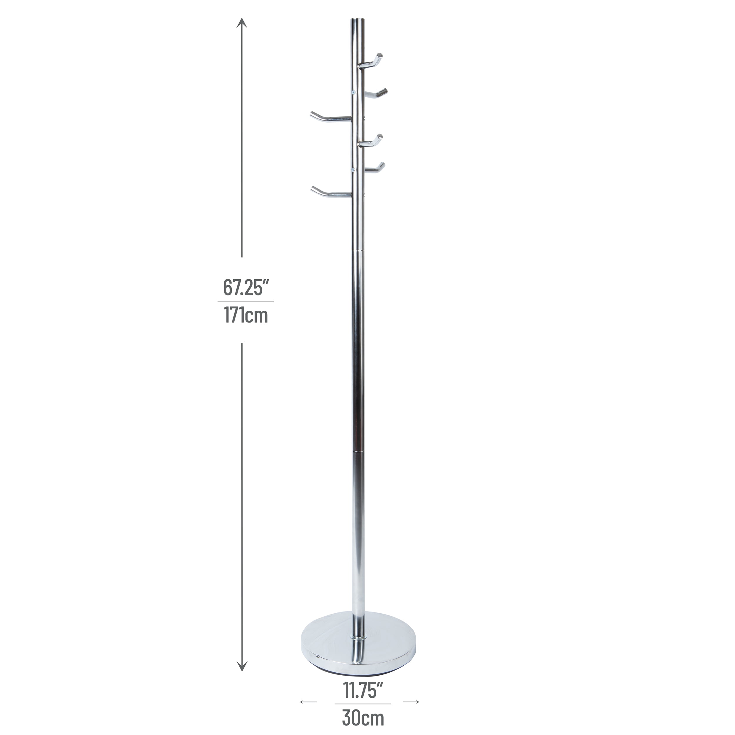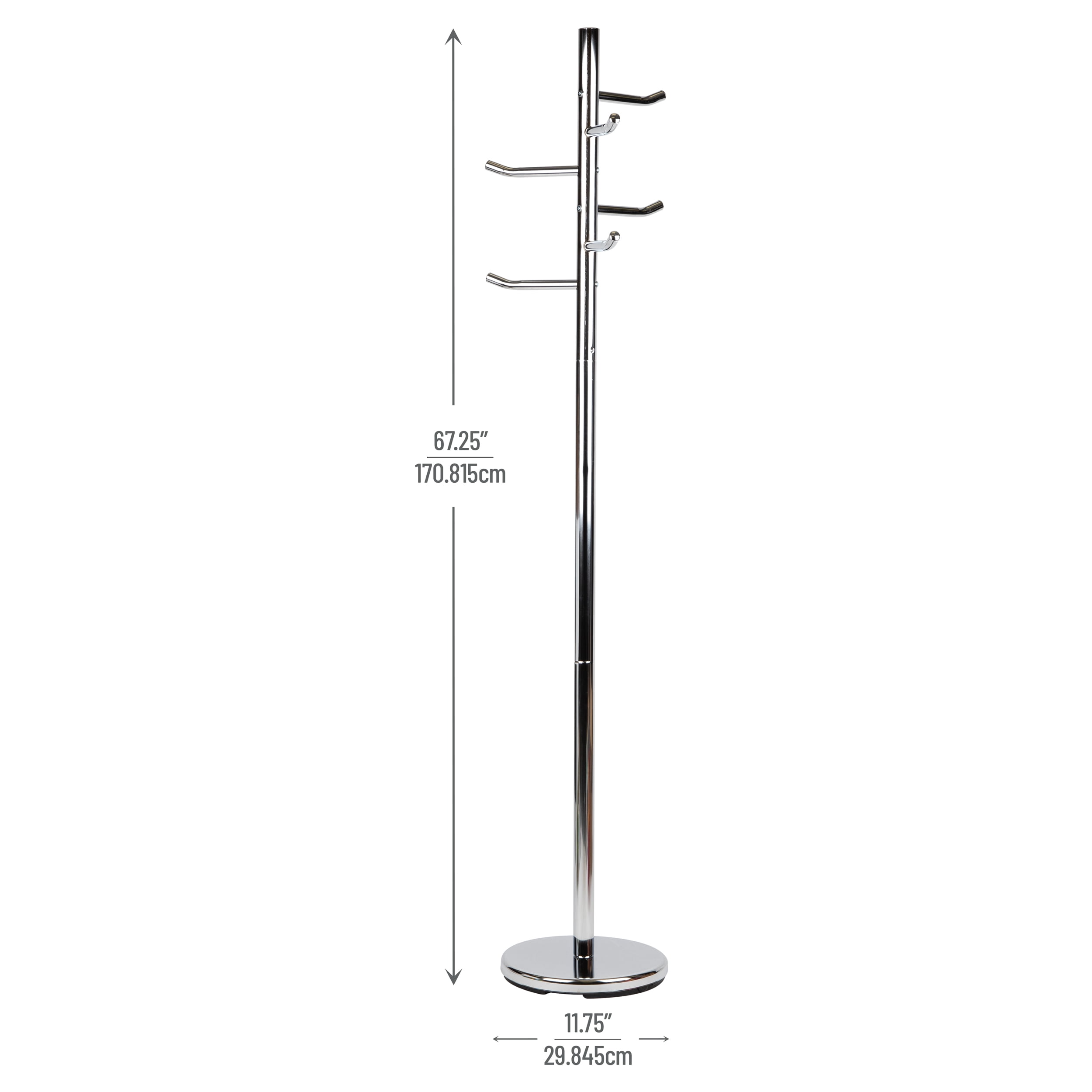 Ample Storage Space: Features six sturdy hooks that each hold up to 4.4 lbs (2 kg), with a total capacity of 26.4 lbs (12 kg), perfect for coats, hats, purses, and more Space-Saving Vertical Design: Tall, freestanding structure maximizes floor space while offering accessible storage for daily essentials Portable and Lightweight: Easily move this coat rack around your office or home thanks to its manageable weight and balanced frame Sleek and Minimalist Style: The simple metal design in a modern silver finish blends effortlessly into any office or entryway décor Compact Dimensions: Measures 11.75″L x 11.75″W x 67.25″H (29.85 x 29.85 x 170.82 cm), offering a slim footprint for tight spaces like corners or hallways