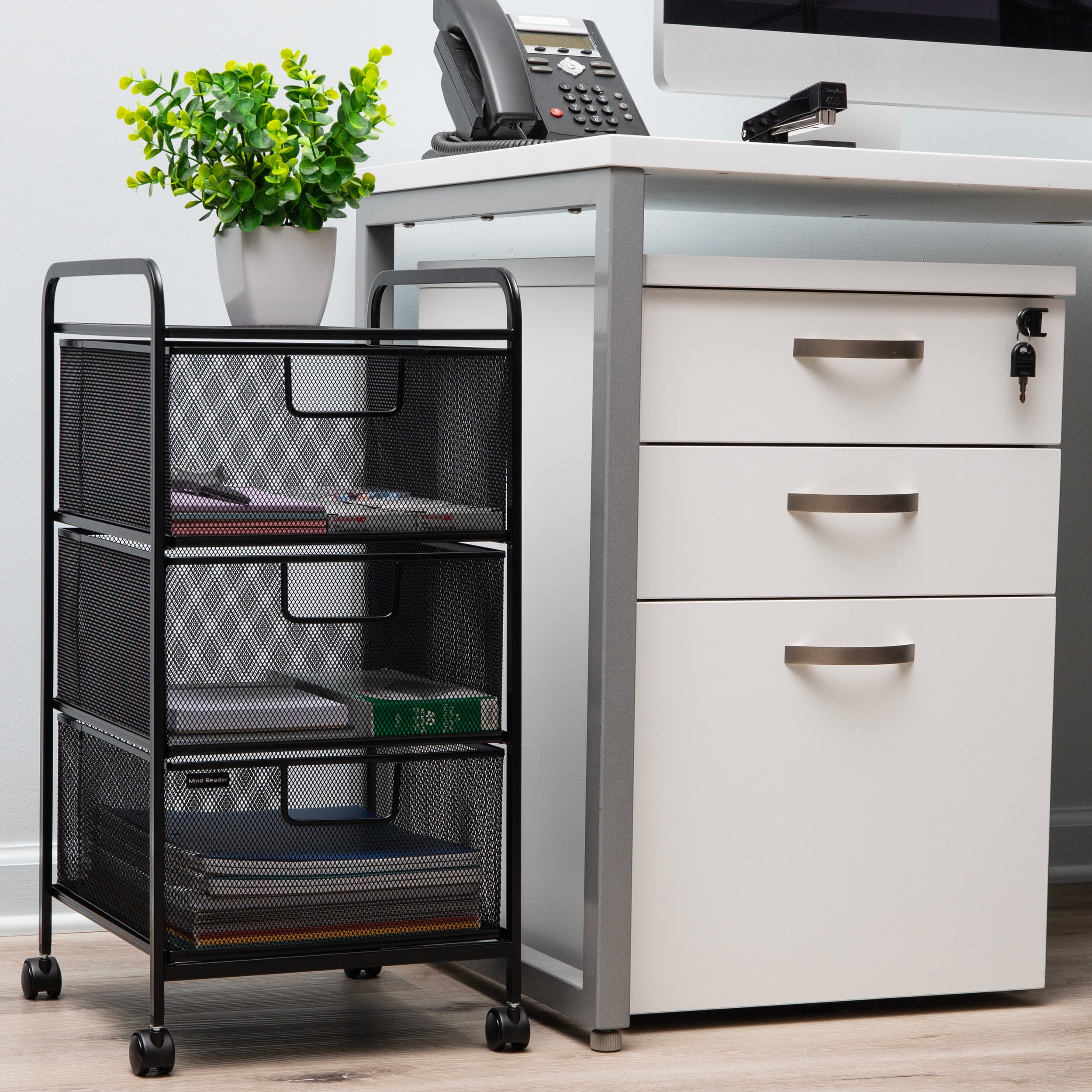 Minimalist design: The modern mix of mesh and solid metal framing is attractive. This cabinet comes assembled with the wheels packed separately, to attach simply push in place or you may choose to use the cabinet without the wheels Saves space: The slim design includes three removable drawers to organize your small desk items, books, and pads. Each drawer measures 11″ long by 12.75″ wide by 6″ deep (27.94 x 32.39 x 15.24cm) Easy to move: With four caster wheels, you can move this organizer to your desk, closet, or another room with ease Durable and easy to clean: This rolling file cabinet is made with durable materials and is easily cleaned with mild soap and a soft cloth Dimensions: This cabinet measures 12.75 inches long by 13.25 inches wide by 25 inches tall (32.39 x 33.65 x 63.5 cm) and weighs just 7.16 lbs (3.25 kgs), this cart is the perfect size for maximizing space without sacrificing functionality