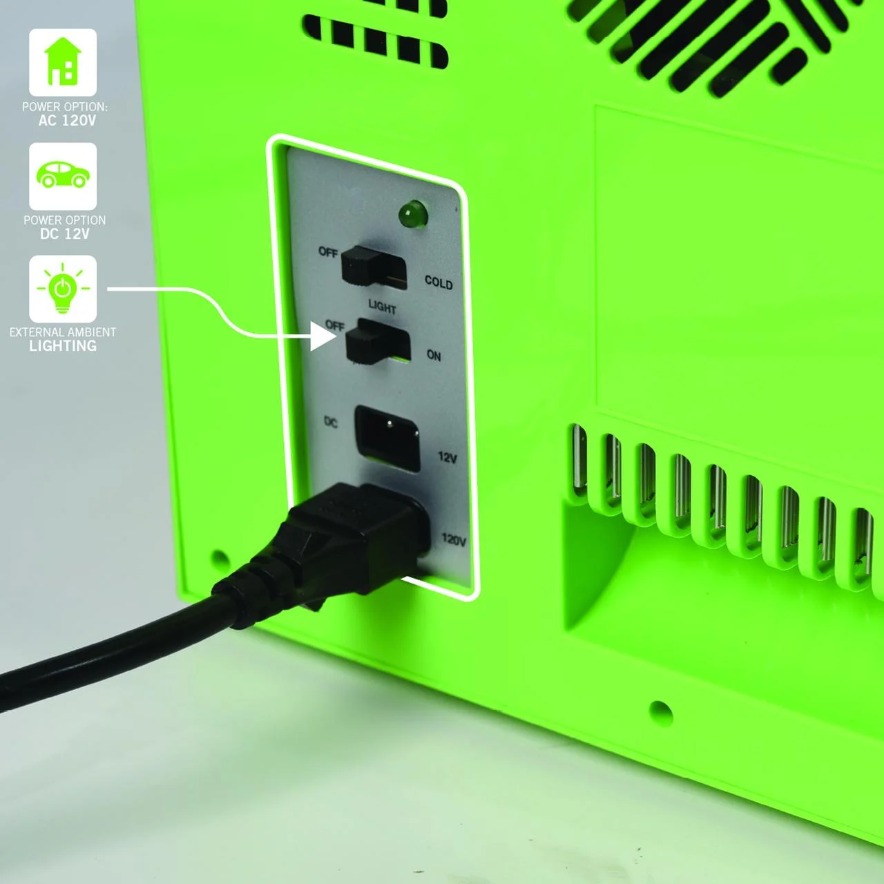Official Minecraft Merchandise (Creeper) 6.7L Capacity, Holds Up To 9 355ml (12oz) Cans Product Dimensions10.4 in (H) X 10 in (W) X 10 in (D) Cools Items Up To 36℉ (20℃) Below Ambient Temperature Green Thermoelectric Technology AC DC Voltage Allows You To Use The Cooler In The Car, RV, Truck External Door Lights Up Green, Internal Green LED Light Removeable Drip Tray x2 Removeable Shelves (1 Door Shelf, 1 Main Compartment Shelf)
