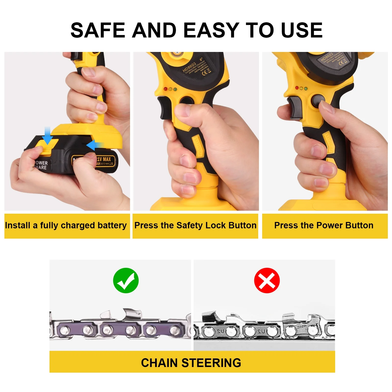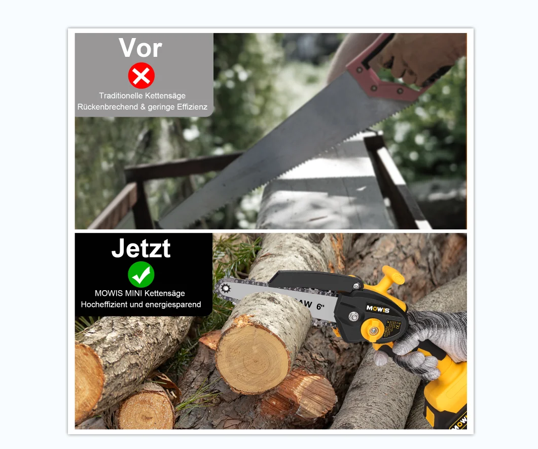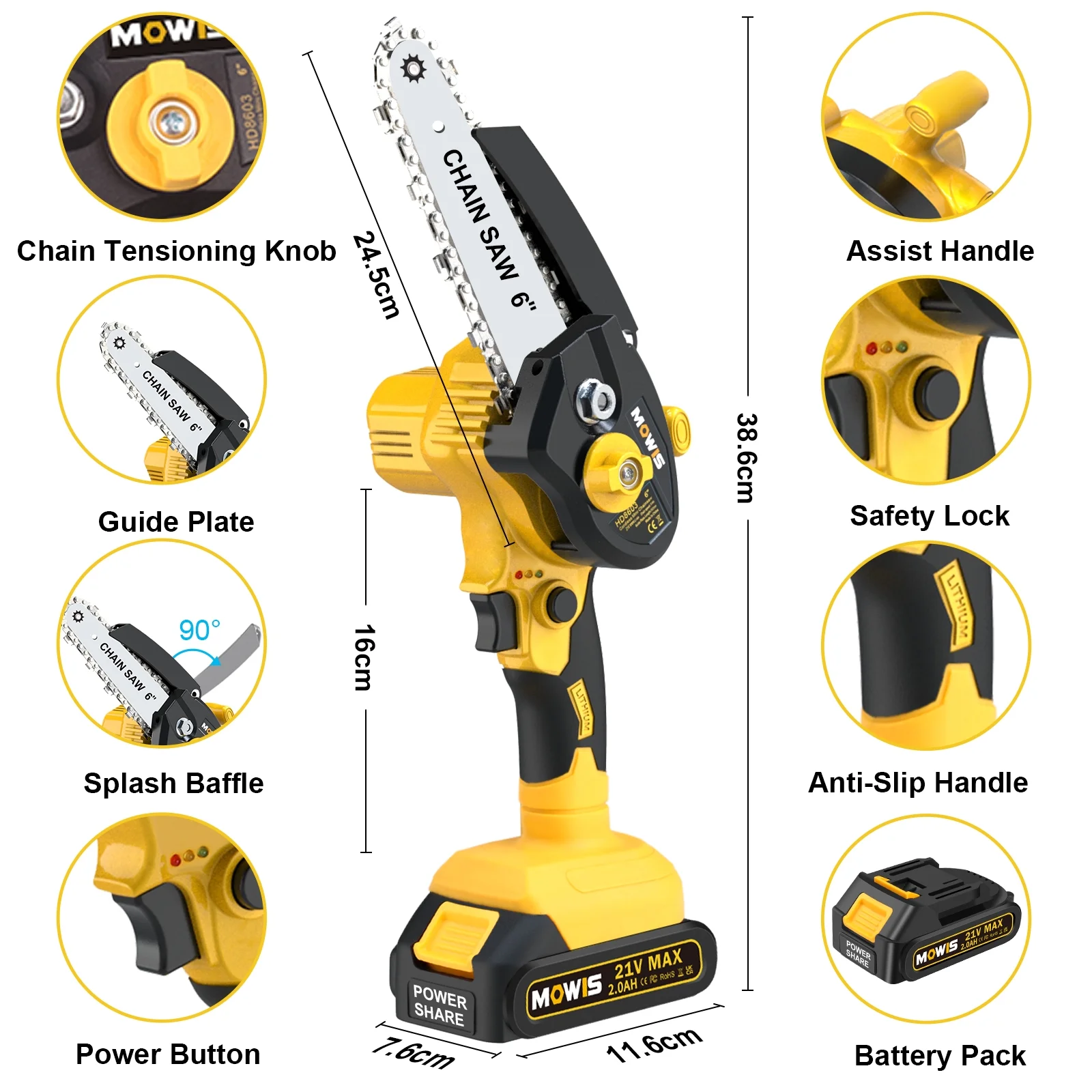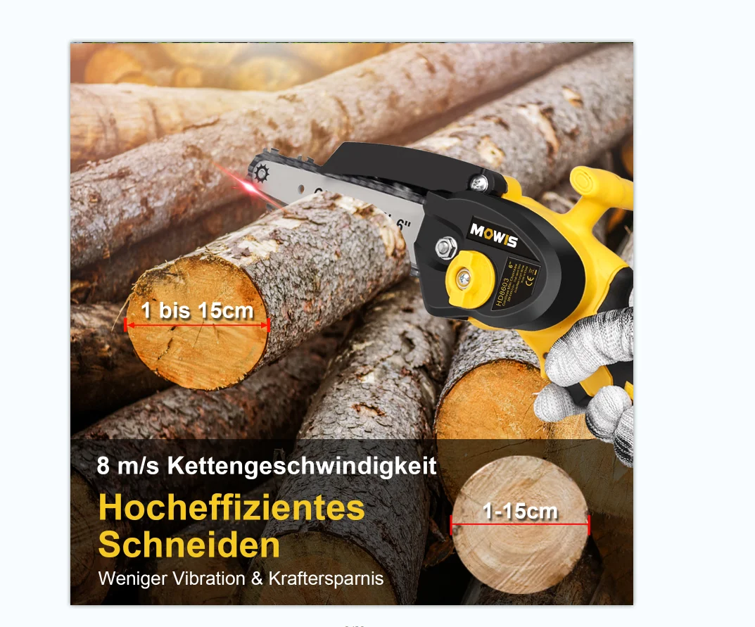 EASY TO CARRY – Weighs about 2.7lb, handheld design with a slim body makes it very easy to control and comfortable to hold. Comes with a toolbox that can store all tools and accessories perfectly, making it convenient and easy to carry and store. WIDE APPLICATION: MOWIS 6 inch cordless chainsaw is ideal for wood cutting, gardening pruning, branch pruning, bush pruning, etc. It is a perfect tool for gardens, farms, forests, parks, pastures, greenhouses,s and orchards. UPGRADED PURE COPPER MOTOR – The cordless power chain saw is adopted with an upgraded powerful pure copper motor, which can provide a longer running time, greater torque, and greater power, thereby reducing wear and extending tool life. LARGE RECHARGEABLE BATTERY PACK – MOWIS mini chainsaw comes with two removable and rechargeable 21V 2000mAh lithium battery packs, backup battery can be replaced anytime when the other is dead. Equipped with self-overload and temperature protection that can provide a much longer battery life. PERFECT GIFT CHOICE – Our mini chainsaw is the best gift choice for a father, mother, boyfriend, and DIYer. We have confidence in our product, we provide a 30-day return and a 1-year warranty, if you have any questions about the product, please contact us at any time. Package Included: 1* Mini Chain Saw 2* Chain 2* Battery 1* Pair Glove 1* Guide Plate 1* Chain Cover 1* Power charger 1* Nut Driver 1* User Manual 1* Carry Case