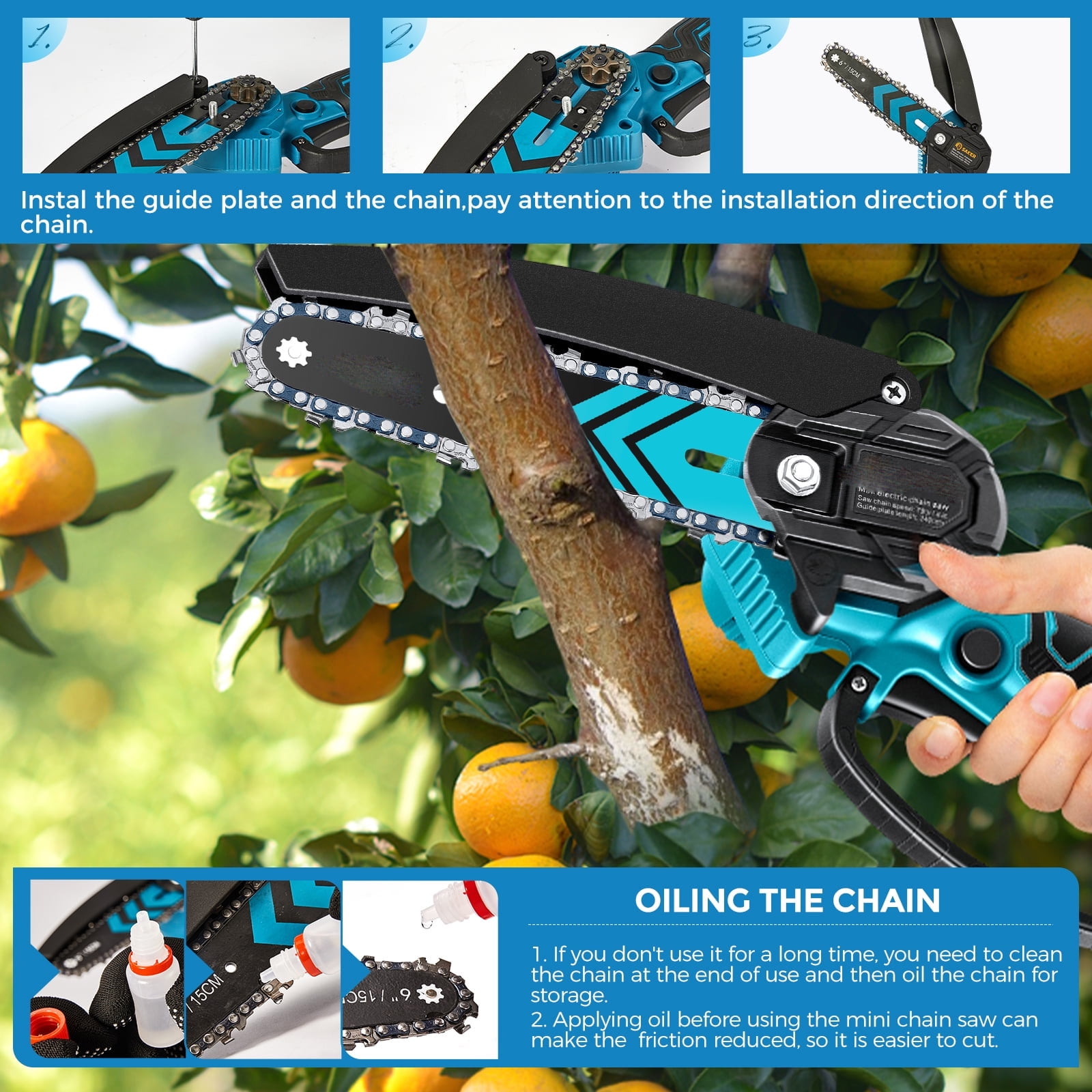⚡ Brushless Motor Technology • 900W output power (equivalent to gas models) • 11m/s chain speed for fast, clean cuts • Handles logs up to 15cm (6″) diameter Dual-Battery System • 2x 21V 2.0Ah lithium-ion batteries • 30-40 mins continuous runtime • 50% more power than standard 18V models Smart Lubrication System • Automatic oiling for reduced friction • 100ml transparent oil tank (easy monitoring) • Extends chain life by 3X Ultimate Safety Features • Dual safety switch (prevents accidental starts) • Protective chain cover • Low-kickback design Tech Specs: • Bar Length: 8″ (20cm) • Chain Speed: 11m/s • Charging Time: 60 mins • Oil Capacity: 100ml