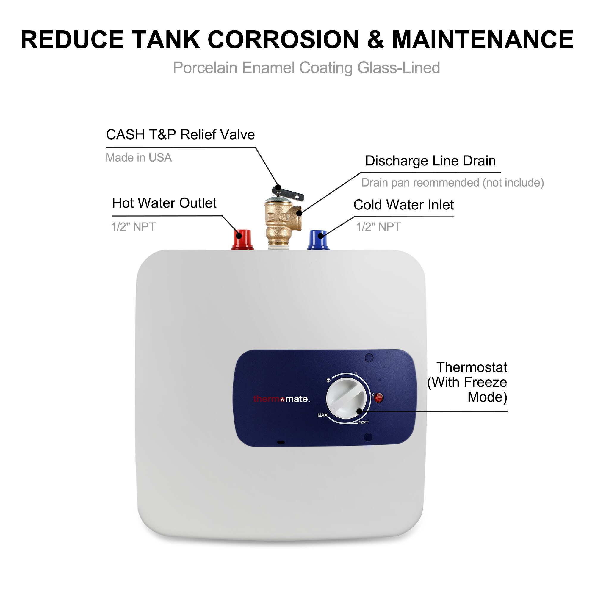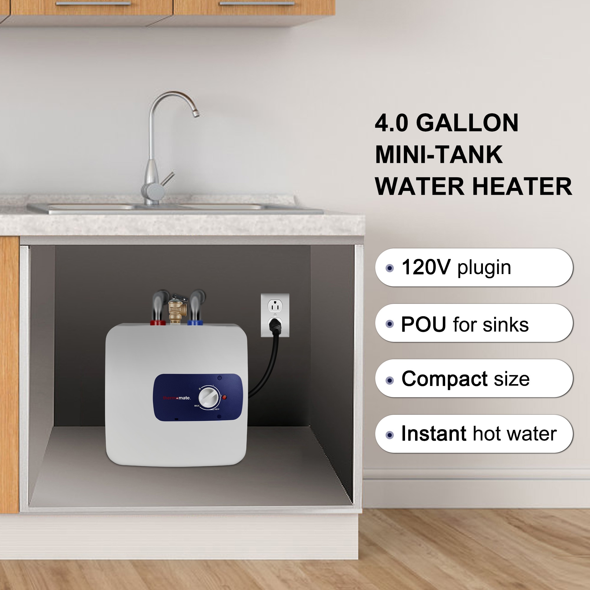 thermomate ES400 4.0 gallons electric mini tank water heater delivers hot water right where you need it, from your garage or outdoor kitchen to your recreational vehicle, this little problem-solver brings the warmth wherever you go. Save water by eliminating the wait for hot water to reach the faucet. Simply tap into the water line and install the heater directly at the sink. No need for costly recirculating lines and pumps. Lightweight and compact, this unit plugs into a standard 120 V outlet.