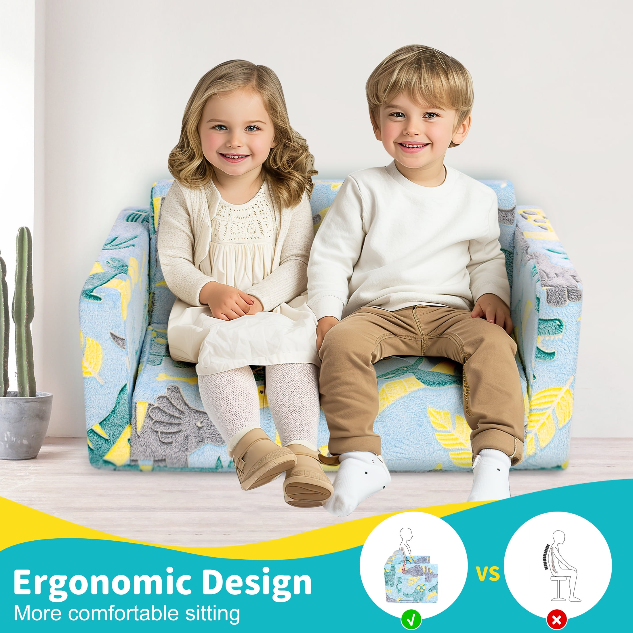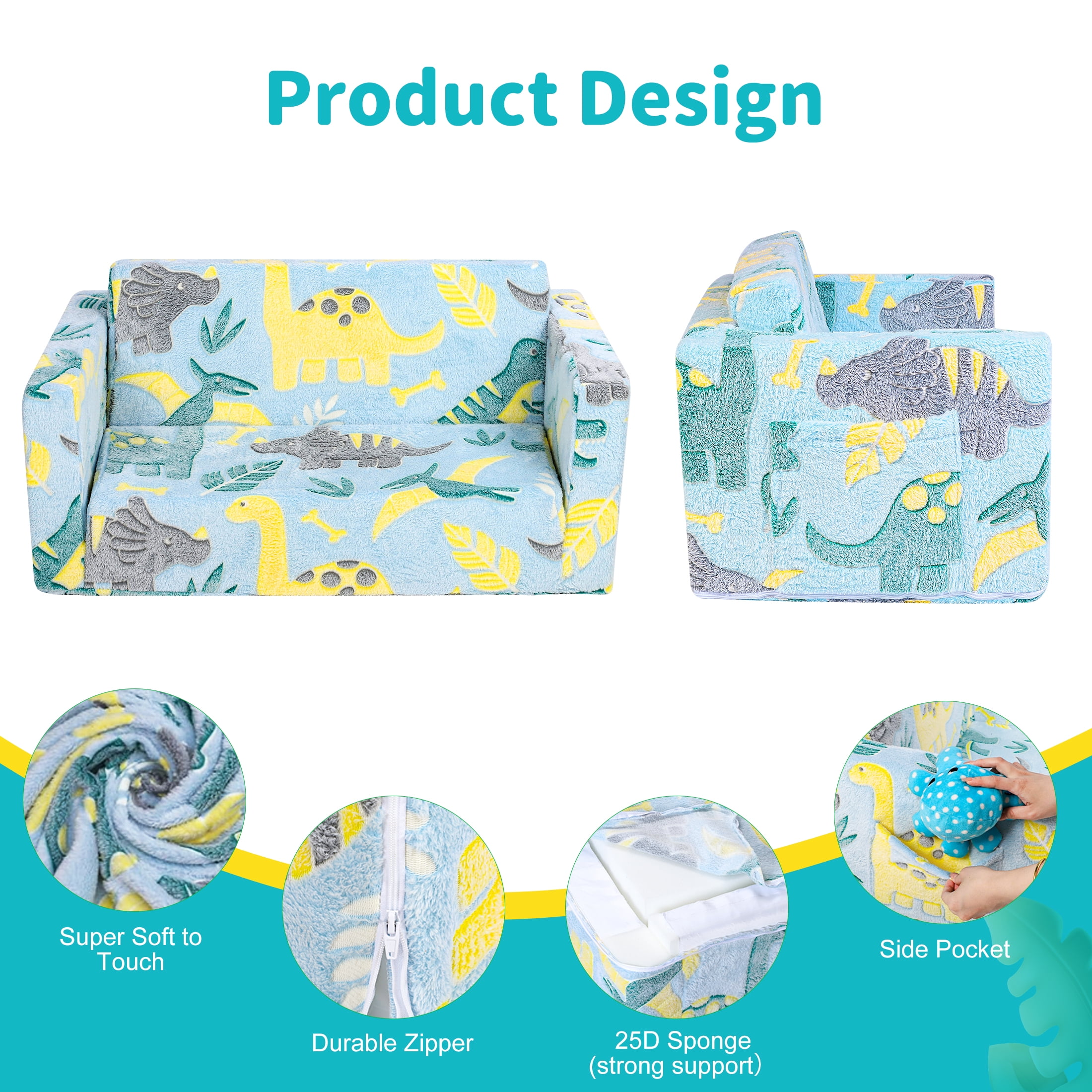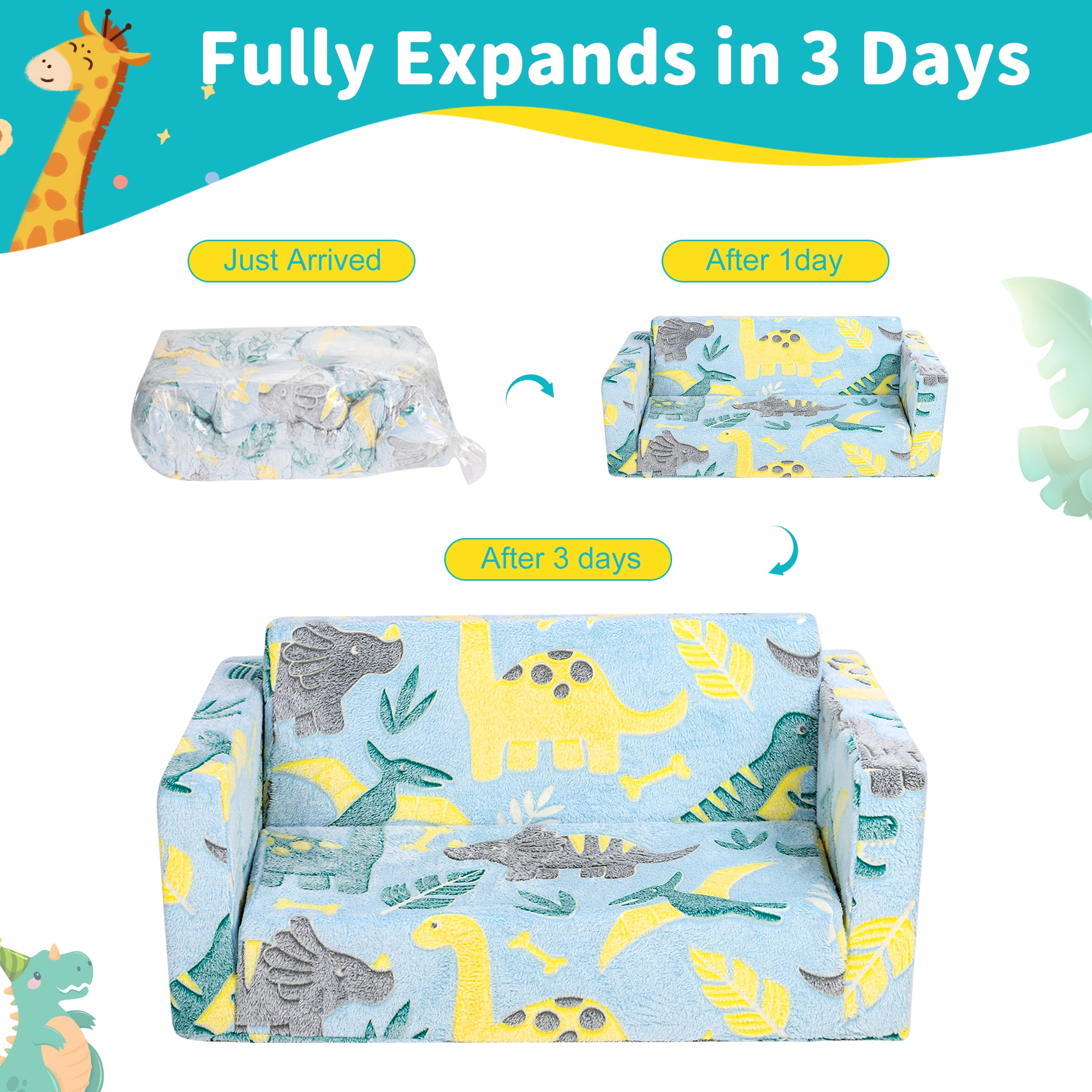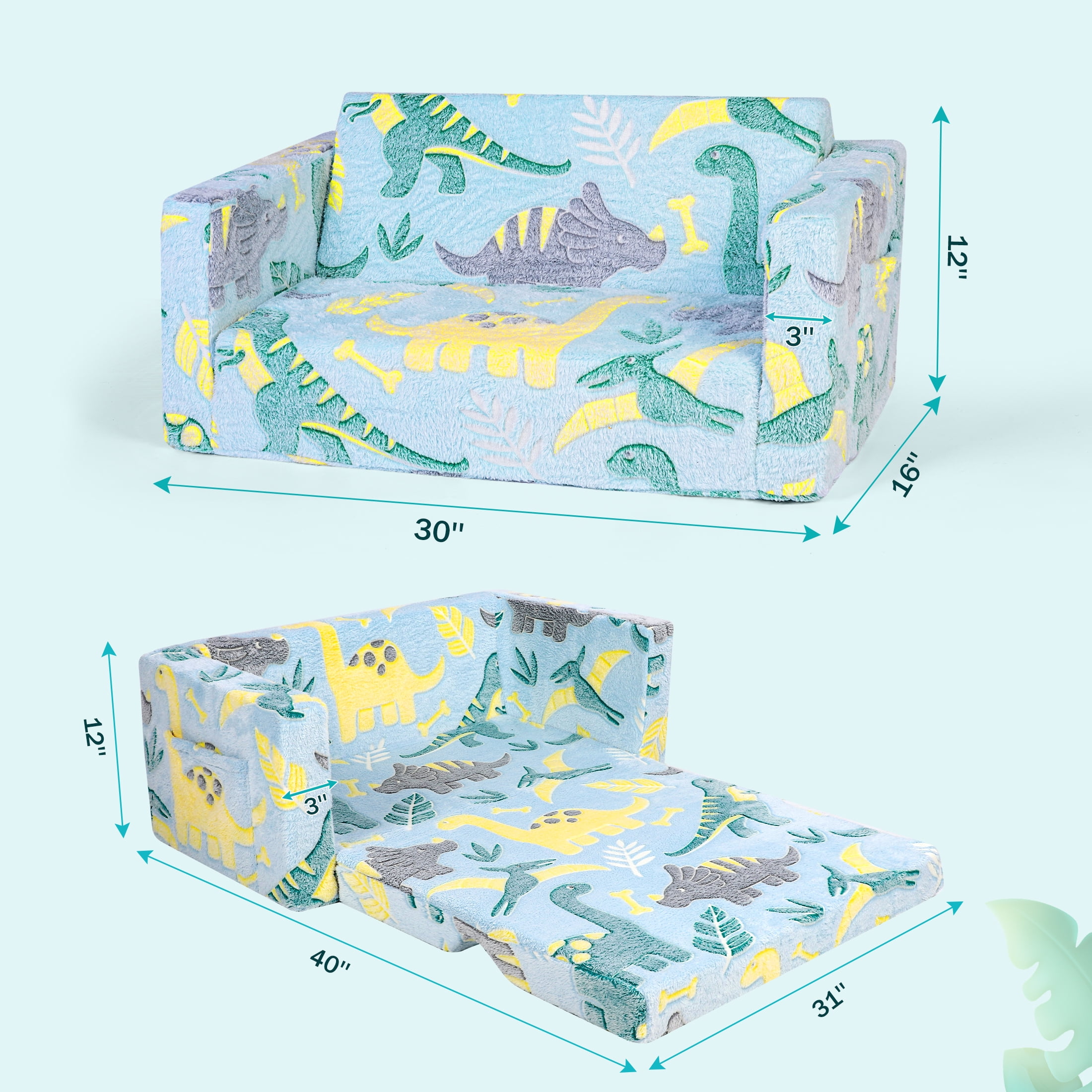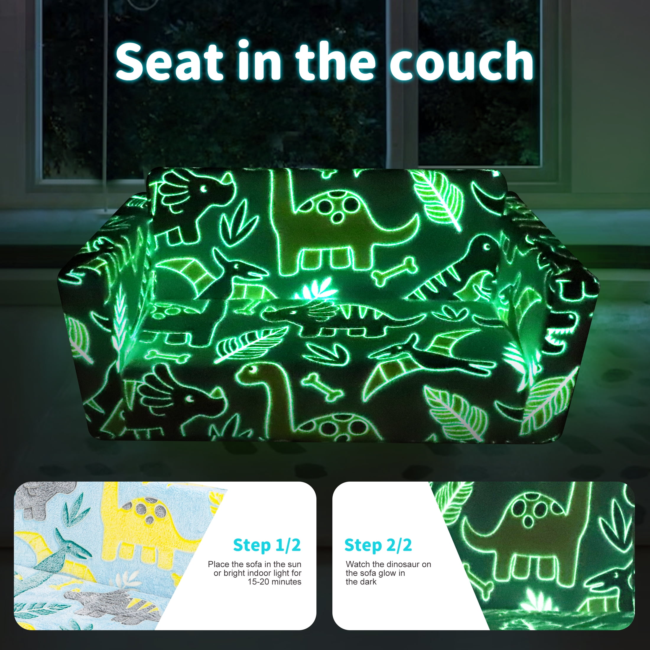 【2-in-1 Kids Couch Design】This kids sofa have a convertible design. Pull out the folding chair and it can be easily turned into a toddler recliner sofa.The baby sofa size is 30″x16″x12″,the kids couch Flipped Open is size at: 40″x31″ x12″,Comfortably fits 2 small toddler. Suitable for boys and girls to play toys and take naps indoors. 【Glow in the Dark Feature】The unique and bright fluorescent dinosaur pattern can attract children’s attention and stimulate their imagination and creativity. To witness the magic shine, simply set the toddler chair in bright light or sunlight for 10 to 15 minutes. The strength of a light’s glow in the dark increases with its brightness. This foldout kids couch is the ideal present for a birthday, Christmas, or baby shower. 【Toddler Friendly Design】This toddler chair filled with high-quality 25D soft foam padding to support 1-2 toddler and enjoy their time on toddler chair.The kids pull-out kids recliner is designed with safety in mind, with no sharp corners and hard edges. 【Ready for Fun Right Away】Our kids chair sofa is vacuum sealed and requires no assembly, when you receive the product, open the bag and allow 3-5 days for the kids sofa to return to its original shape.You’ll be amazed to witness a kids couch that’s five times larger than the initial packaging. 【Service &Care Instructions】The folding toddler chair can be removed and cleaned in the machine. It can also resist fading, shrinking and falling off. After washing, make sure that kids chairs are always in a good state. any questions about the product, please feel free to contact the customer support team. ✅How to Glow at Night: simply set the toddler sofa in bright light or sunlight for 10 to 15 minutes. The strength of a light’s glow in the dark increases with its brightness. ✅Kids Sofa Specifications: Net Weight: 2.8 kg/6.17 lbs Weight Limit:18KG/39.6lbs Seating Capacity:1-2 toddler Style:glowing dinosaur Toddler Chair Size: 30″x16″x12″ Kids Couch (fully extended) Size: 40″x31″ x12″ Materials:25D sponge,luminous fabric Special Feature:foldable kids couch,convertible sofa to toddler recliner Recommended Uses For Product:reading,sleeping Product Care Instructions:cold water,gentle cycle,no bleach,no Ironing,regular detergent,tumble dry low heat or air dry
