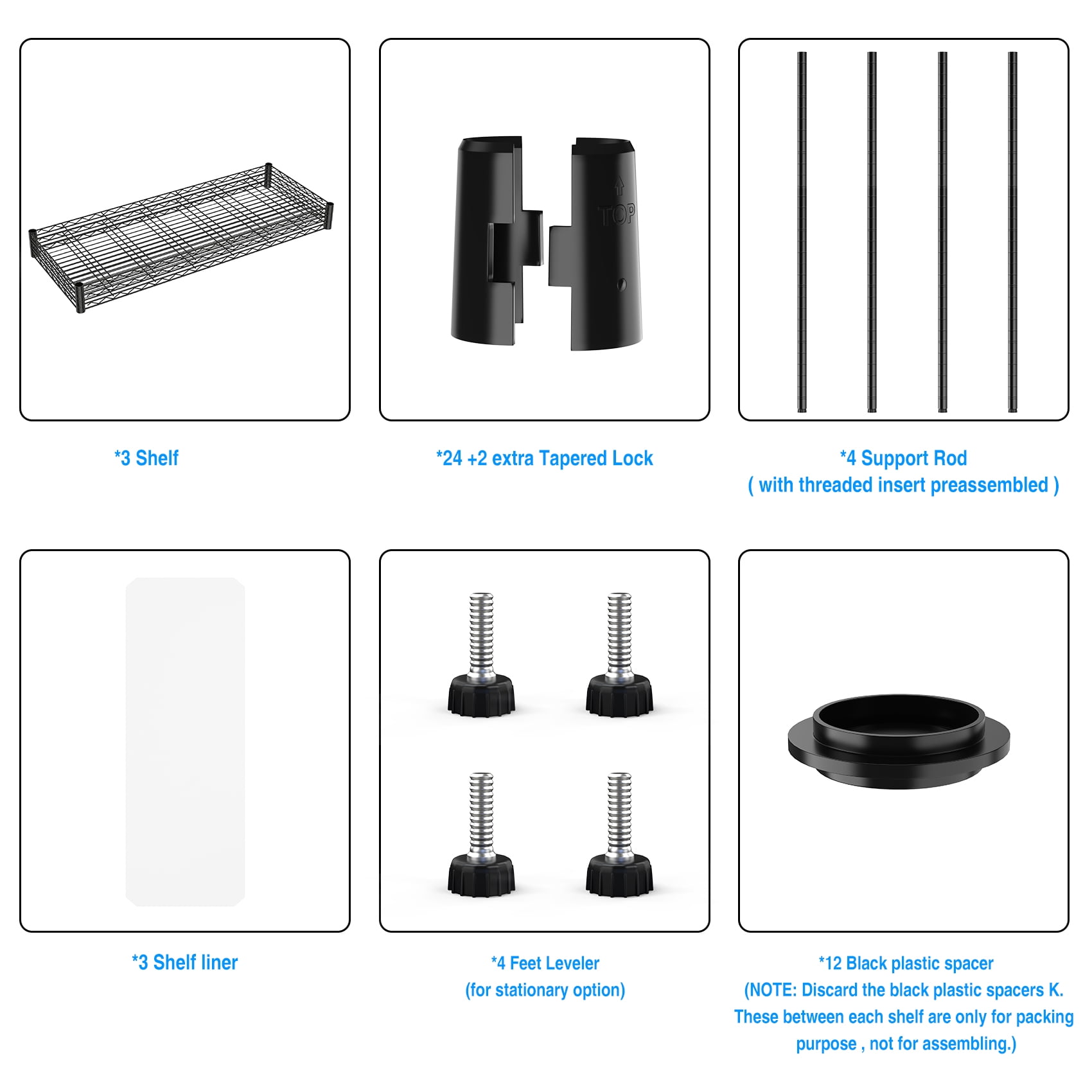3 TIER LARGE CAPACITY: Heavy duty shelving with leveling feet – each layer shelf can hold 350lbs (evenly distributed), maximum load capacity is 1050 lbs. It is recommend that heavy items on the bottom shelf for maximum stability. Transparent liners colors allow you to add a pop of color to your life. Shelf Liners is waterproof – Won’t get damaged from exposure to moisture. ADJUSTABLE DESIG: Each shelf can adjustable in 1-inch increments, adjust the shelf height according to size of the item, meet your different needs, get the best utility shelf. EXTREMELY DURABLE: Wire shelving made of heavy steel, it has excellent rust resistance and oxidation resistance. Our wire shelf liner is crafted to provide unparalleled quality, longevity, function and beauty. Better quality thicker than the competition. The 3 tier shelf unit passed NSF certified, safe and reliable. Storage rack are perfect addition to home, office. EASY MOVEMENT: 3 tier garage shelves have 4 leveling feet. Wire rack on leveling feet can be easily positioned in supermarkets, garages, closets, kitchens, porch, pantry, etc. Height-adjustable leveling feet can be placed on uneven ground- simply twist to stabilize. Non-slip, will not scratch ground. Product Information Product Type: Shelving Unit Finish: Black Frame Material: Steel Shelves Included: Yes Number Of Shelves: 3 Adjustable Shelves: Yes Shelf Material: Steel Shelf Finish: Black Supplier Intended and Approved Use: Residential Use Room Use: General Weight Capacity: 1050 lb. Shelf Weight Capacity: 350 lb. Assembly Required: Yes Mounting / Installation Type: Free-standing Shelf holds up to 350 pounds per shelf when evenly distributed; Total maximum capacity of 1,050 lbs Durable steel construction that is NSF Certified for commercial kitchen use Perfect for attic, garage, kitchen, bathroom, laundry, or office