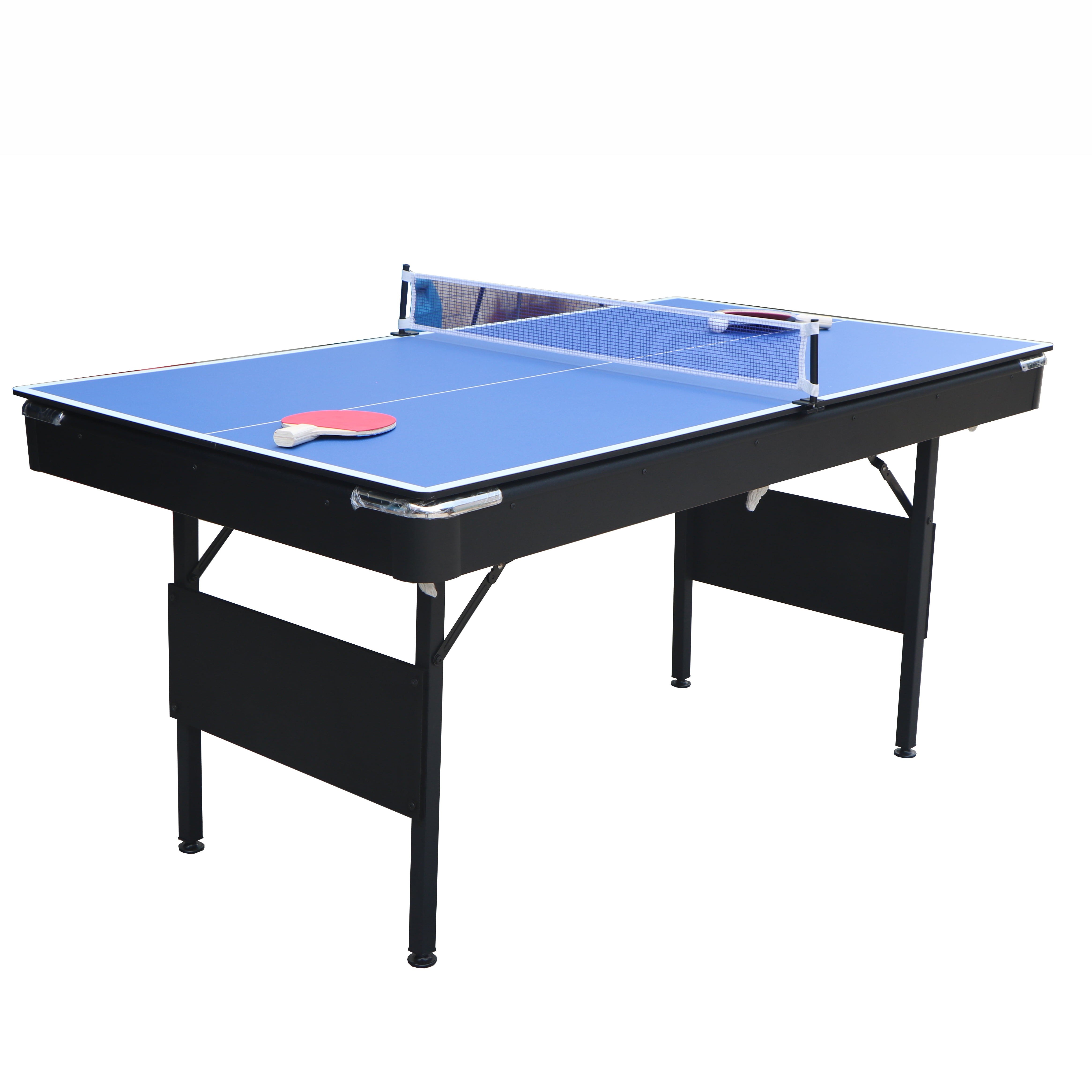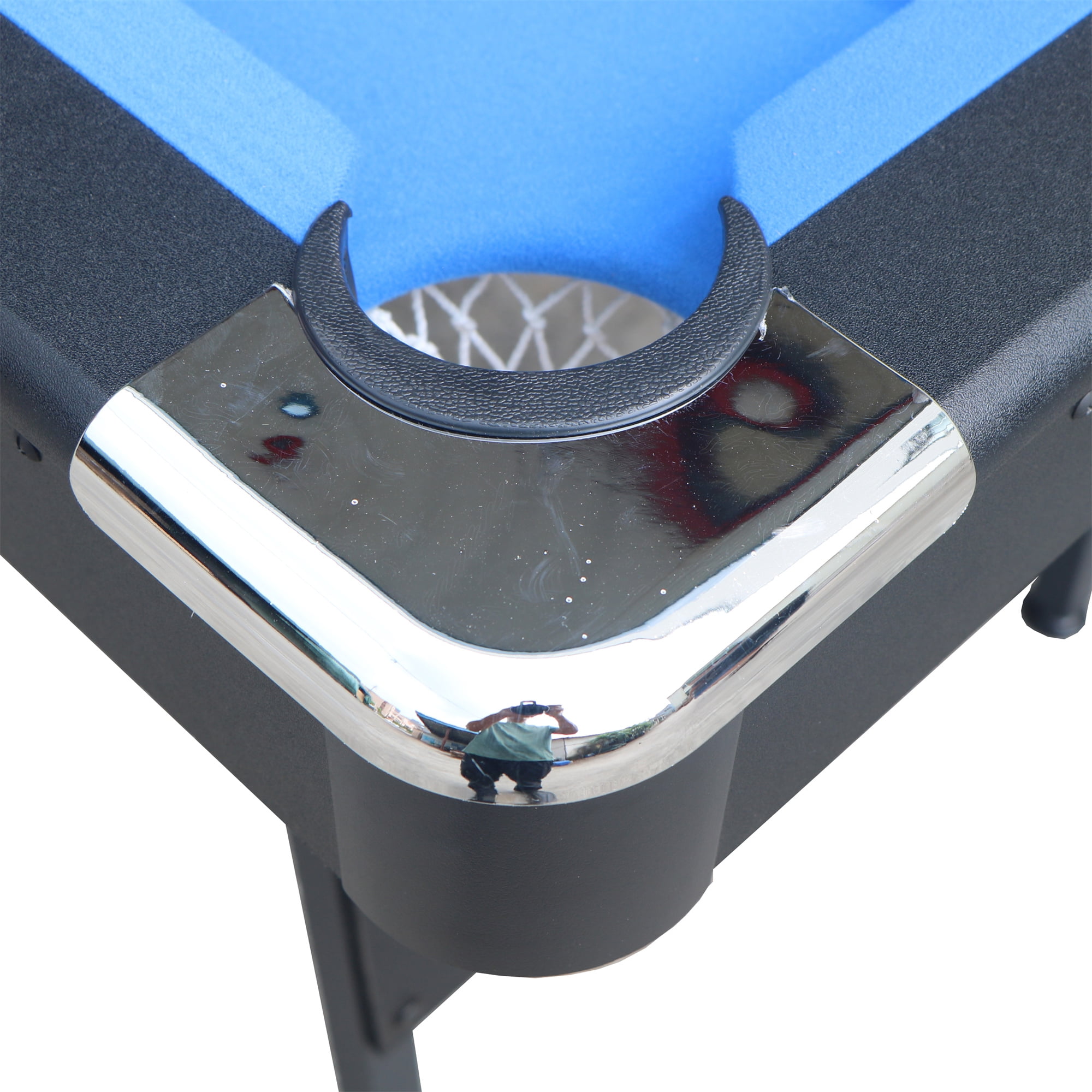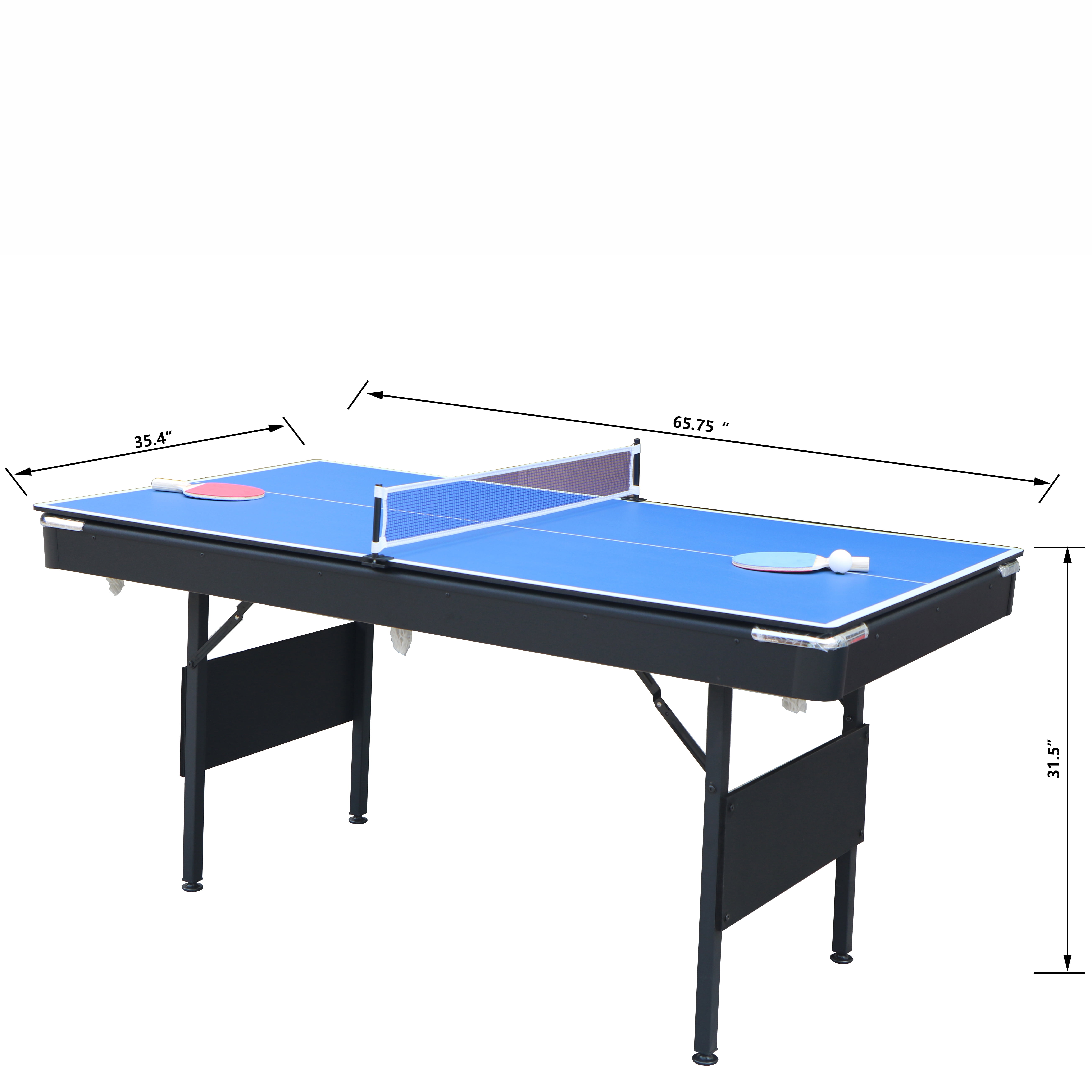 Product Information Product Type: Pool table Table Size: 5.5ft Regulation Size: Yes Frame Material: MDF Wood Indoor/Outdoor Use: Indoor Use Only Ball Collection System: Drop Pockets Foldable/Portable: Yes Multiple Games Included: Yes Table Tennis Conversion Top Included: Yes Pool Cues Included: Yes Number of Cue Sticks Included: 2 Pool Cue Rack Included: Yes Pool Balls Included: Yes Drop Pockets Included: Yes Leveling Legs: Yes Table Brush Included: Yes Chalk Included: Yes Plug-In: No Supplier Intended and Approved Use: Non Residential Use; Residential Use Adjustable leg levelers for quick table leveling on any surface Includes 3 distinct quality games: Billiards, table tennis etc Quick and easy game surface changeover Rugged MDF construction