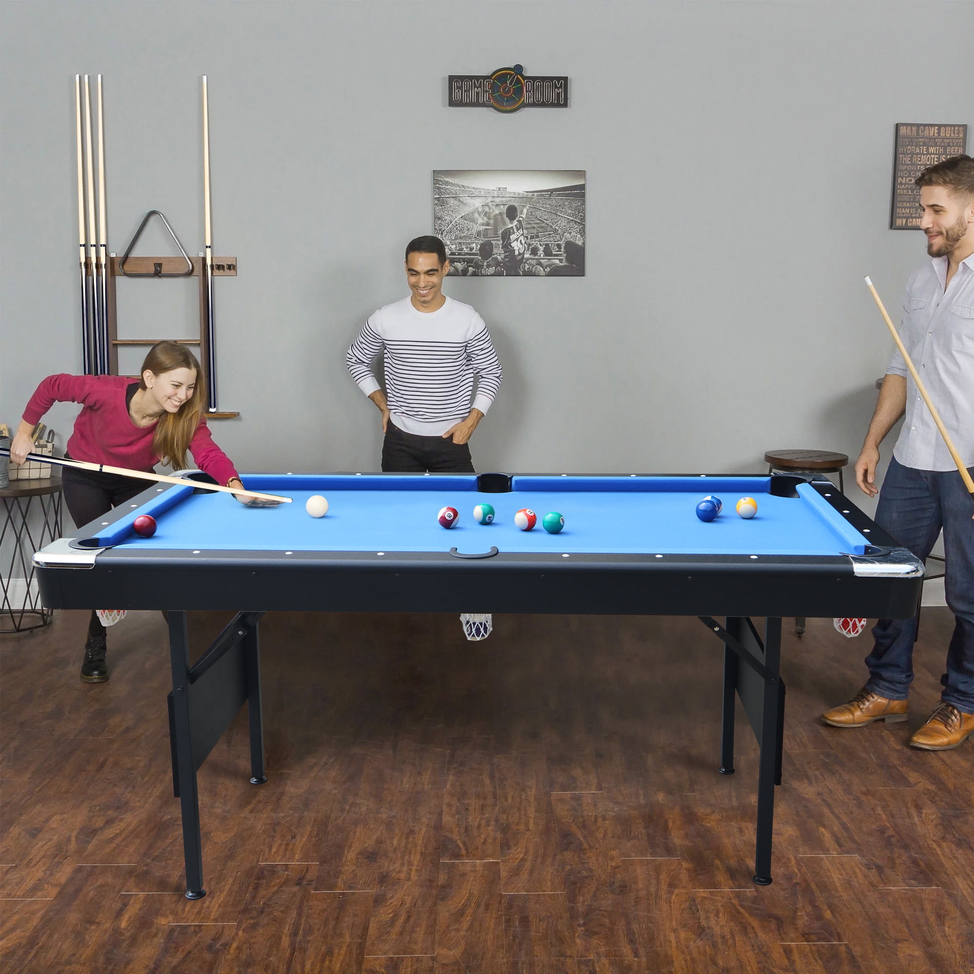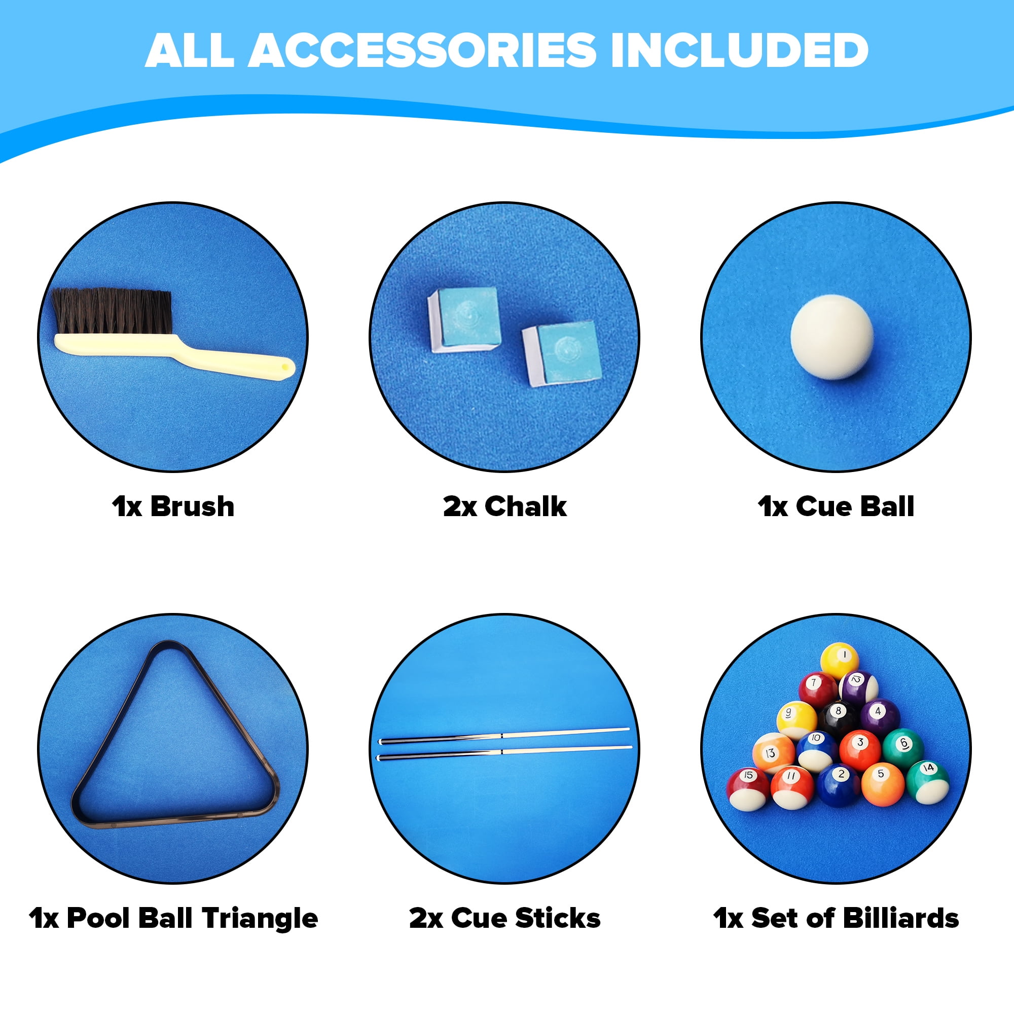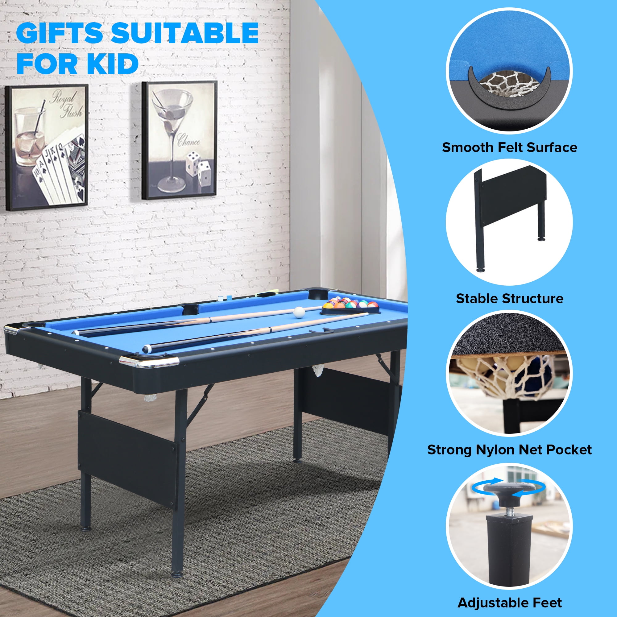 Product Information Product Type: Pool table Table Size: 5.5ft Surface Material: Manufactured Wood Frame Material: Manufactured Wood Cloth / Felt Material: Polyester Cloth/Felt Color: Blue/Green Indoor/Outdoor Use: Indoor Use Only Frame Finish: Black Ball Collection System: Drop Pockets Number of Cue Sticks Included: 2 Pool Cue Rack Included: No Pool Balls Included: Yes Number of Billiard Ball Sets Included: 1 Drop Pockets Included: Yes Drop Pocket Material: Plastic Racking Triangle Included: Yes Number of Racking Triangles Included: 1 Leveling Legs: Yes Table Brush Included: Yes Top Rail/Rail Cap included: Yes Bumpers Included: Yes Chalk Included: Yes Supplier Intended and Approved Use: Residential Use Effortlessly fold and store the table to save space when needed for other activities Enjoy classic pool games with friends and family Sturdy construction ensures the table’s stability during gameplay Provides a smooth and consistent playing experience