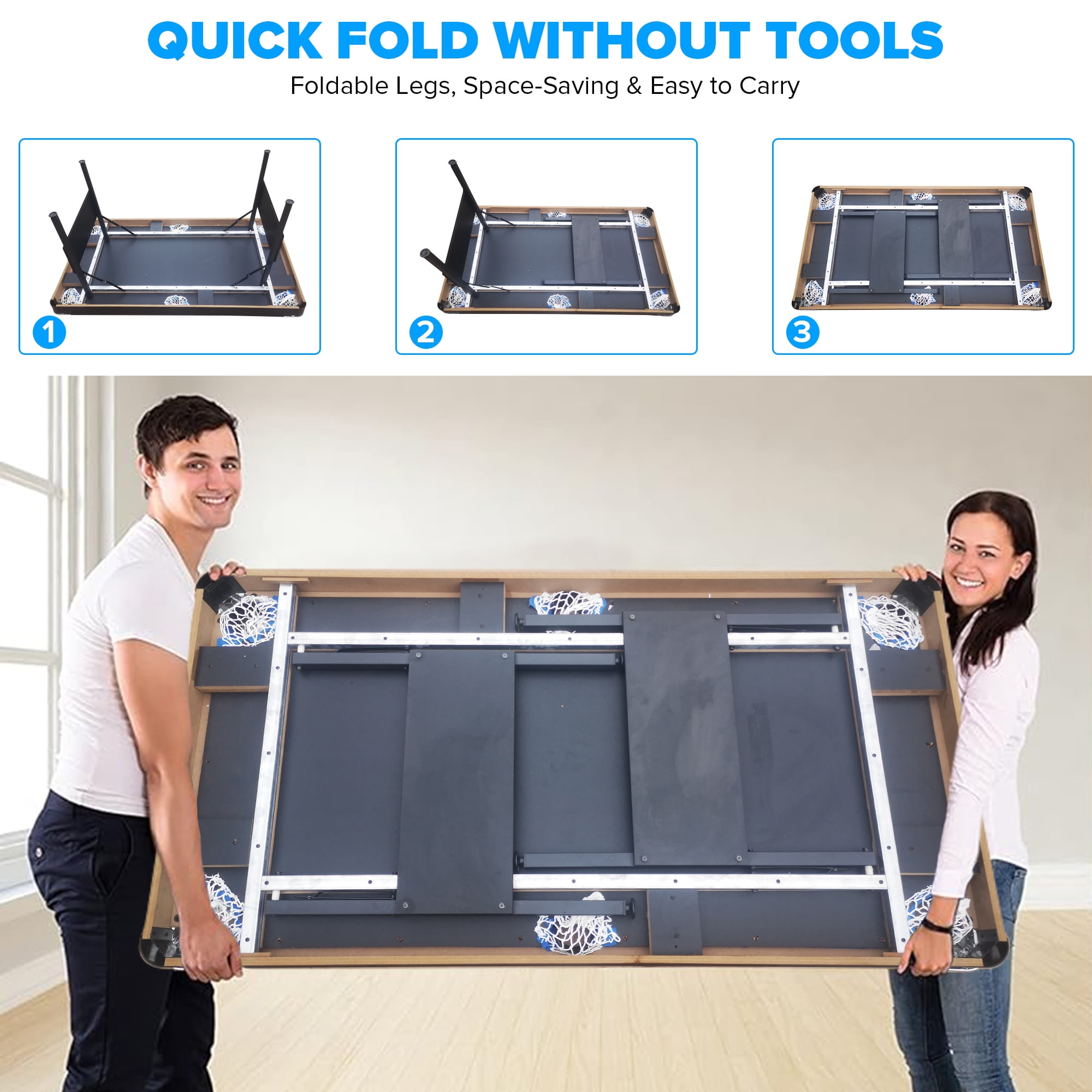 For quick and easy fun, there is none better than the 5.5′ Pool Table with foldable legs. This innovative design couples compact design with surprising portability. For those that are tight on space and want to enjoy their favorite classic table game, the Miniyam is the perfect solution! Featuring high-strength material means not sacrificing quality for space, as the surface of the Miniyam table will be sure to play smoothly and fast. Featuring a sleek blue/green cloth design, this table will complement any decor. FOLDABLE DESIGN & COMPACT STORAGE: With foldable design, this pool table is only 3.5” wide when folded, making it easy to store at any corners or relocate anywhere you want to play billiard. SELECTED MATERIAL & STURDY CONSTRUCTION: Crafted from high quality MDF and thickened sturdy steel legs, this mini foldable pool table ensures great stability and durability. The adjustable and anti-slip foot pads keep the table stable. In addition, the ball collecting net bag is made of cotton thread to support long-term use. COMPLETE ACCESSORIES INCLUDED: This 6ft free-installation billiard game table comes with all accessories you need, including 2 cue sticks, 2 chalks, 1 set of billiard balls, 1 triangle rack, and 1 brush. With these accessories, you can have great fun playing billiards with your family or friends once the folding table is unfolded. PERFECT FAMILY GAME: Miniyam pool table with foldable and portable design is perfect for small space, especially suitable for home. Professional pool table is ideal for all skill level, and will be great a choice for your family time. SAFETY LOCK & AIMING POINTS: The safety locks secure the table legs and avoids accidental folding while playing.