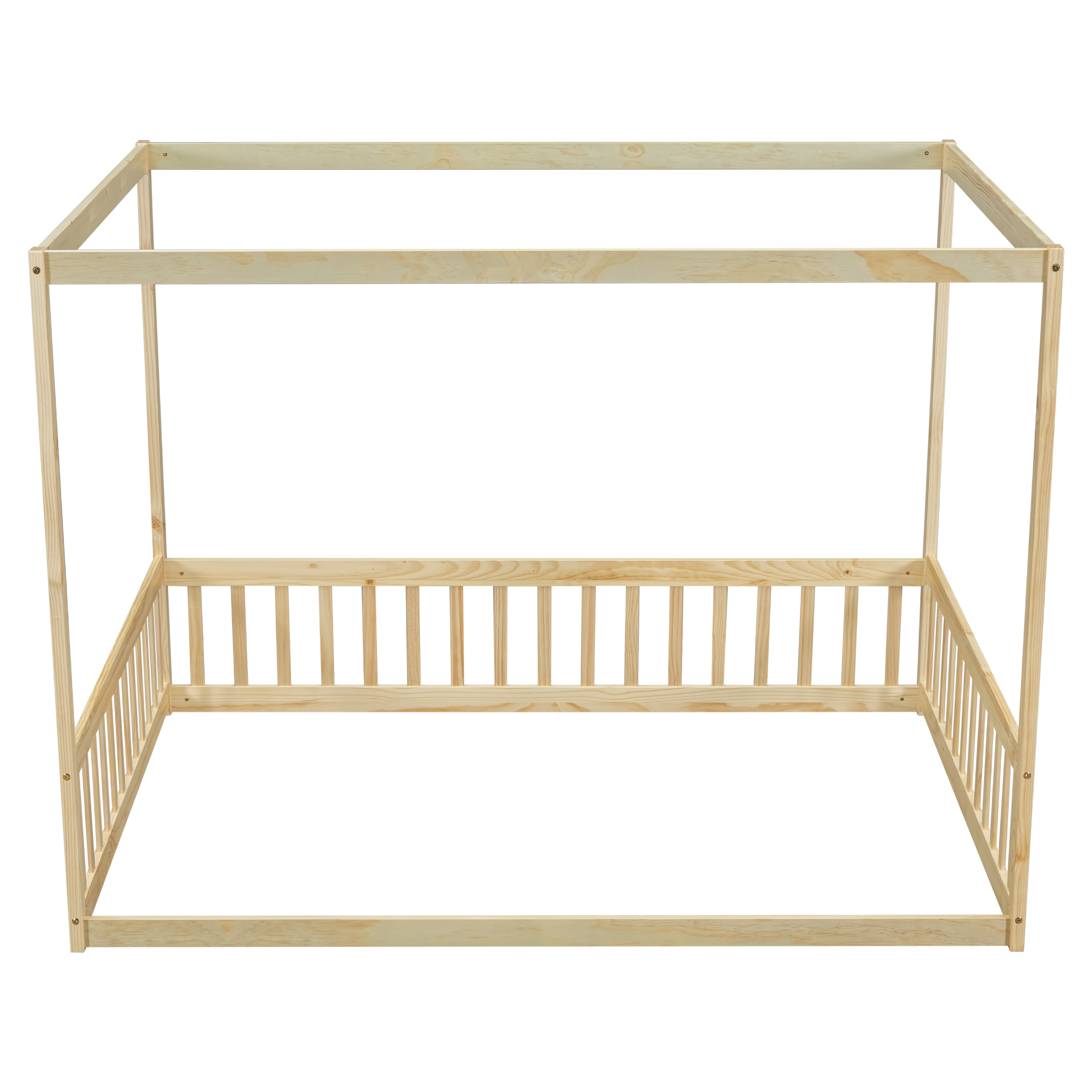 FLOOR CANOPY BED FOR TODDLER: There are Full-length slide rails on the top of the wood canopy bed,you can add your child’s favorite curtains to create an intimate sleeping space,Or decorate this floor bed with bunting,lights,or photos. SAFETY TWIN FLOOR BED: The low profile of the canopy bed which is easy to get in and out for kids.What’s more,this twin canopy bed featuring fence of guardrails not only ensures better stability but also reduce safety concerns,offering the restful nights of sound sleep. FLOOR HEIGHT TWIN BED FOR BOYS AND GIRLS: This elegant twin floor bed features low to ground design which allow your kids get in or out easily.You can place your mattress directly on the floor. STURDY BED FRAME: The canopy floor bed is crafted mainly from premium pine wood and quality engineered wood,making it sturdy and durable. Product Details Product Type: Canopy Frame Floor Bed with Fence Size: Full Color: Natural/White/Gray Material (main): Pine + Plywood Spring Box: No need Assembly Required: Yes Manual and Hardware: Yes Country of Origin: Vietnam Overall Product Dimension: 78.2“x 57”x58.3” Overall Product Weight: 43 lbs Bed Weight Capacity: 250 lbs Suggested Mattress Thickness: 6 inches or less Add curtains for a cozy, personalized sleeping space Easy access for kids to get in and out safely Made from premium pine and engineered wood for durability Ensures stability and reduces safety concerns
