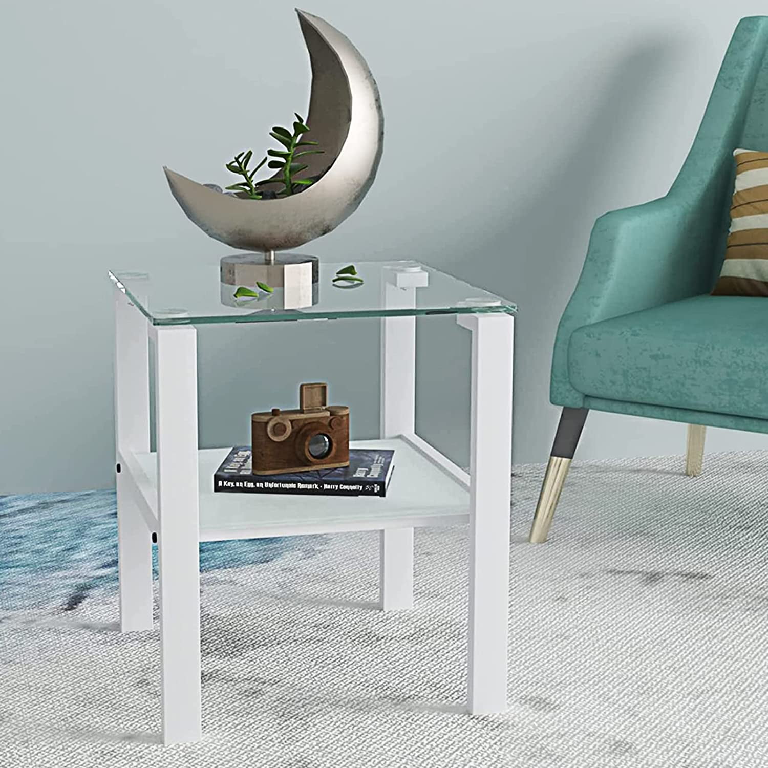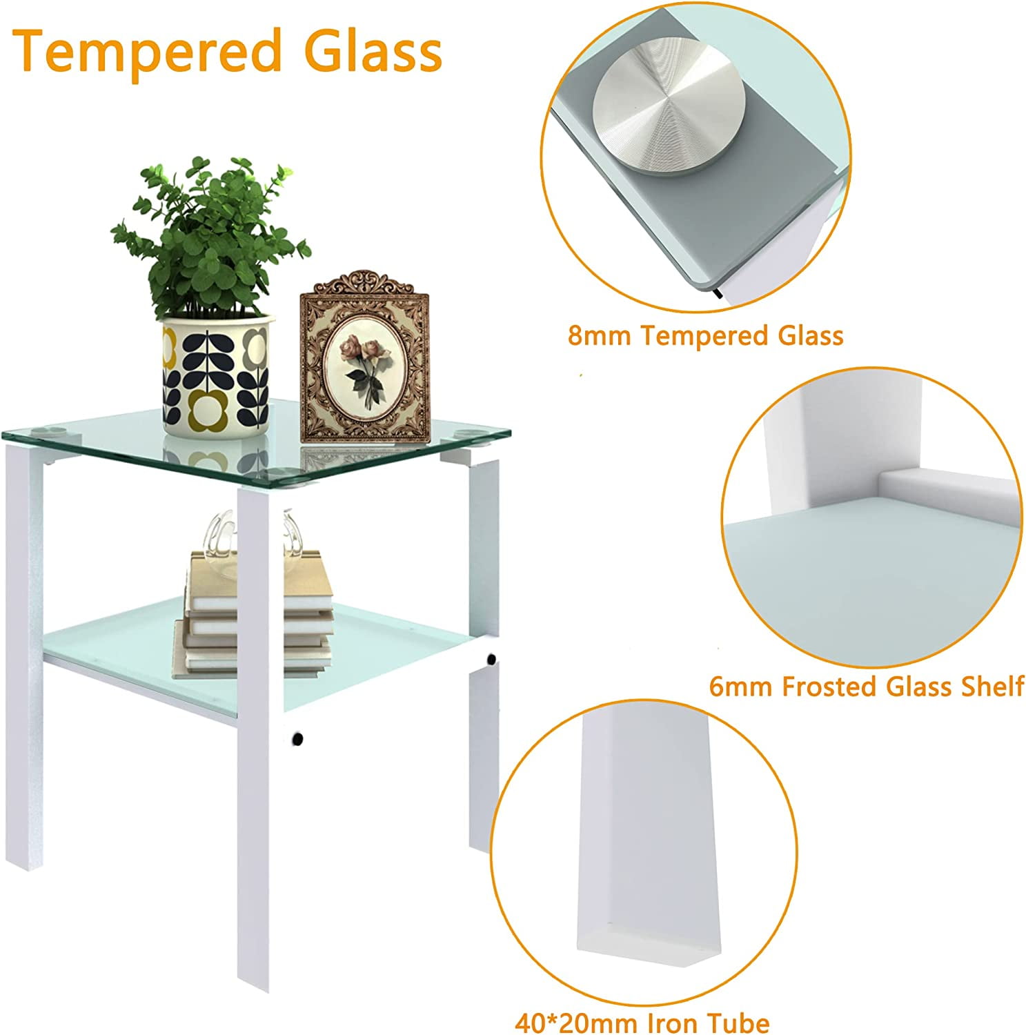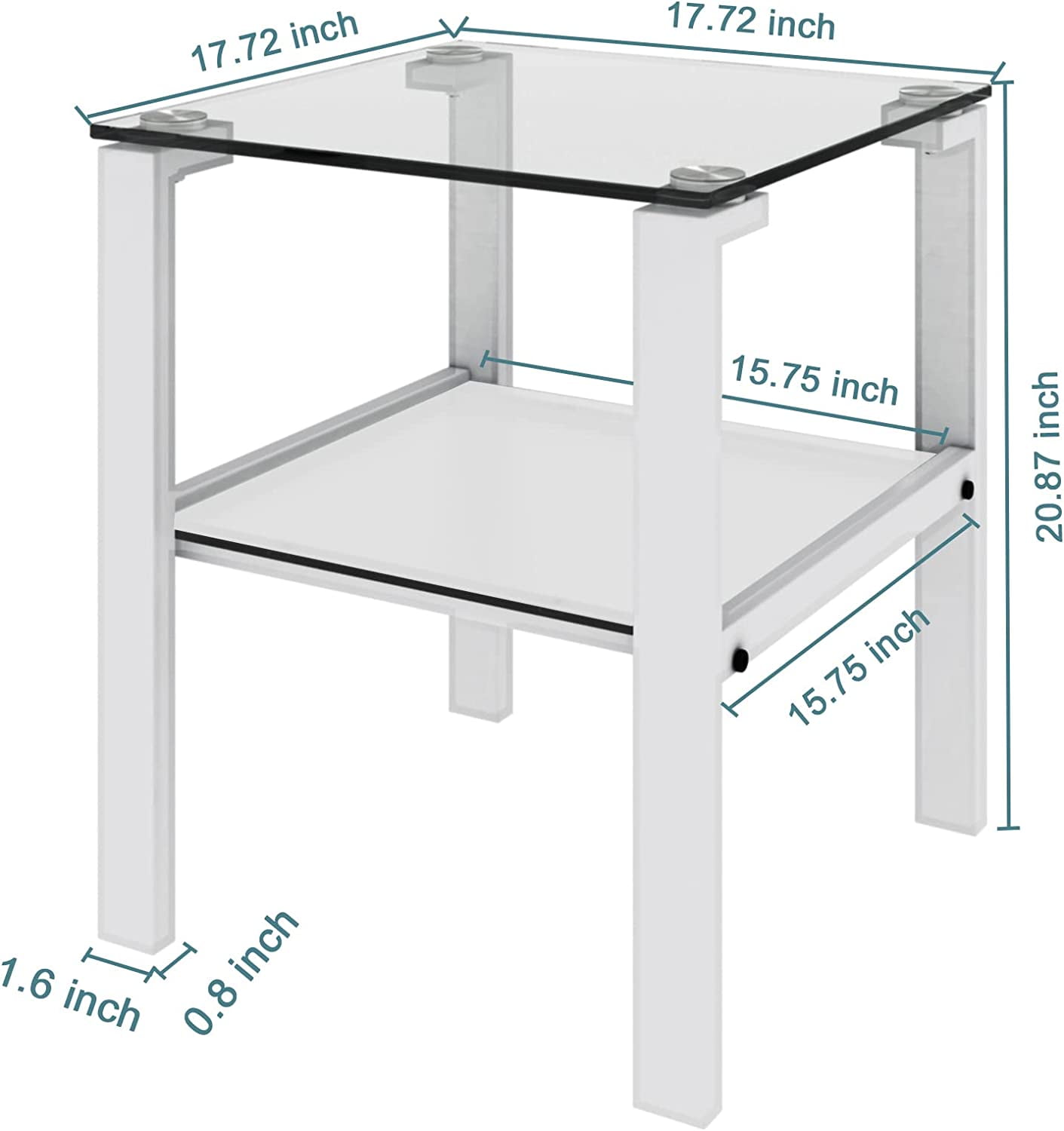 Miniyam Indoor Contemporary Storage Glass Square End Table, White Tempered Glass Side Table Features an 8mm thick top glass and a 5mm second layer providing high temperature resistance and durability with a super load-bearing capacity of 100 lbs 2-Layer Storage Space Designed with a double-layer structure the upper layer is perfect for daily items while the lower layer accommodates books magazines and other miscellaneous items Easy to Clean The glass surface is naturally resistant to stains discoloration and rotting making it easier to clean compared to wooden tables The transparent top allows for easy visibility of items Compact Size Measures 172 W x 172 L x 2087 H making it suitable for small spaces such as dining rooms offices living rooms and bedrooms especially as a side table next to a sofa Easy Self-Assembly Comes with installation instructions and all necessary tools for quick and easy assembly