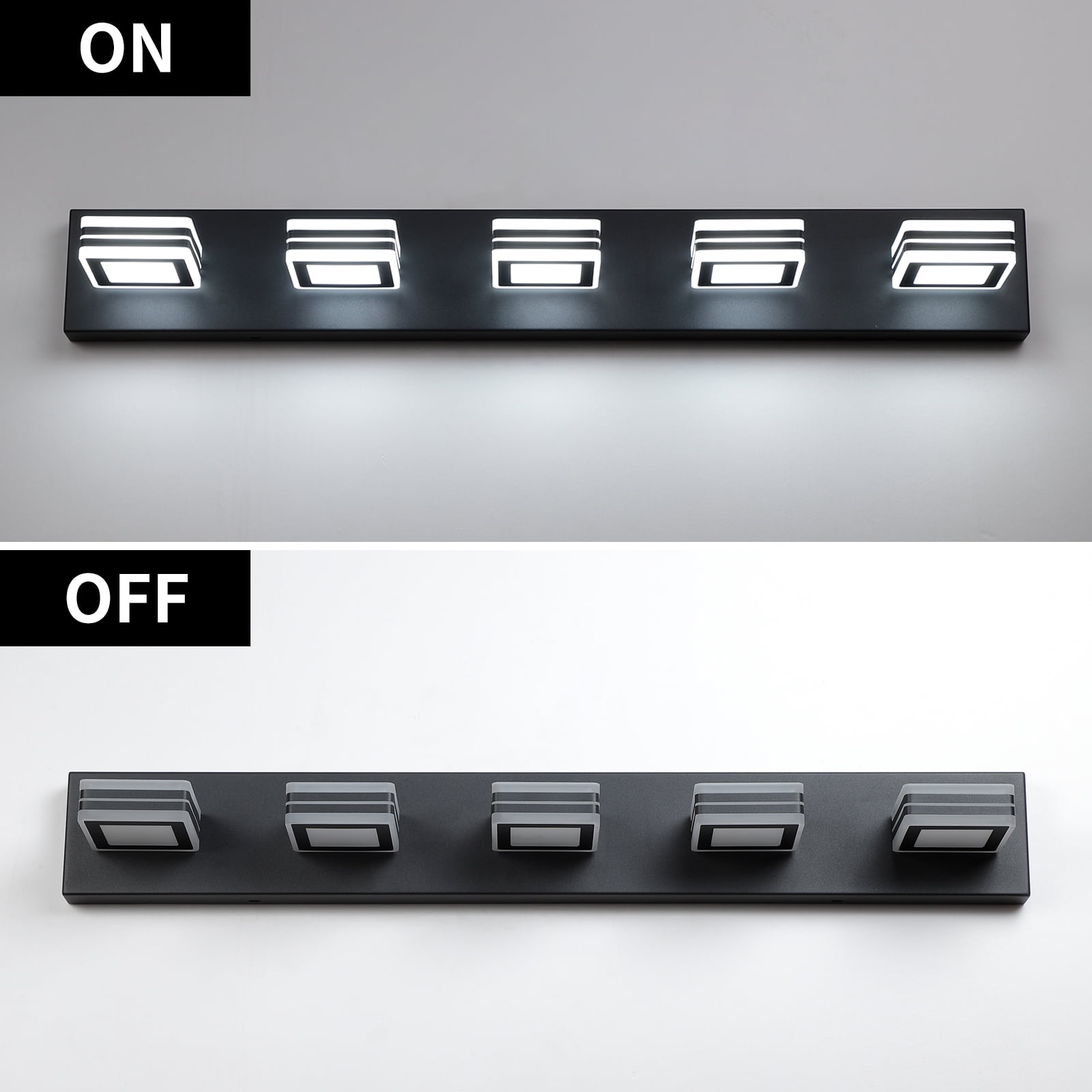 MODERN ELEGANCE:Crafted with a modern and simple style, our vanity light instantly elevates the aesthetic of any space it graces. The sleek design complements various interior styles, adding a touch of elegance to your home. HIGH-QUALITY CRAFTSMANSHIP:Built with a high-quality Metal Black Frame, our vanity light is not just a visual delight but also a testament to durability. The advanced electroplate craft and sealing technology make it dust-proof, fog-proof, anti-corrosive, and moisture-proof – perfect for humid environments. The rugged and unbreakable acrylic lampshade ensures uniform luminescence without any dazzling effects. ENERGY-EFFICIENT LED TECHNOLOGY:Powered by 2835SMD, our vanity light utilizes LED technology that creates stable and efficient light. Experience up to 80% electricity savings compared to conventional light bulbs, making it an eco-friendly and cost-effective choice. With a lifespan of up to 50,000 hours, you can enjoy long-lasting, reliable illumination. EASY INSTALLATION:Designed for hassle-free installation, our vanity light is hardwired and comes with a USA standard installation back plate. No need to search for a switch or plug on the fixture itself – simply mount it on the electric box and connect it to the reserved wire directly. Enjoy the ease of installation with a product that effortlessly integrates into your home. Product Details Product Type: Vanity light Dry, Damp or Wet Location Listed: Dry Shade Included: Yes Fixture Material: Metal Fixture Material Details: Iron Metal Type: Iron Number of Lights: 5 Voltage: 110 Volt Integrated LED: Yes Integrated LED Wattage: 30 Watt Integrated LED Color Temperature: 6000K Maximum Wattage (Per Bulb): 30 Watt Full Back Plate: Yes Power Source: No Power Source Required / Manual Room Use: Bathroom Supplier Intended and Approved Use: Residential Use; Non Residential Use Shade Shape: Square Back Plate Material: Iron Installation Required: Yes Number of People Needed for Installation: 1 The built-in LED light with 6000K cool white light is soft and not harsh No flash, no glare, and no radiation, more healthier for your eyes Integrated LED technology is dimmable and long-lasting Features advanced electroplate craft and sealing technology, anti-corrosion and moisture-proof