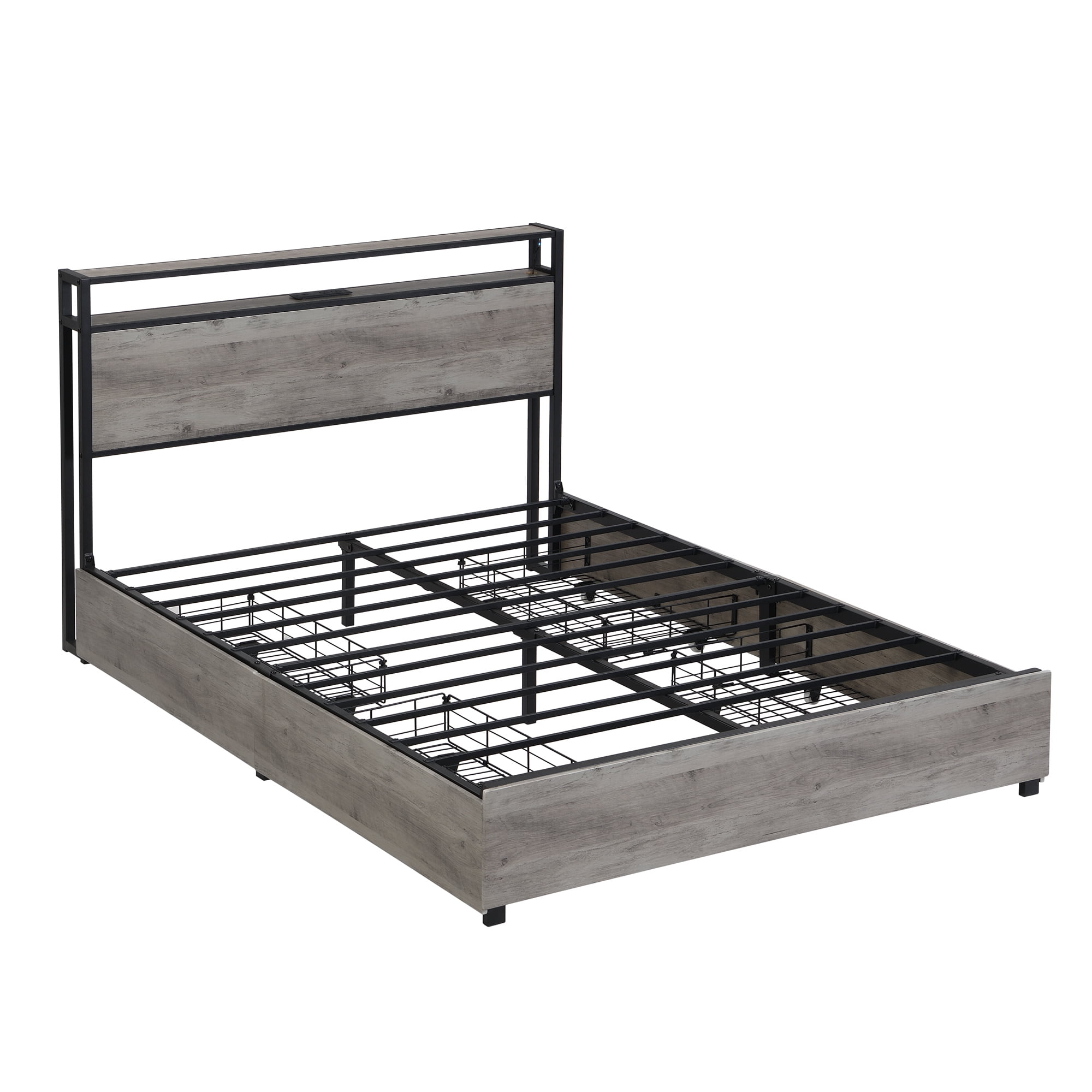 Miniyam Metal Queen Size Bed with Storage Headboard, Charging Station, Drawers for Adult, Gray