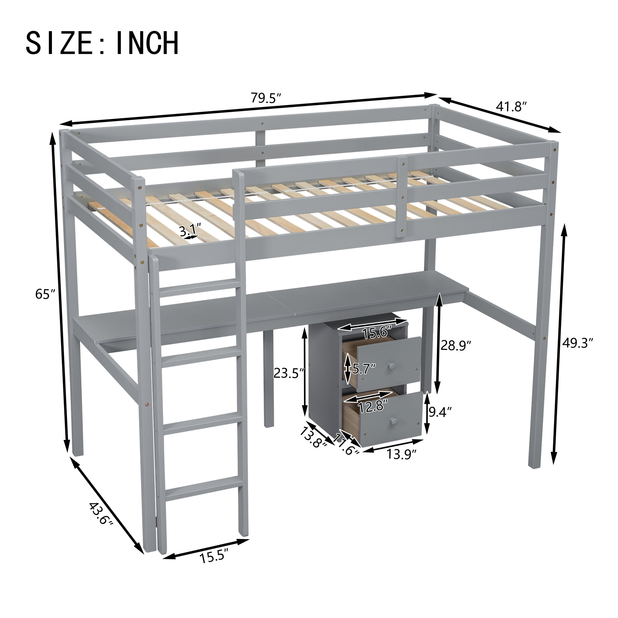 MINIYAM MINIMALISTIC LOFT BED: Elevate your bedroom decor with the Miniyam loft bed, featuring a sleek and contemporary design. Its clean lines and understated elegance make it a perfect fit for various interior styles. Available in a range of classic colors, this bed seamlessly integrates into any setting, enhancing the aesthetic appeal of your space. UNDER-BED DESK AND STORAGE SOLUTION: Maximize your bedroom’s functionality with the spacious area beneath the loft bed, designed to serve as a versatile study or leisure zone. The full-length desk provides ample room for study, work, or hobbies, while the two-drawer storage cabinet helps keep your space organized and clutter-free, creating an inviting atmosphere for reading and writing. THOUGHTFUL AND SAFE DESIGN: Crafted with both sturdiness and safety in mind, the wide built-in ladder ensures easy and secure access to the top bunk. The thoughtfully designed desk beneath the bed offers a quiet, cozy space for kids to focus on their studies or enjoy creative activities. PREMIUM QUALITY AND DURABILITY: Constructed from high-quality pine wood, this Miniyam loft bed is built to last. The solid structure includes 14 slats, ensuring superior stability and safety for the user. High guard rails surround the upper bunk, offering added protection and peace of mind during sleep. HASSLE-FREE ASSEMBLY: The Miniyam loft bed comes with a complete set of instructions and all necessary hardware, making assembly straightforward and hassle-free. Delivered in one convenient package, this bed is designed for easy setup, allowing you to enjoy your new space-saving furniture in no time.