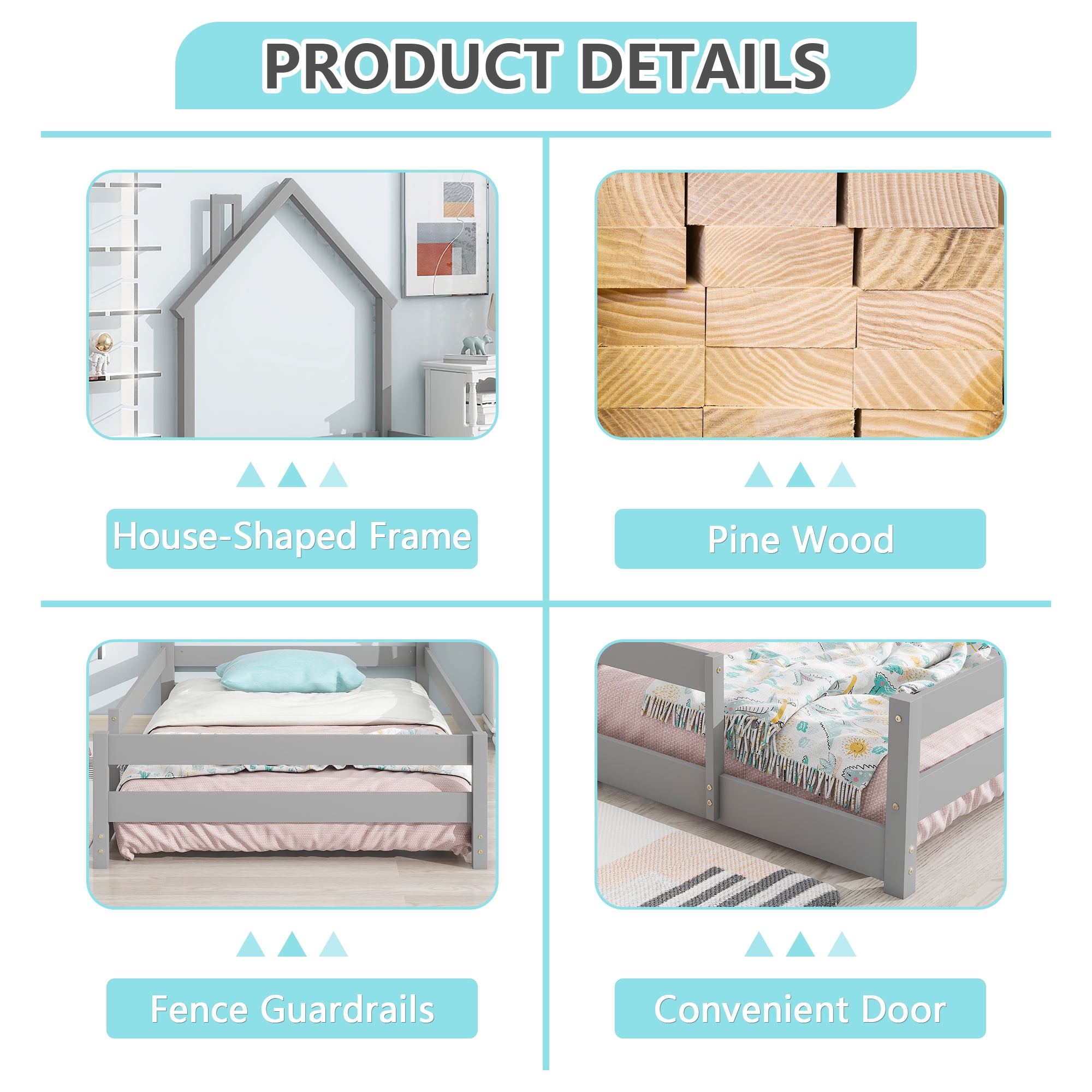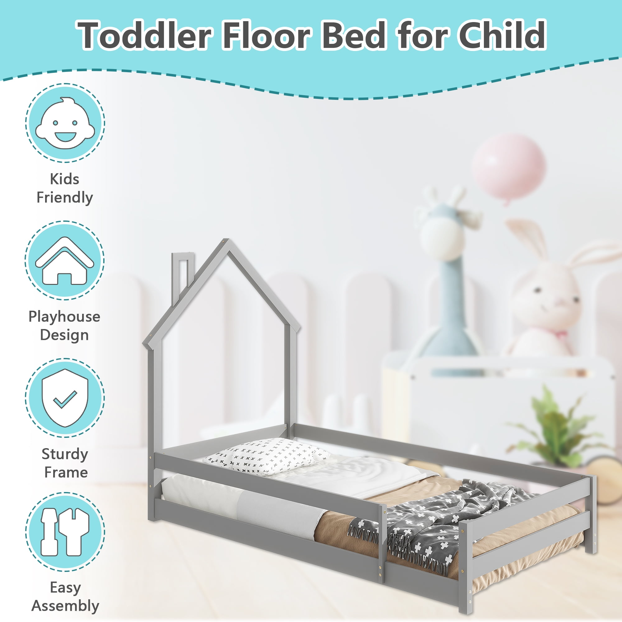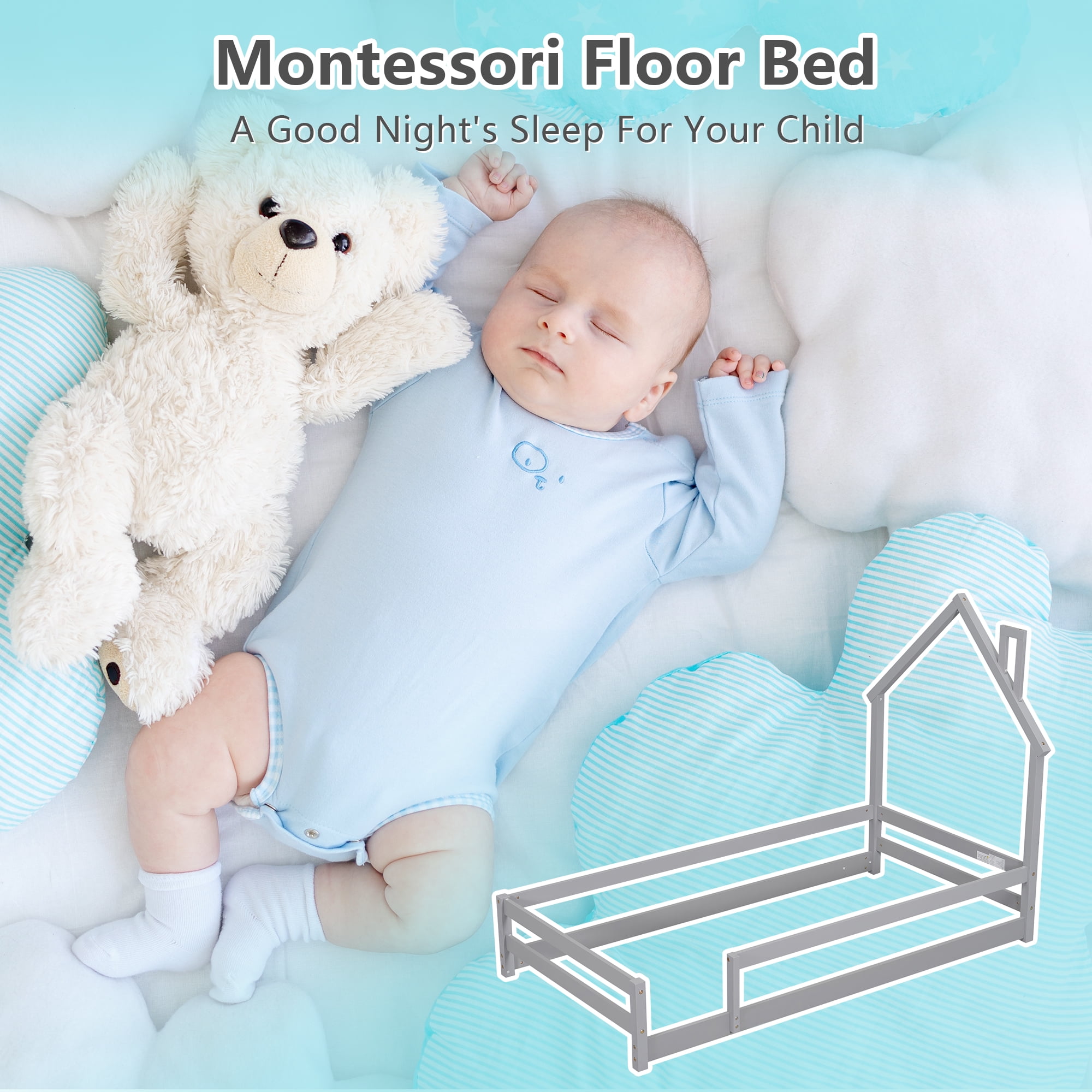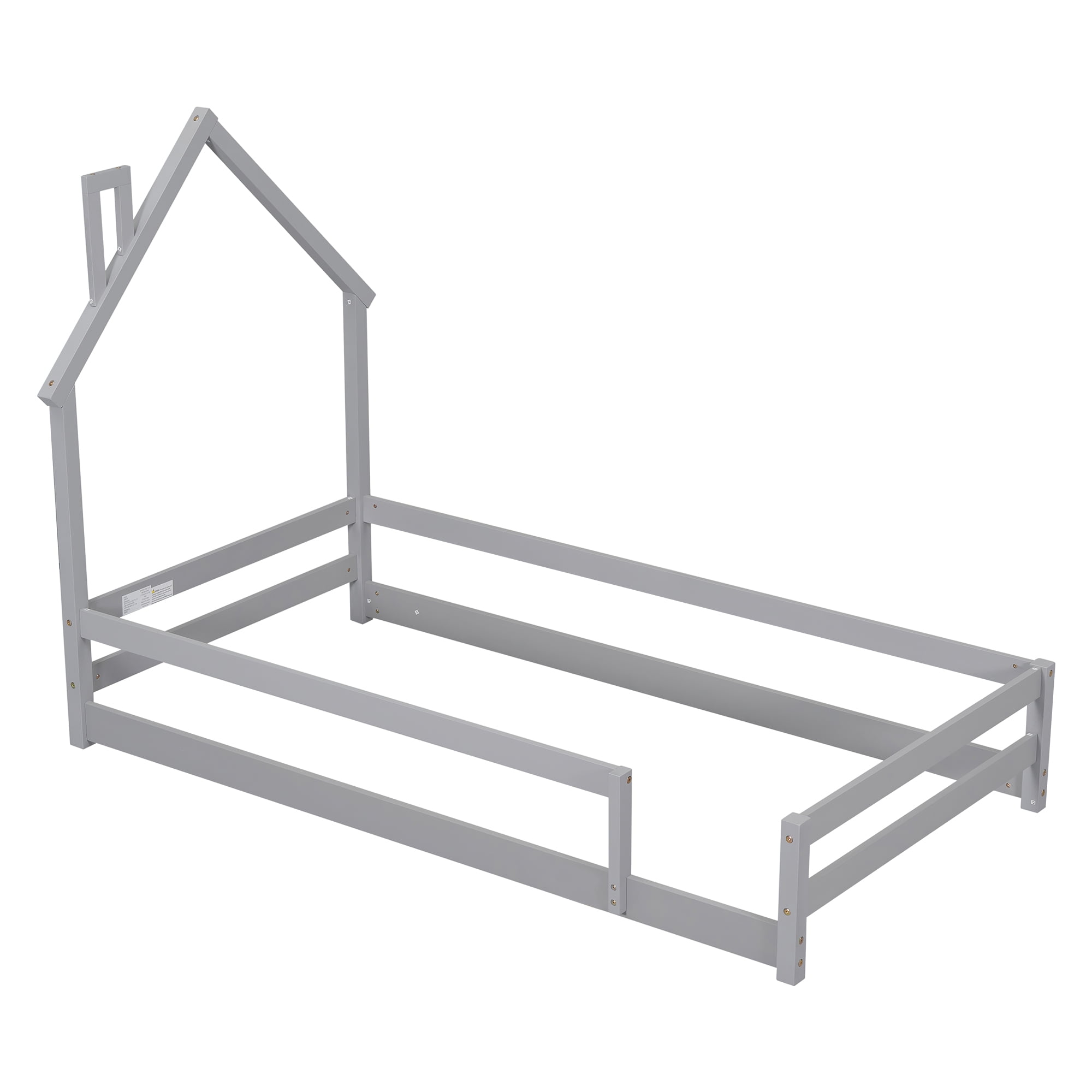 Miniyam Upgraded Twin Size Montessori Toddler Bed, House-Shaped Headboard, 16.2″Guardrails, Gray