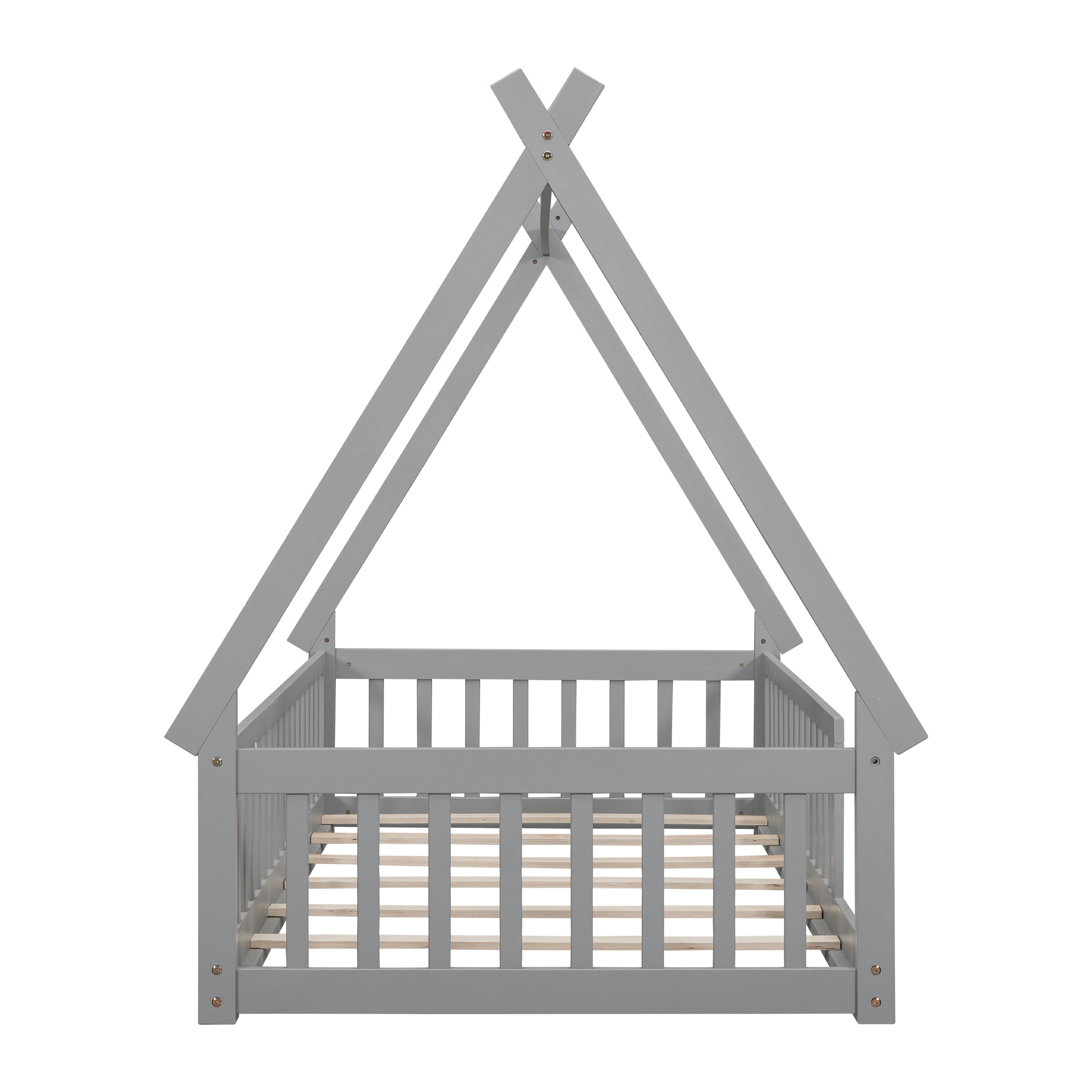 MINIYAM TENT-SHAPED DESIGN FOR FUN & IMAGINATION: This stylish tent-shaped bed frame with a teepee-inspired structure offers a playful and cozy atmosphere. Perfect for sparking creativity, it transforms any bedroom into a charming and inviting space for toddlers. SAFETY FIRST WITH GUARDRAILS: Featuring built-in guardrails, this bed ensures your toddler’s safety while they sleep. The bed’s low height and the sturdy fence design help prevent falls, providing peace of mind for parents. DURABLE PINE WOOD CONSTRUCTION: Made from high-quality pine wood, this bed is built to last. Its sturdy design guarantees long-term durability, offering a secure and stable foundation for your child’s bedtime. VERSATILE AND ELEGANT AESTHETIC: The minimalist yet sophisticated design seamlessly fits into any bedroom decor, enhancing the overall look of your home. Choose from multiple color options to match your room’s theme perfectly. EASY ASSEMBLY FOR CONVENIENCE: This twin bed is designed for easy assembly with clear instructions and all necessary hardware included. Set up is quick and hassle-free, so your toddler can start enjoying their new bed in no time!