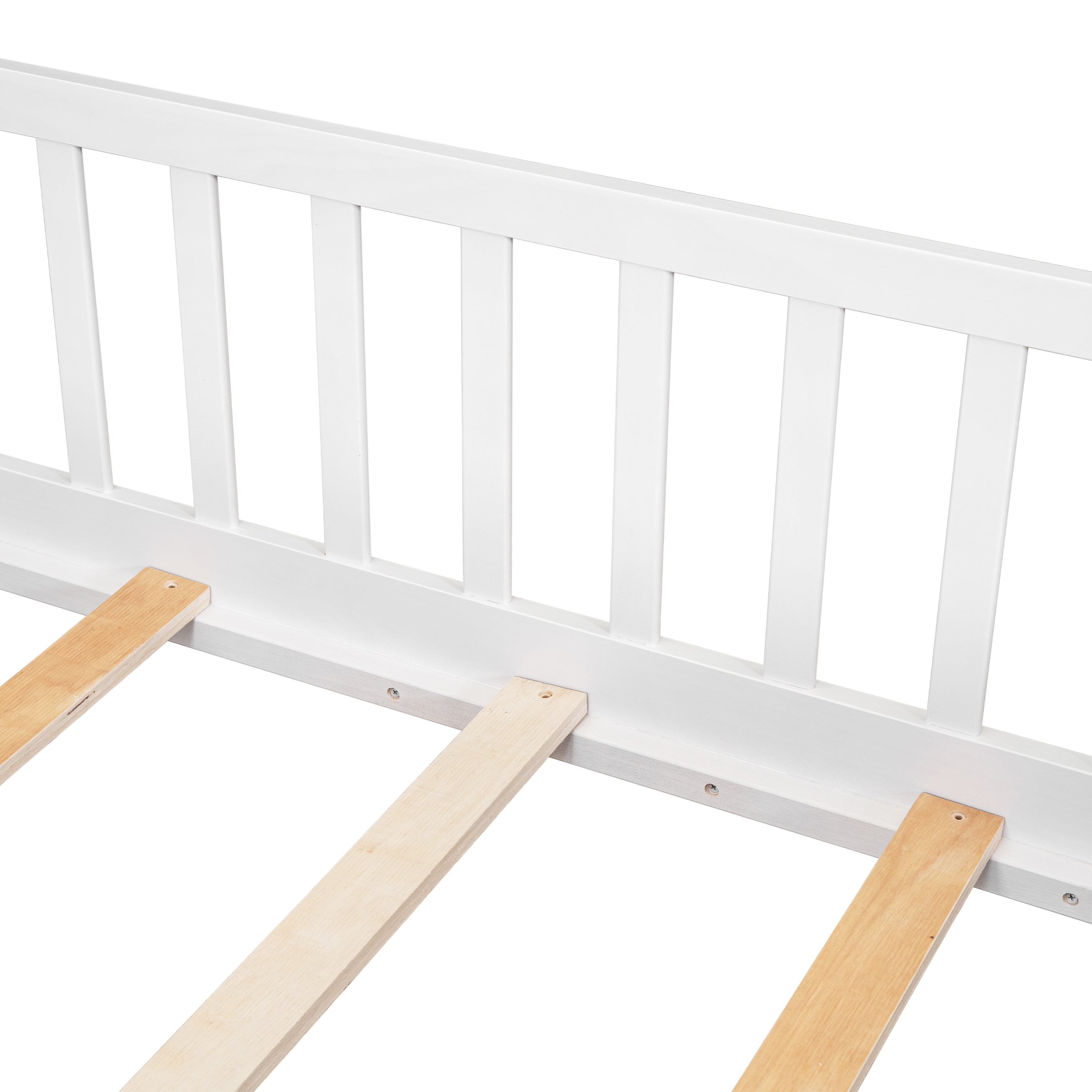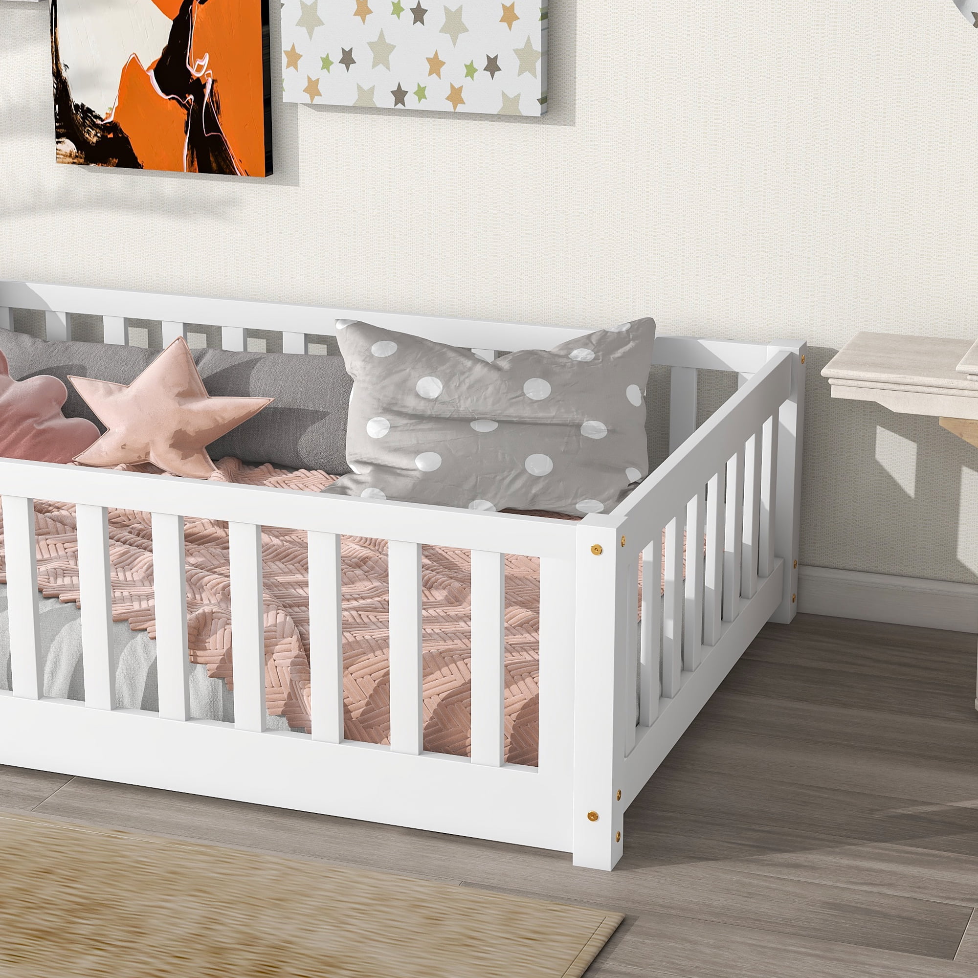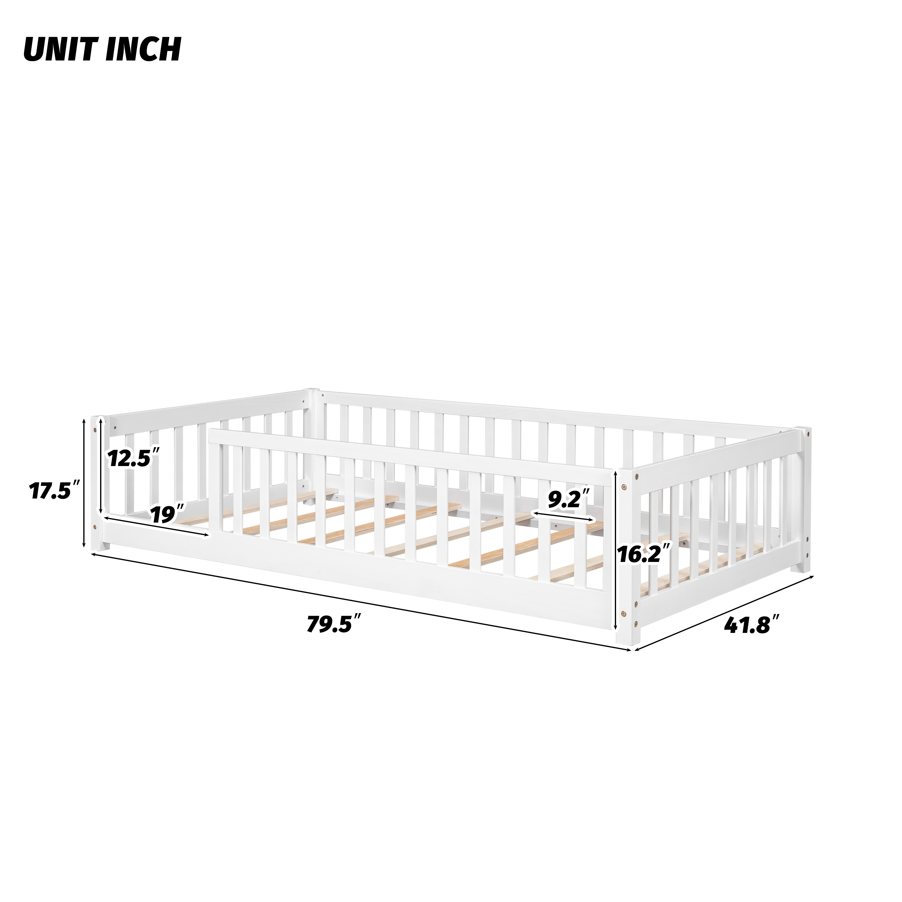 VERSATILE DESIGN: The floor bed is designed to help parents take care of their children by giving them a playground to learn to walk and climb, as well as an ideal place for children to sleep on. The bed is best suited for those with compact rooms and limited space. If you can give your kids some cute decorations, they may feel like they are playing in a wonderland. STURDY CONSTRUCTION: The product is made of high-quality pine and high-quality engineered wood, so it is sturdy and durable. The wooden structure is securely fastened and each part is reinforced by each other. PLATFORM BED WITH SLATS: The bed platform consists of 7 thickened plywood slats that give the mattress strong support and enough toughness, so there are no worries when your child plays and sleeps on it. SPACE DESIGN: Our floor beds are thoughtfully designed for parents, with a space reserved in the bed for families to pick up their children and prevent their feet from being knocked. This space greatly helps children get in and out of the bed very happily and quickly. Product Information Product Type: Standard Bed Frame Material: Manufactured Wood + Solid Wood Bed Size: Twin Box Spring Required: No Slat Kit Included: Yes Number of Slats Included in Slat Kit: 7 Center Support Legs: No Converts to Two Beds: No Mattress Included: No Guardrails Included: Yes Weight Capacity: 200 lb. Supplier Intended and Approved Use: Residential Use Assembly Required: Yes High quality wood material, stable and durable, can be used for a long time Guardrails around the bed, safety design Elegant enough to add a unique charm to your home Suitable for any modern home environment