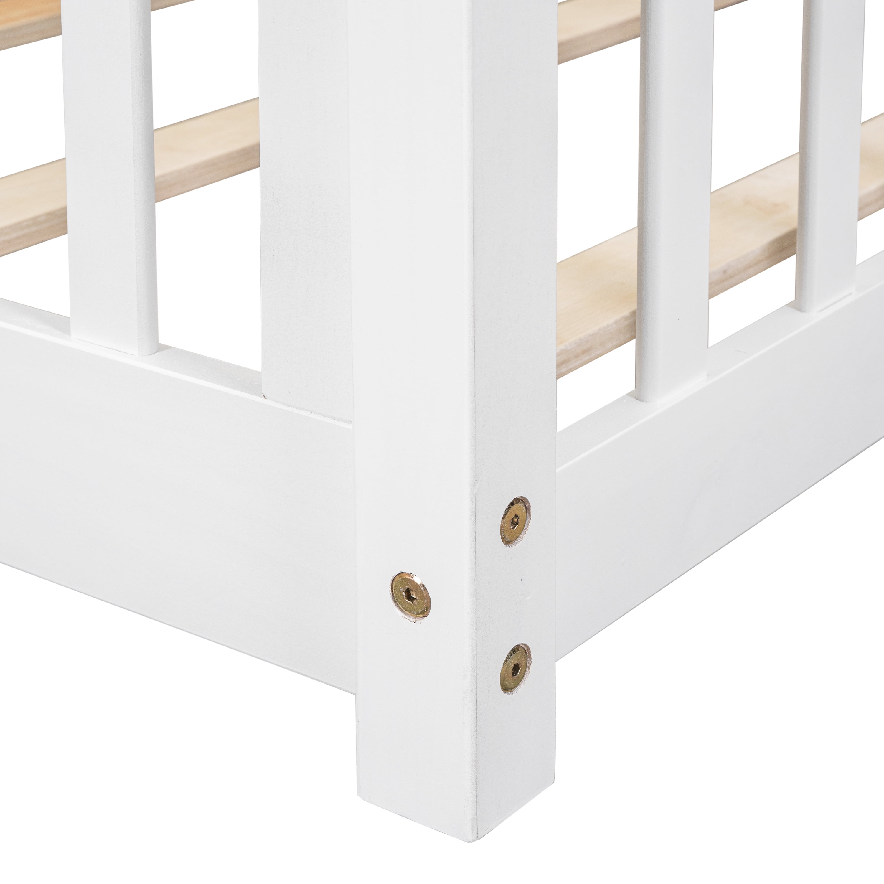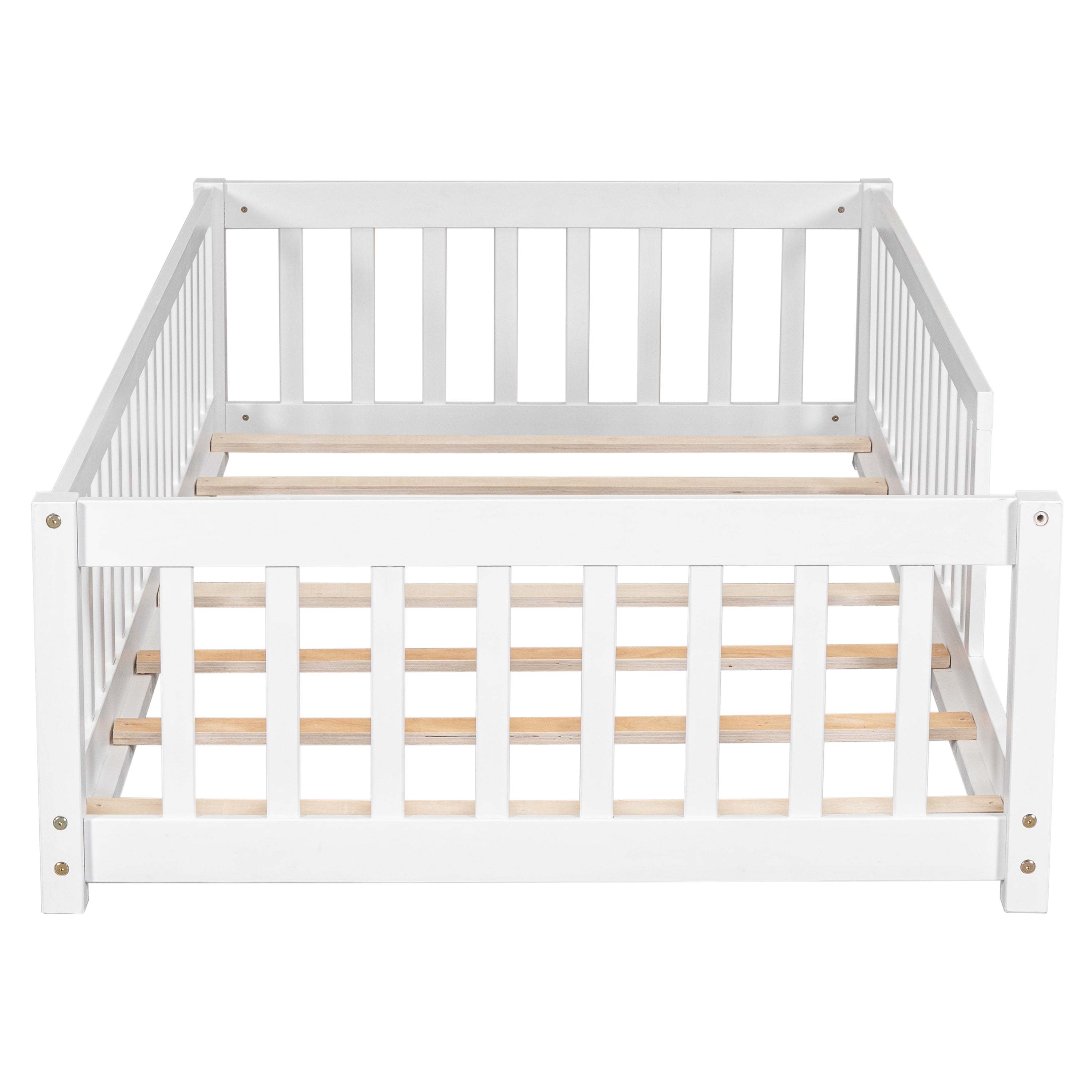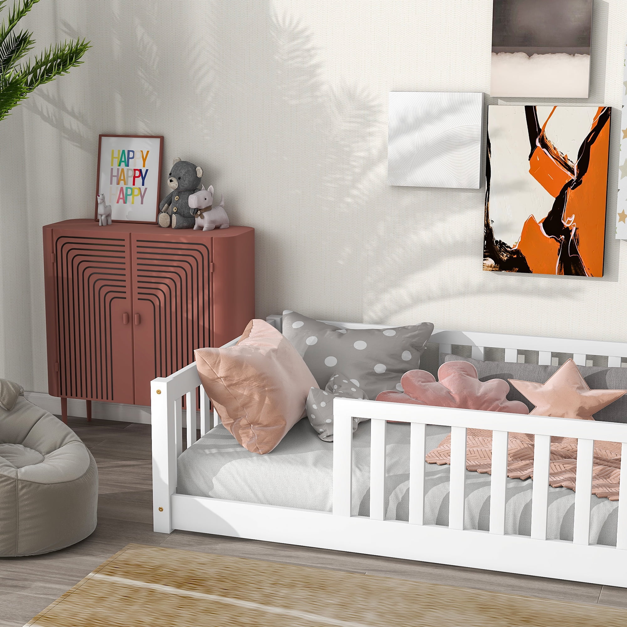 VERSATILE DESIGN: The floor bed is designed to help parents take care of their children by giving them a playground to learn to walk and climb, as well as an ideal place for children to sleep on. The bed is best suited for those with compact rooms and limited space. If you can give your kids some cute decorations, they may feel like they are playing in a wonderland. STURDY CONSTRUCTION: The product is made of high-quality pine and high-quality engineered wood, so it is sturdy and durable. The wooden structure is securely fastened and each part is reinforced by each other. PLATFORM BED WITH SLATS: The bed platform consists of 7 thickened plywood slats that give the mattress strong support and enough toughness, so there are no worries when your child plays and sleeps on it. SPACE DESIGN: Our floor beds are thoughtfully designed for parents, with a space reserved in the bed for families to pick up their children and prevent their feet from being knocked. This space greatly helps children get in and out of the bed very happily and quickly. Product Information Product Type: Standard Bed Frame Material: Manufactured Wood + Solid Wood Bed Size: Twin Box Spring Required: No Slat Kit Included: Yes Number of Slats Included in Slat Kit: 7 Center Support Legs: No Converts to Two Beds: No Mattress Included: No Guardrails Included: Yes Weight Capacity: 200 lb. Supplier Intended and Approved Use: Residential Use Assembly Required: Yes High quality wood material, stable and durable, can be used for a long time Guardrails around the bed, safety design Elegant enough to add a unique charm to your home Suitable for any modern home environment
