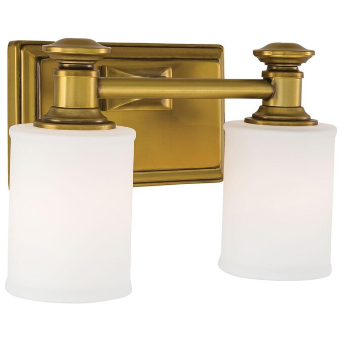 The clean, modern lines of the 2 Light Liberty Gold Bath Light is reflective of times past. The patina of the gold finish sets off the etched opal glass shades. This fixture will make a great addition to your hall, bath, powder room or entryway.