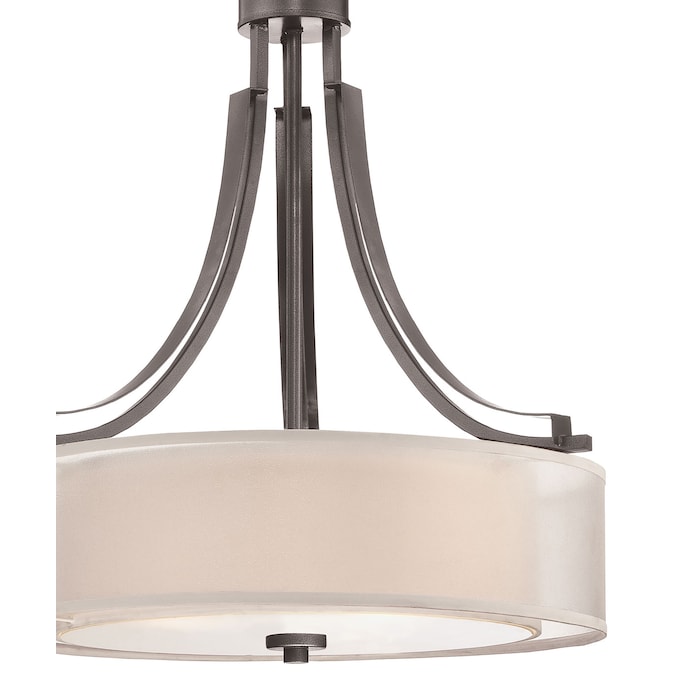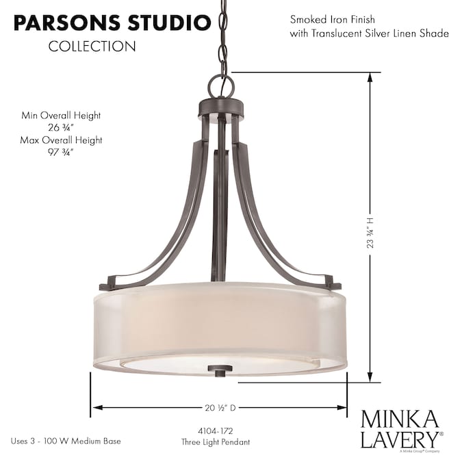The sleek and sophisticated go anywhere; look of the Parsons Studio Collection in Smoked Iron Finish adds brilliance to any home. Sure to complement any bedroom, entry, kitchen, dining room or hallway. This 3 light pendant with a silver drum shade adds light and color to any decorative style.