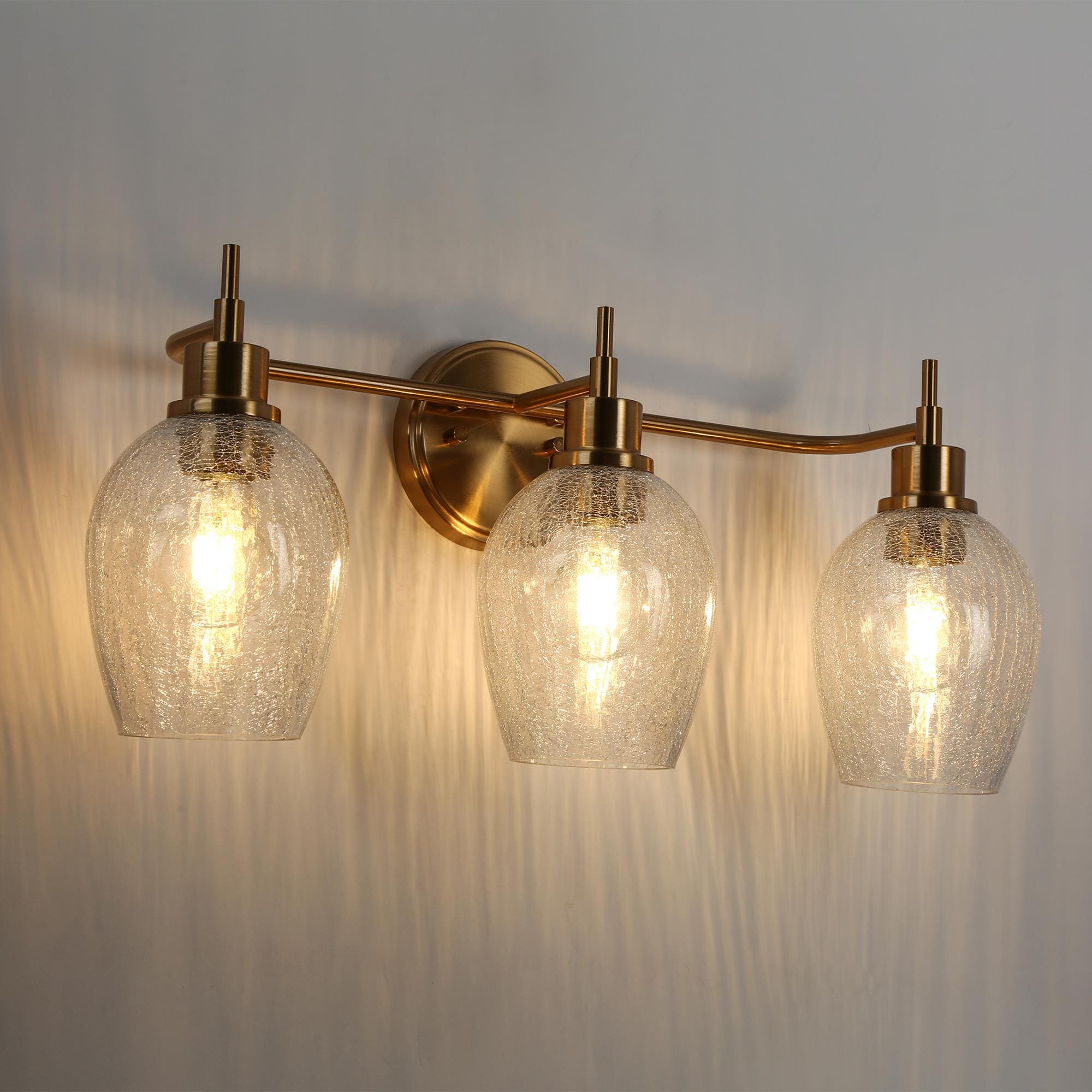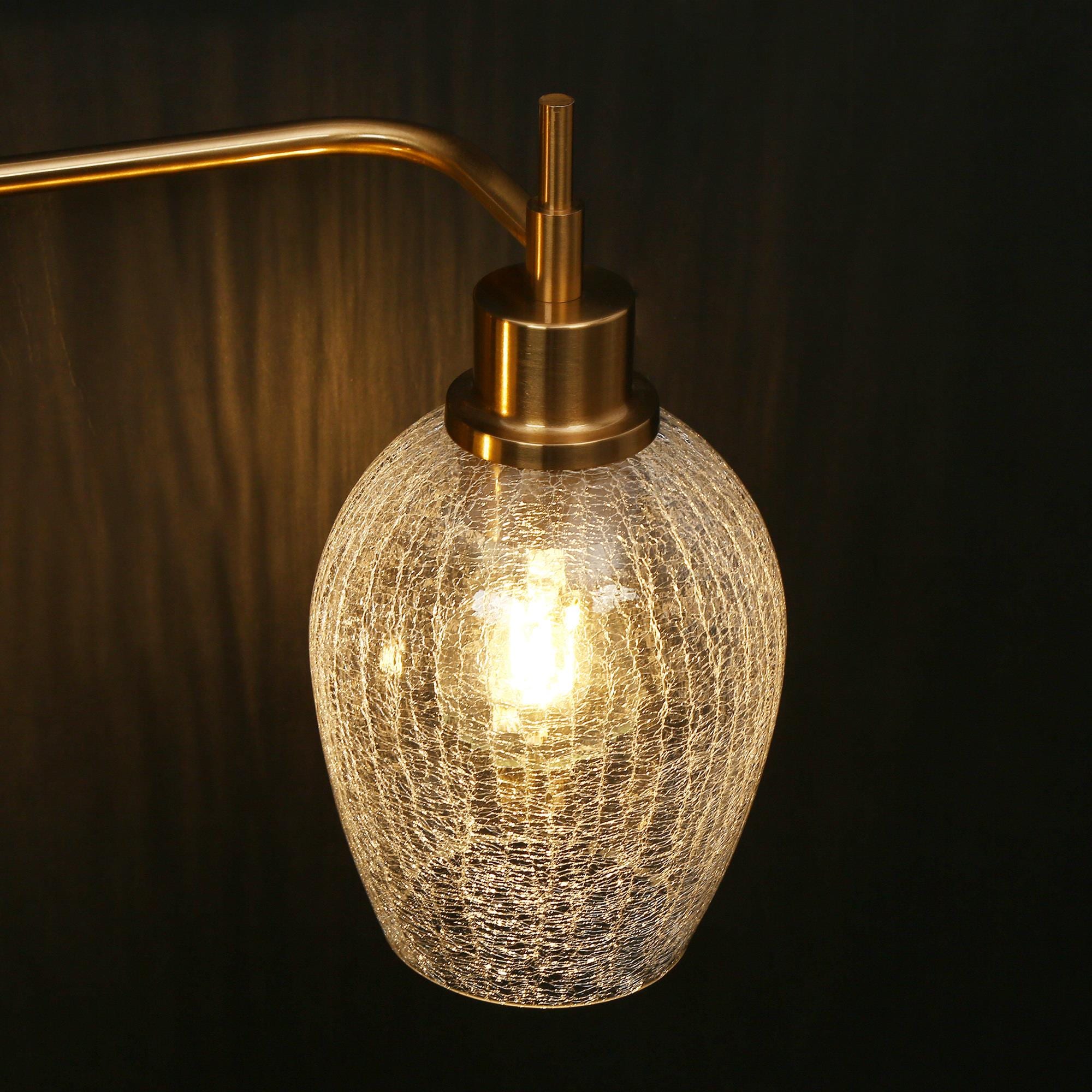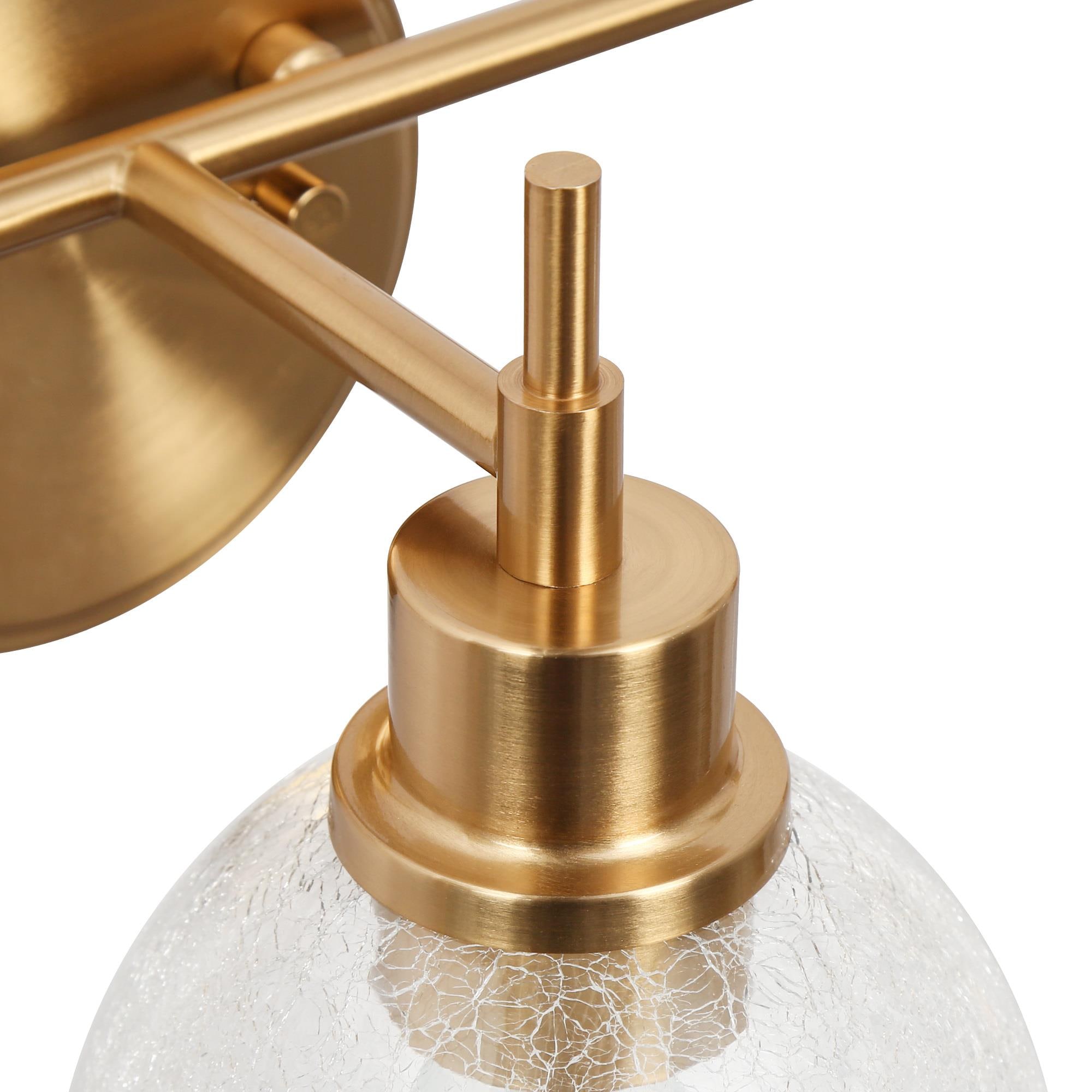 Introducing the LNC 3-Light Vanity Light, a refined selection for enhancing your bathroom decor. This vanity lamp features an exquisite polished gold finish and distinctive wine glass-shaped cracked glass shades, which together produce an engaging lighting effect. This distinctive design combines both functionality and aesthetics to ensure an optimal lighting experience. With its practical and elegant design, this bathroom light streamlines your daily morning routine for a seamless and convenient experience.