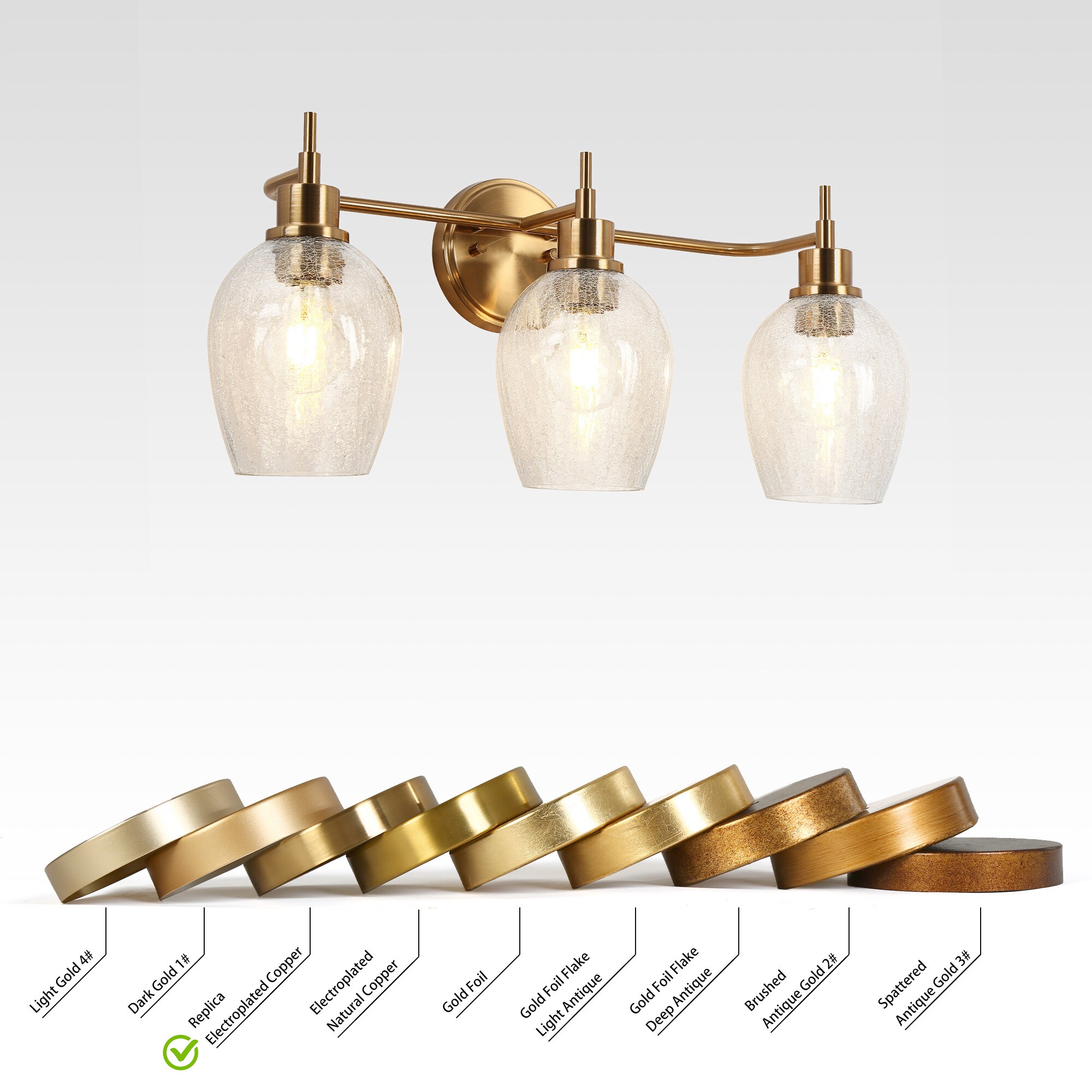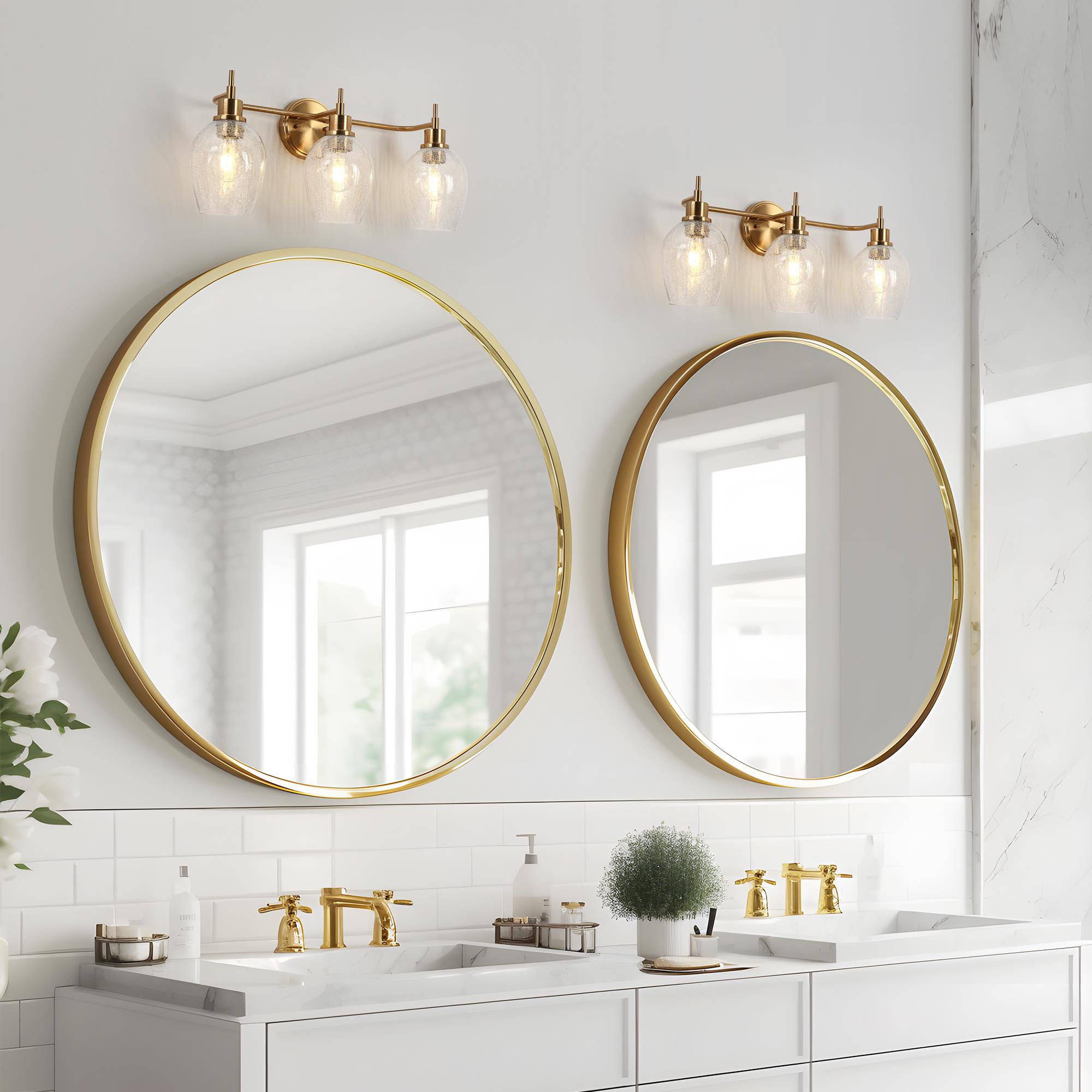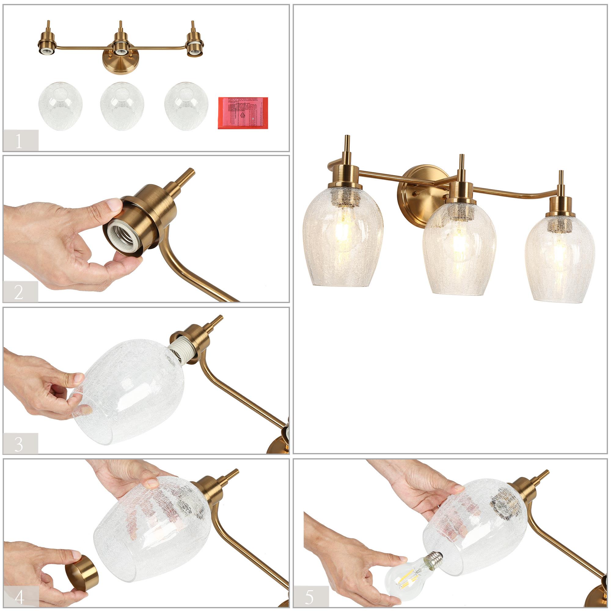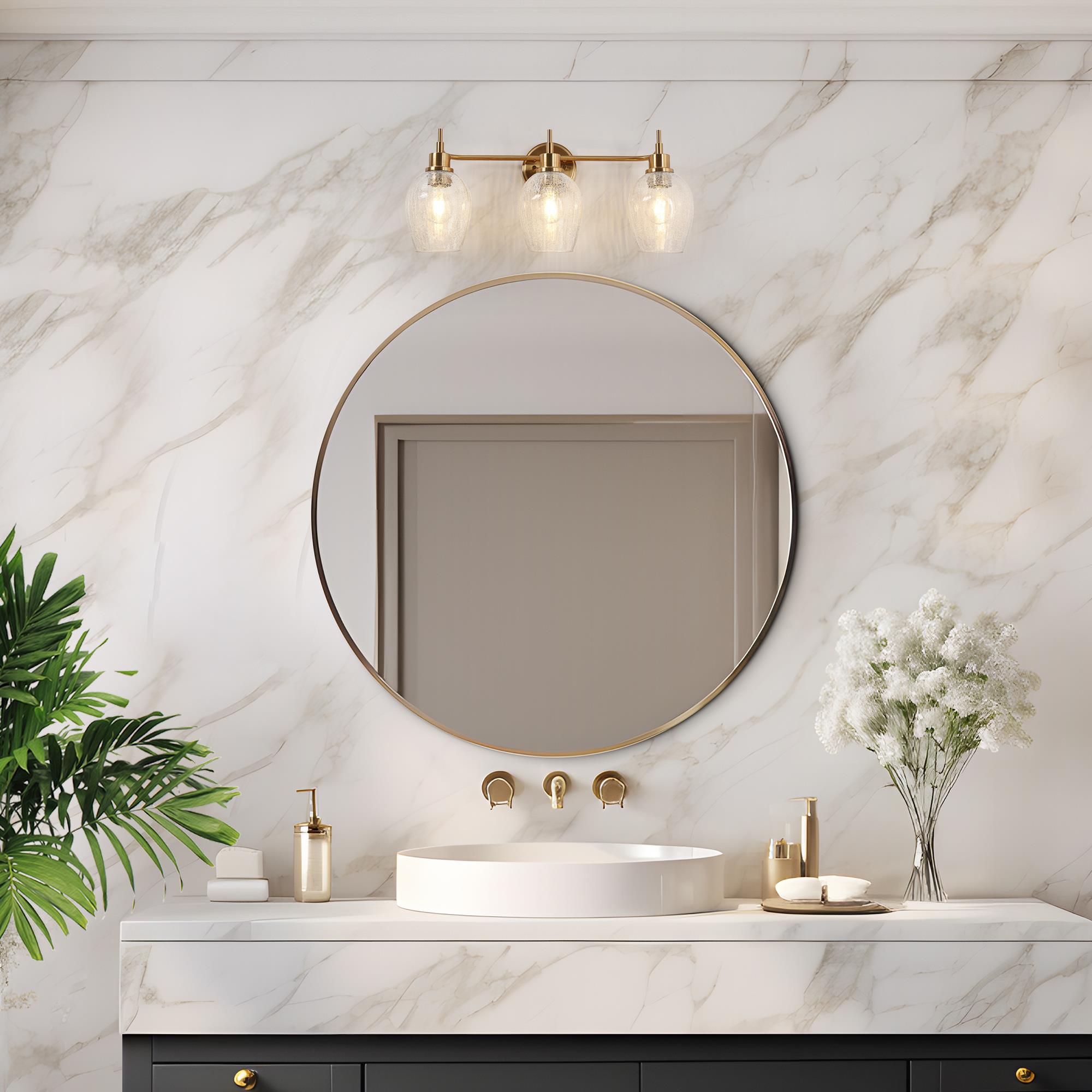 Introducing the LNC 3-Light Vanity Light, a refined selection for enhancing your bathroom decor. This vanity lamp features an exquisite polished gold finish and distinctive wine glass-shaped cracked glass shades, which together produce an engaging lighting effect. This distinctive design combines both functionality and aesthetics to ensure an optimal lighting experience. With its practical and elegant design, this bathroom light streamlines your daily morning routine for a seamless and convenient experience.