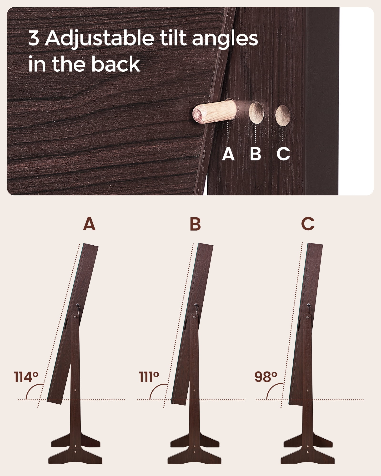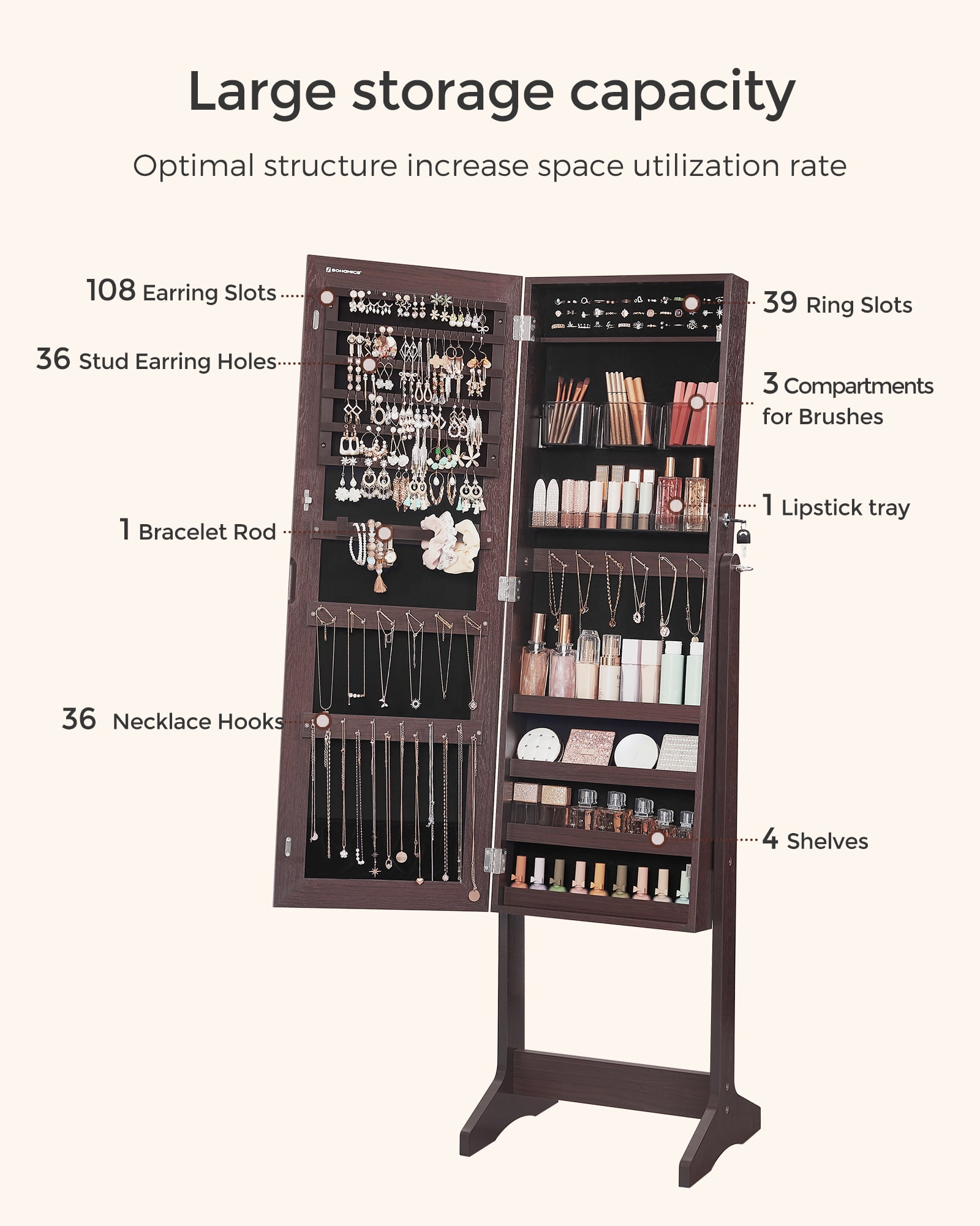 Store Them All Here! With 108 slots and 36 holes for earrings, 36 hooks for necklaces, 39 places for rings, 1 bar for bracelets, and 4 shelves—1 of which is perfect for tall products—your jewelry will be organised in one place, rather than scattered around Even for Cosmetics? Yes! There are 2 removable, easy-to-clean plastic cosmetic trays that contain 3 deep compartments for brushes, 2 compartments for powders, and 8 slots for lipsticks—a perfect 2-in-1 organizer for makeup and jewelry! See Beauty in the Mirror: With the full-length mirror, you’ll be able to have a head-to-toe view of your outfit at one glance; plus, the glass mirror offers better performance while making your room brighter and bigger-looking Assembly Just Got Easier: With a pre-assembled cabinet, all that’s left is to assemble the bottom legs by following the easy-to-follow instructions and videos provided—assembling this jewelry cabinet has never been this fast and easy! A Nice Gift for Who? For you, for a friend having a birthday, or for your sweetheart on a special occasion! This quality freestanding jewelry organizer made of solid MDF will make your eyes sparkle! Color: Brown Material: MDF (Medium Density Fiberboard) Product Size: 16.2″L x 14.4″W x 59.8″H (41.2 x 36.5 x 152 cm) Cabinet Size: 14.8″L x 3.8″W x 42.5″H (37.5 x 9.7 x 108 cm) Product Weight: 25.1 lb (11.4 kg) 1 x Jewelry Cabinet 2 x Key 1 x Accessory Kit 1 x Anti-Tip Kit 1 x Instructions Children should not climb on or play with the product for safety reasons. Please secure the product to the wall with the included anti-tip kit.