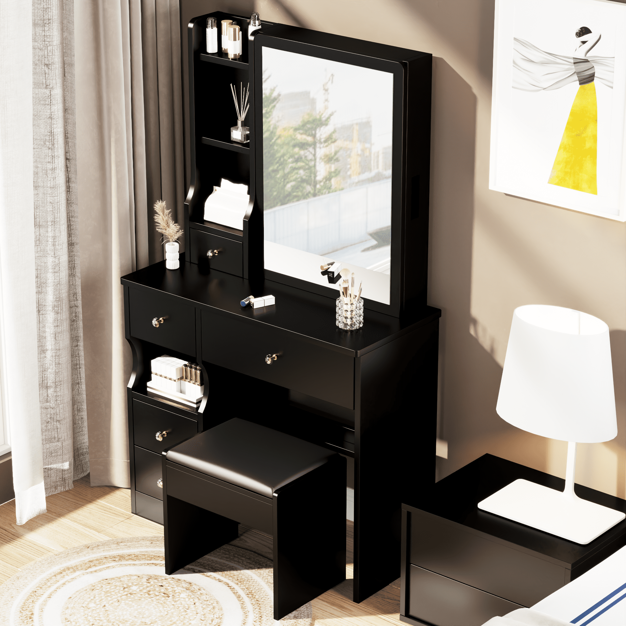 Vanity Table Set with Cushioned Stool,Extra Large Touch Control Sliding LED Mirror & Tri-color Switching & Brightness Adjustable for Small Space,Black