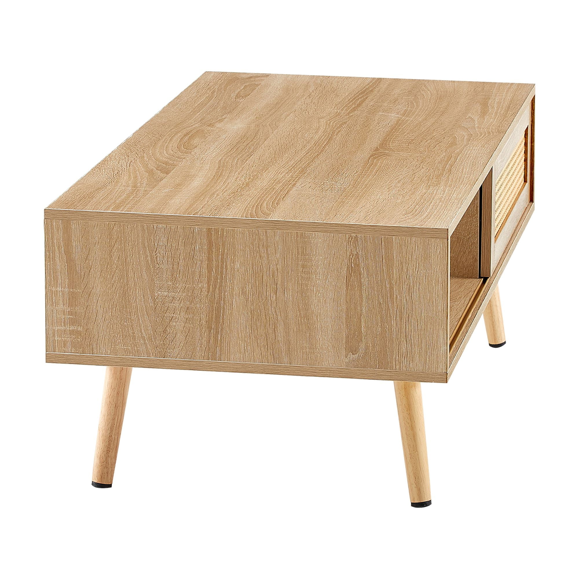 Mitinya Storage Rattan Coffee table, Natural Item Dimensions: 41.34″L x 21.65″W x 16.34″H Load-bearing Capacity: 220 lbs Material: Constructed with an MDF body, rattan woven door panels, and solid wood legs Exquisite Appearance: Features a fashionable and unique rattan woven design that is smooth and safe Sturdy Construction: Solid wood legs provide durability, while adjustable PVC feet ensure stability Multi-Functionality: Sliding rattan woven door panel allows for easy access to items, enhancing practicality Versatile Use: Suitable for living rooms, interiors, and office spaces, offering strong functionality