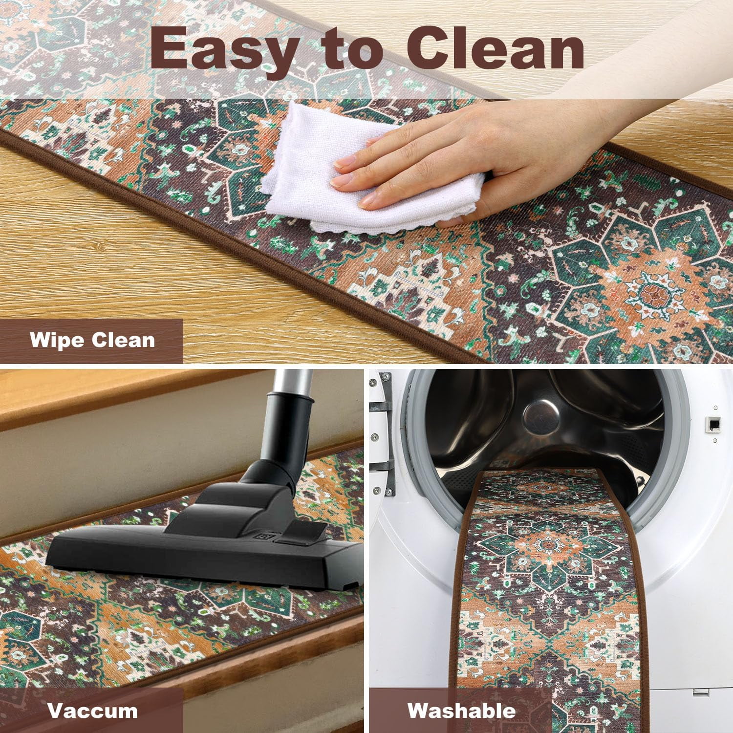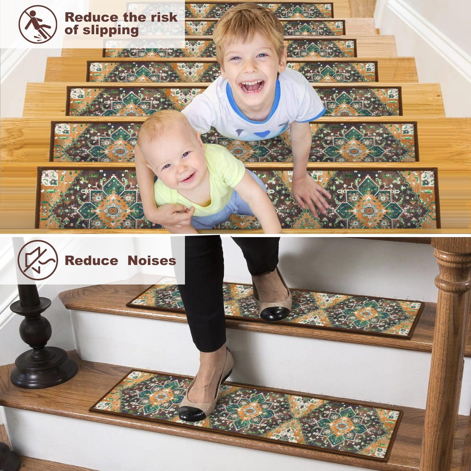 Stair Treads Non Slip: Durable anti slip stair runners are perfect for indoor use. We use premium chenille material with 0.25” thickness, which restores you a better floor feeling and comfortable touching. The staircase runner carpet for stairs are safe and friendly for kids, elders and pets. Self Adhesive & Non Slip Carpet for Stairs: Our peel and stick carpet stair treads is designed with non slip backing. The stair runners for wooden steps can firmly adhere to your stairs.This non-slip backing is helpful to keep the stair rugs sturdy and prevent shifting or slipping. Easy Install and Removal Staircase Step Treads: You just clean stairs surface, peel off the backing film and put stair mats on floors. If you need to reposition or remove, it won’t leave any residue, always keeping your floors intact. And it won’t remove or slip when meeting water. Cuttable Stair Rugs: Our anti slip stair treads for wooden steps indoor can be cutted to any size. If your step size is special, you can easily cut the carpet tread with scissors. There are 15 Pieces staircase step treads in a packege, and each is 8”x30”, which fits most indoor stairs. Easy Care Edging Stair Treads: The carpet stair runners are easily cleaned.You can use the vacuum to clean dust, scraps and pet hair. Also, throw these stair grips into washing machine. They still maintain shape and colors for long time to use. Don’t worry about fiber falling because of excellent edge locking technology. Versatile Stair Treads Carpet Rugs: Non slip peel and stick self adhesive stairway carpet strongly adheres to all smooth surfaces for the best traction and the perfect texture to make sure you and your surrounding are safe at all times! you can stick them on wood, tile, stone, metal, and glass stairs.