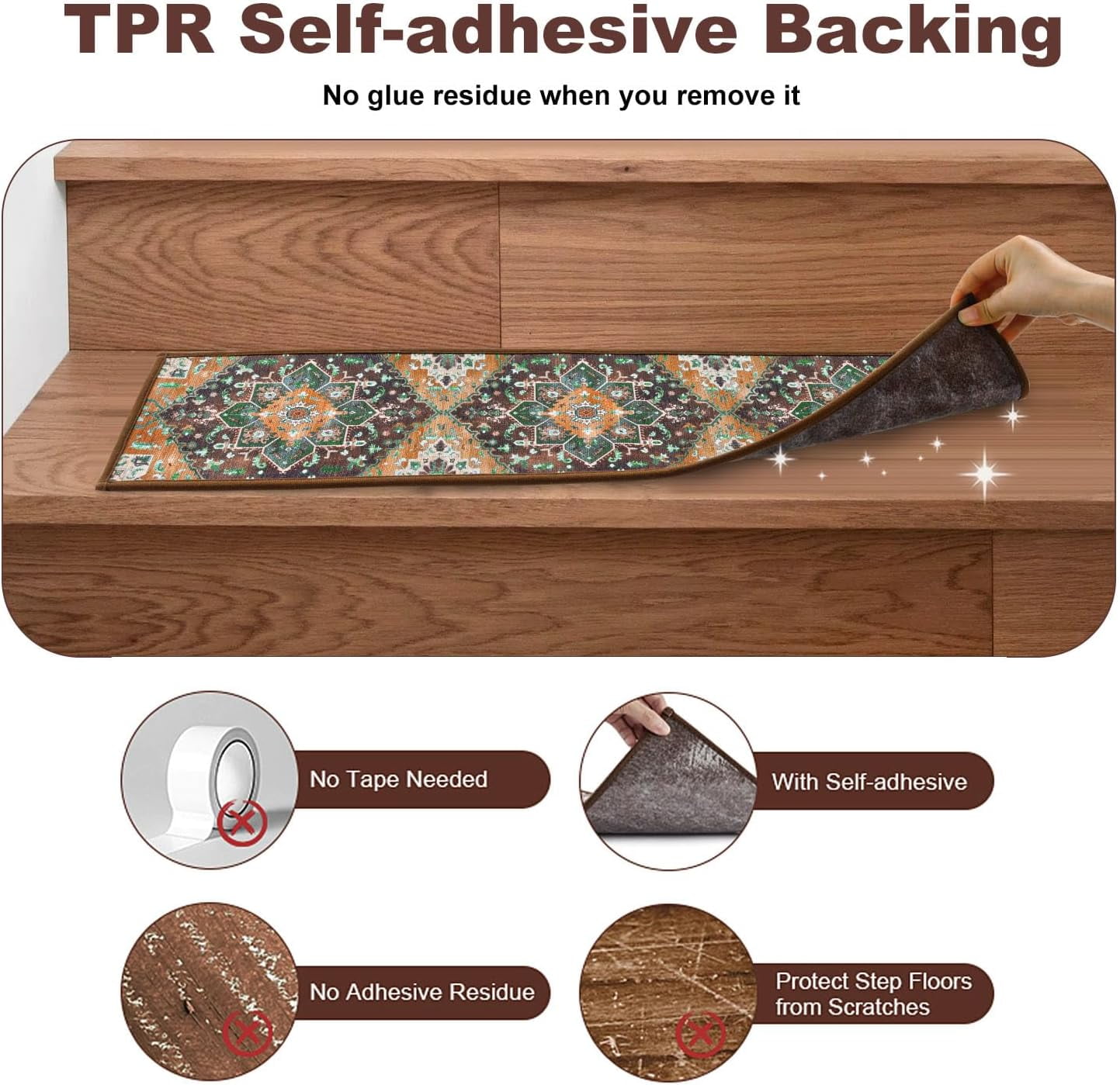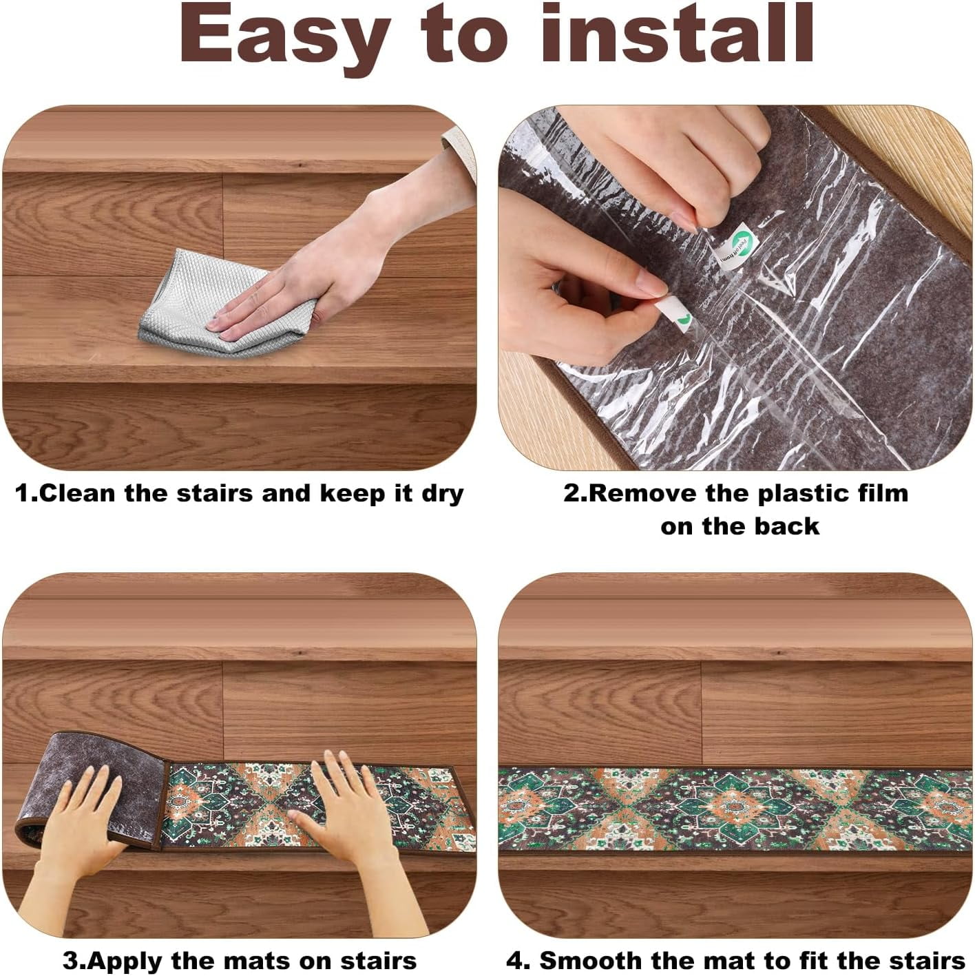 MJIAexp 8×30 inch non slip adhesive step treads pads tape use premium soft felt material with a thickness of 0.25in The surface of the stair rugs is made of high-density polyester blend fabric, will make you feel soft and comfortable on bare feet MJIAexp treads can be installed in 5 minutes without any glue, tapes or nails The stair runners is suitable for various smooth surfaces, you can stick this anti slip traction tape on hardwood, laminate, marble, tiles, glass The Step treads are durable and stain-resistant. You can easily clean the stair tread carpet with a vacuum cleaner, carpet soap and brush
